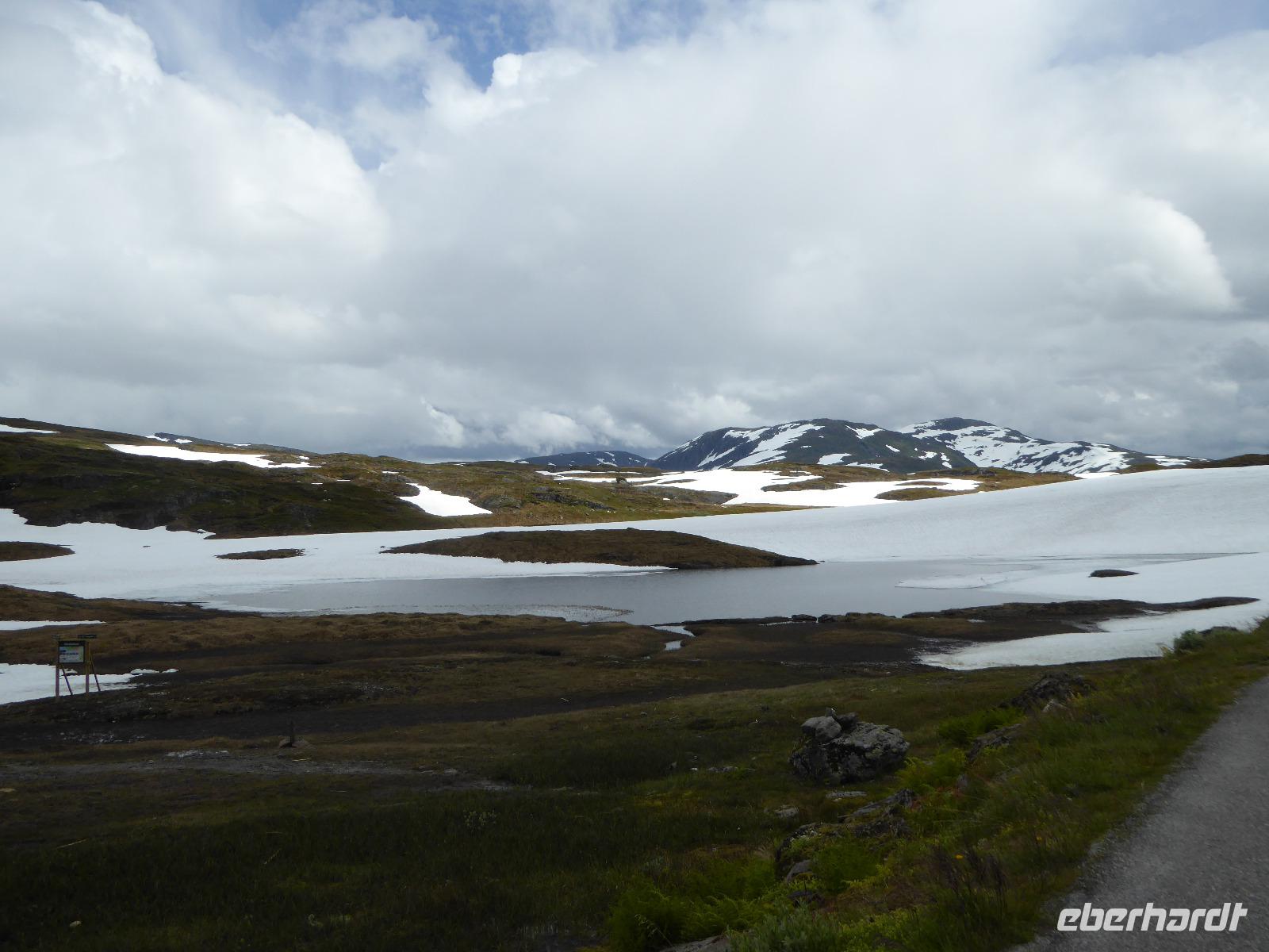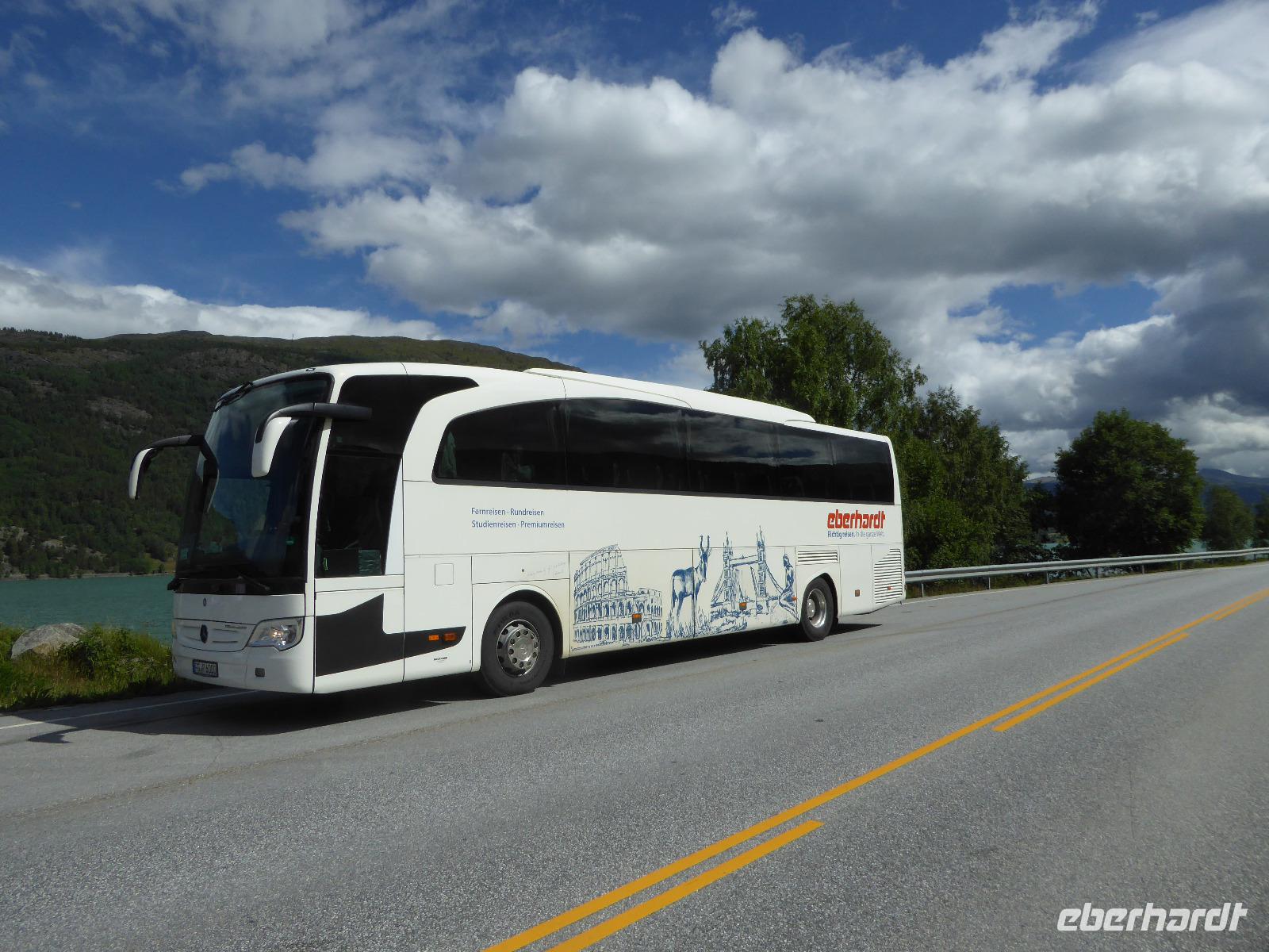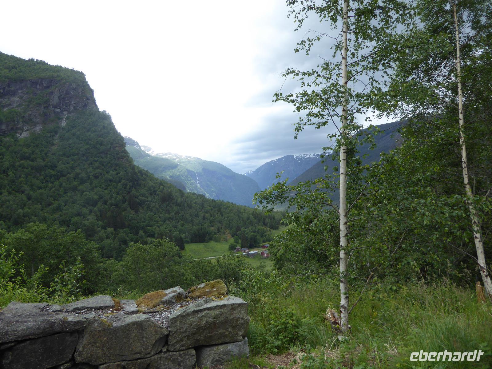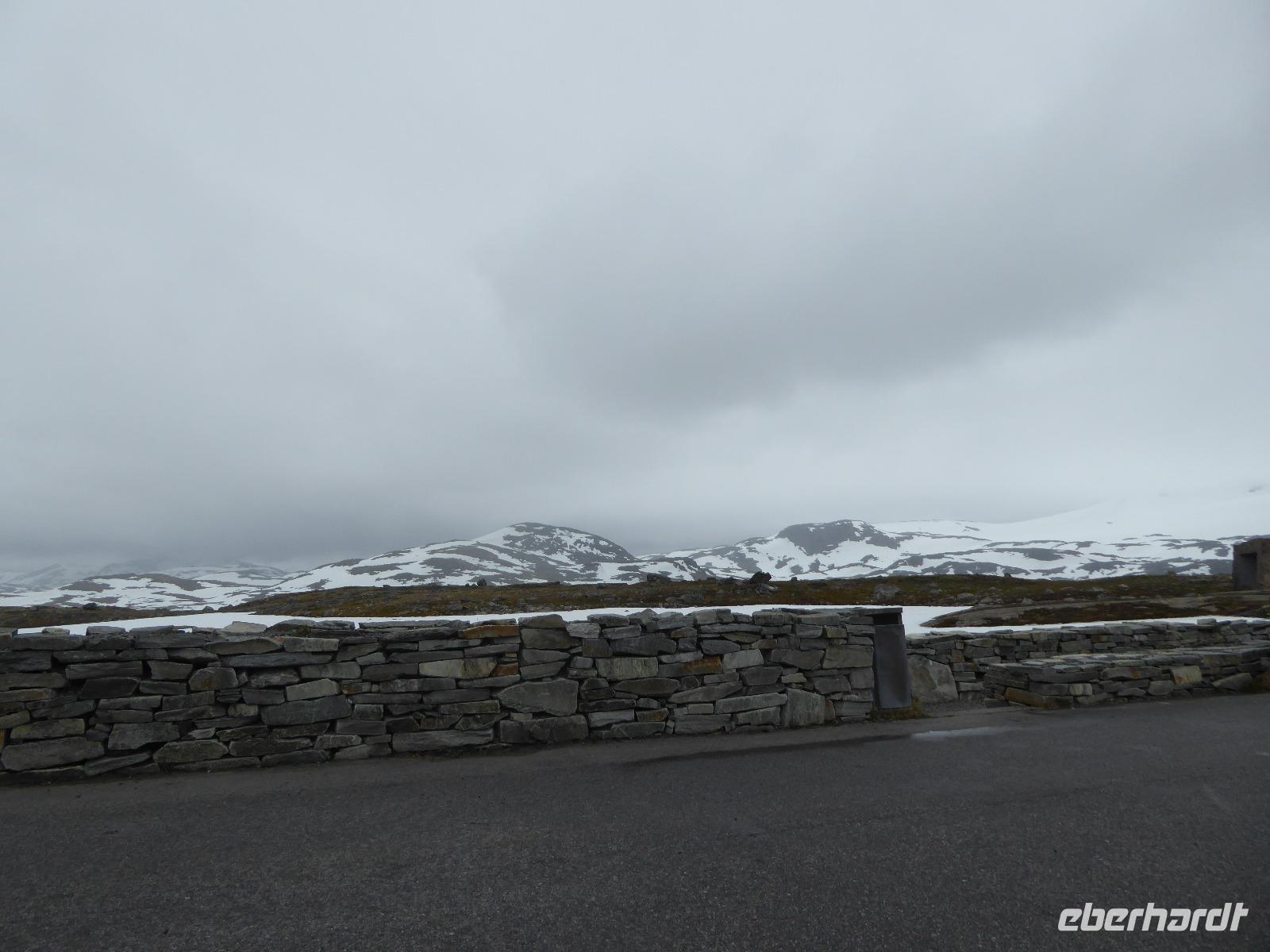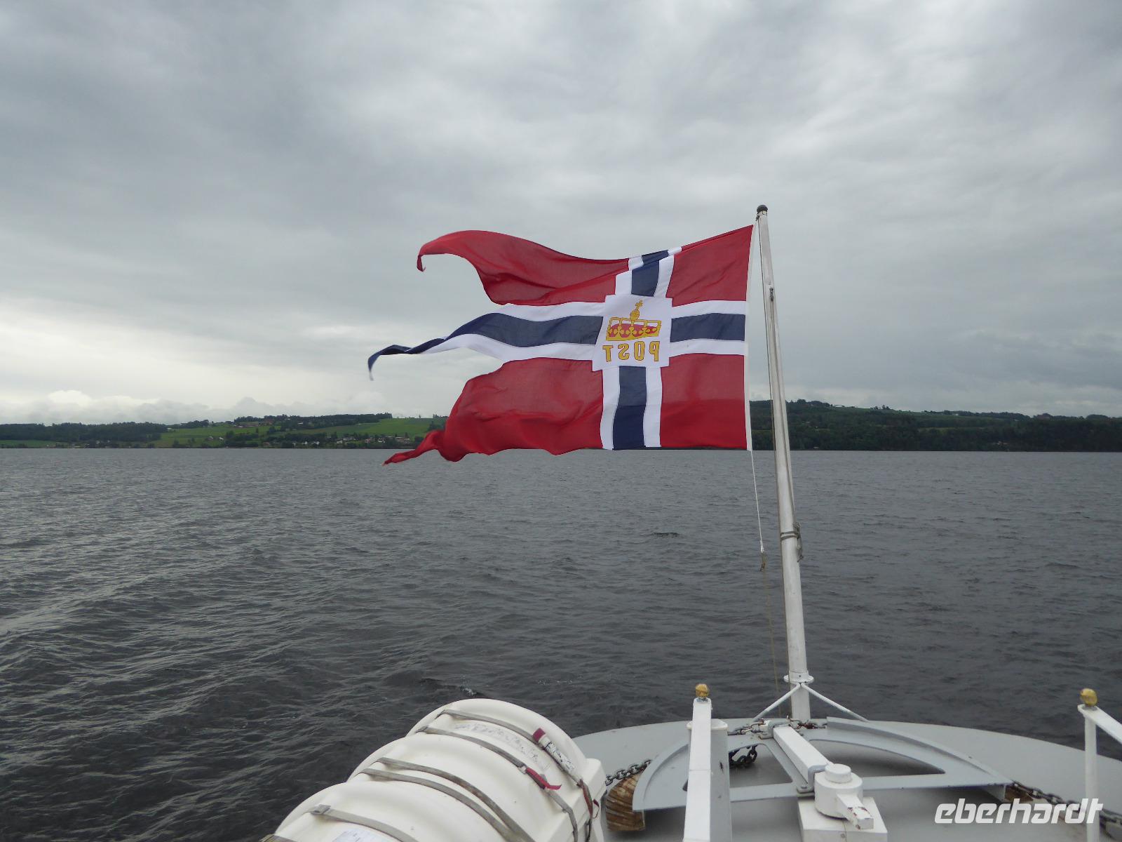 Zweihundertdreißig Kilometer lang ist das Gudbrandsdal, das wir heute durchfahren. Wir starten in Oyer, nördlich von Lillehammer, wo wir übernachtet haben. Traumhaft ist die Landschaft, die das Gudbrandsdal prägt. Im satten Grün leuchten die Hänge, azurblau leuchtet der Fluss, wenn er nicht gerade vor Freude überschäumt. An einigen Stellen bilden sich reißende Strudel. Bald schon haben wir Ringebu erreicht. Eine einheimische Reiseleiterin berichtete uns, dass sich die Kirche in Restaurierung befindet und nicht zu besuchen ist. Trotzdem biegen wir auf den schmalen aufwärts führenden Weg ab, um uns mit eigenen Augen zu überzeugen, dass dem so ist. Und siehe da - die Kirche ist gar nicht abgehängt. Dennoch können wir sie nur von außen besichtigen, da sie wegen einer Amtshandlung geschlossen ist. Just in dem Augenblick, als wir kommen, wird dieses Hinweisschild aufgehängt („Wegen Amtshandlung geschlossen"). Wir vermuten, dass es sich um eine Beerdigung handelt, da ein schwarzer PKW mit einem weißen Kreuz auf dem Dach in das Kirchengelände fuhr. Respektvoll ziehen wir uns zurück. Weiter geht unsere Fahrt durch das romantische Gudbrandsdal. Bei Vinstra wird das Tal enger, die Berge scheinen über unseren Köpfen zusammen zu stoßen. Kein Wunder, dass hier die Geschichte von Peer Gynt entstanden ist. In Otta verlassen wir die E6 und fahren Richtung Südwesten weiter auf der Straße 55. Diese schlängelt sich auf das Sognefjell. Die Aussicht wird immer spektakulärer. Wo es sich anbietet, halten wir zu ausgiebigen Fotostopps. Mittags kommen wir in Lom an. Hier ist eine achthundert Jahre alte Stabkirche zu bewundern. Wir nehmen uns genügend Zeit für jede Menge Fotos. Vor der Kirche ist ein Rasensprenger an. Es macht Spaß, dabei zuzuschauen, wie Touris aller Welt versuchen, das beste Foto zu machen und alles rund um sich ausblenden. Bis der Rasensprenger sie erwischt.(Ach ja, Schadenfreude schönste Freude - ist ja nicht böse gemeint, war nur Wasser und warm wars auch ). Ein paar Kilometer weiter, in Eleveseter, am gleichnamigen Hotel, befindet sich eine 33 Meter hohe Säule - die Sagasäule, die einen Querschnitt der norwegischen Geschichte darstellt und die selbst eine sagenumwobene Geschichte umgibt. Leider ist das Parken hier so ungünstig, dass wir nicht genügend Zeit haben, die Säule in aller Ruhe zu studieren. Wir müssen schnell wieder in den Bus schlüpfen, denn der steht definitiv im Weg. Wir fahren weiter über das Sognefjell, immer höher hinauf. Bald schon sind wir über der Baumgrenze und fahren durch eine schneebedeckte hochalpine Landschaft. Am späten Nachmittag erreichen wir Leikanger, unser heutiges Ziel.