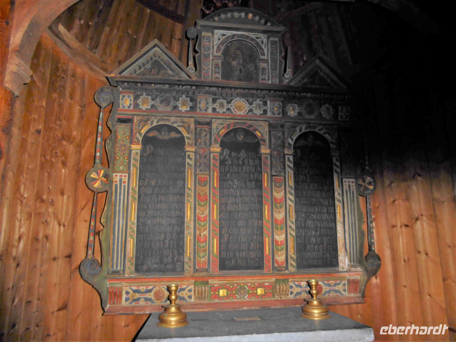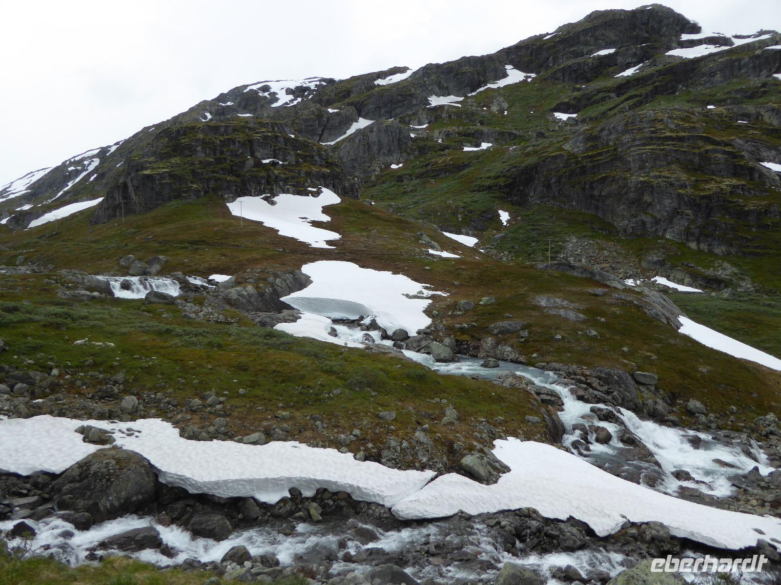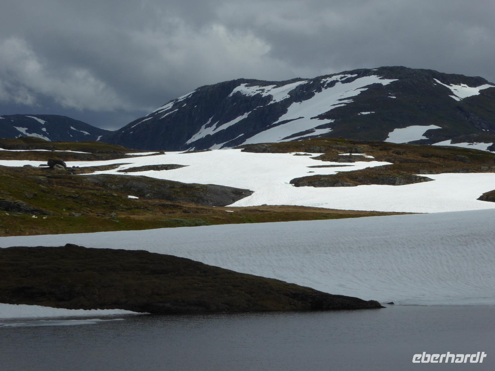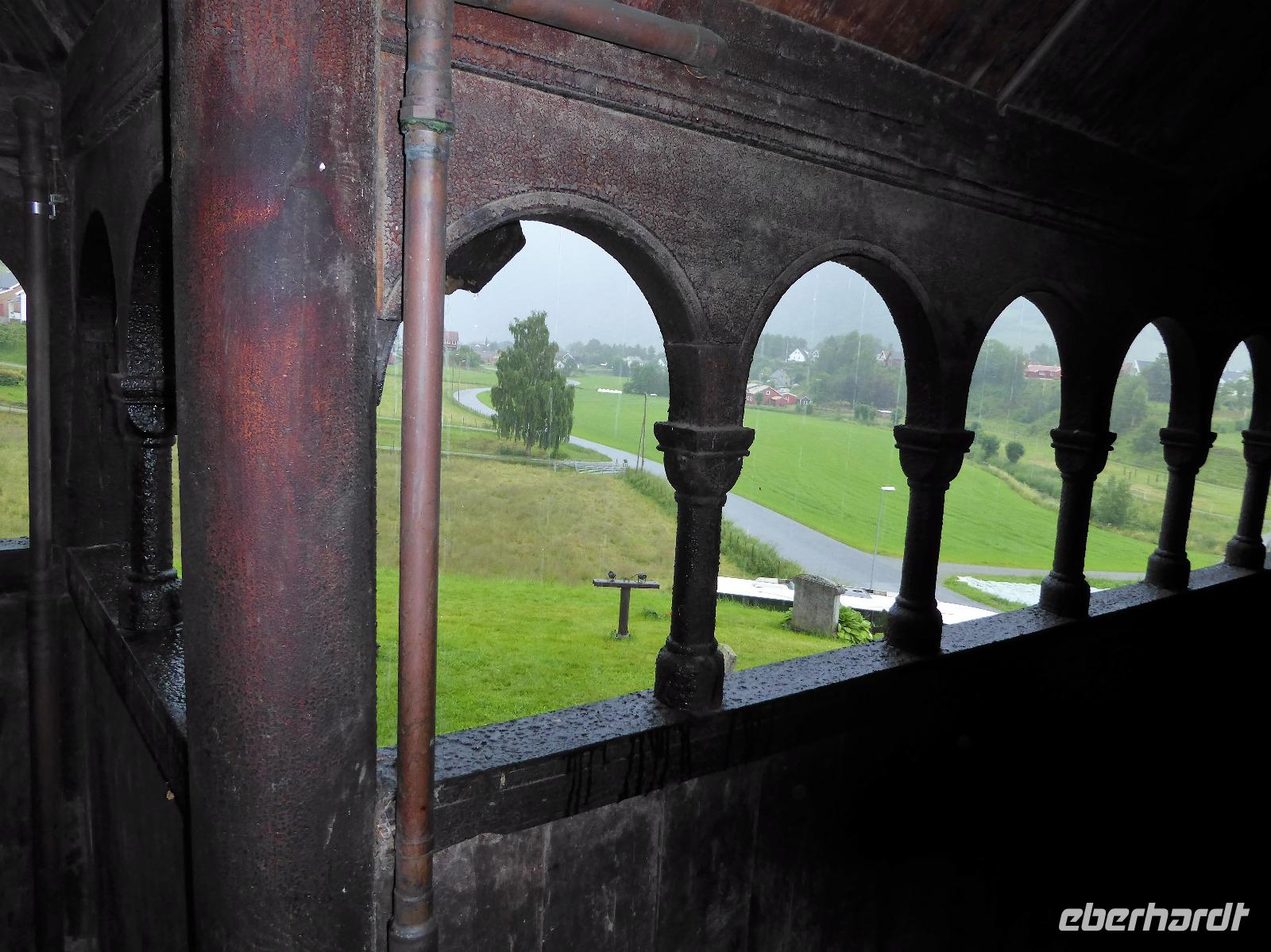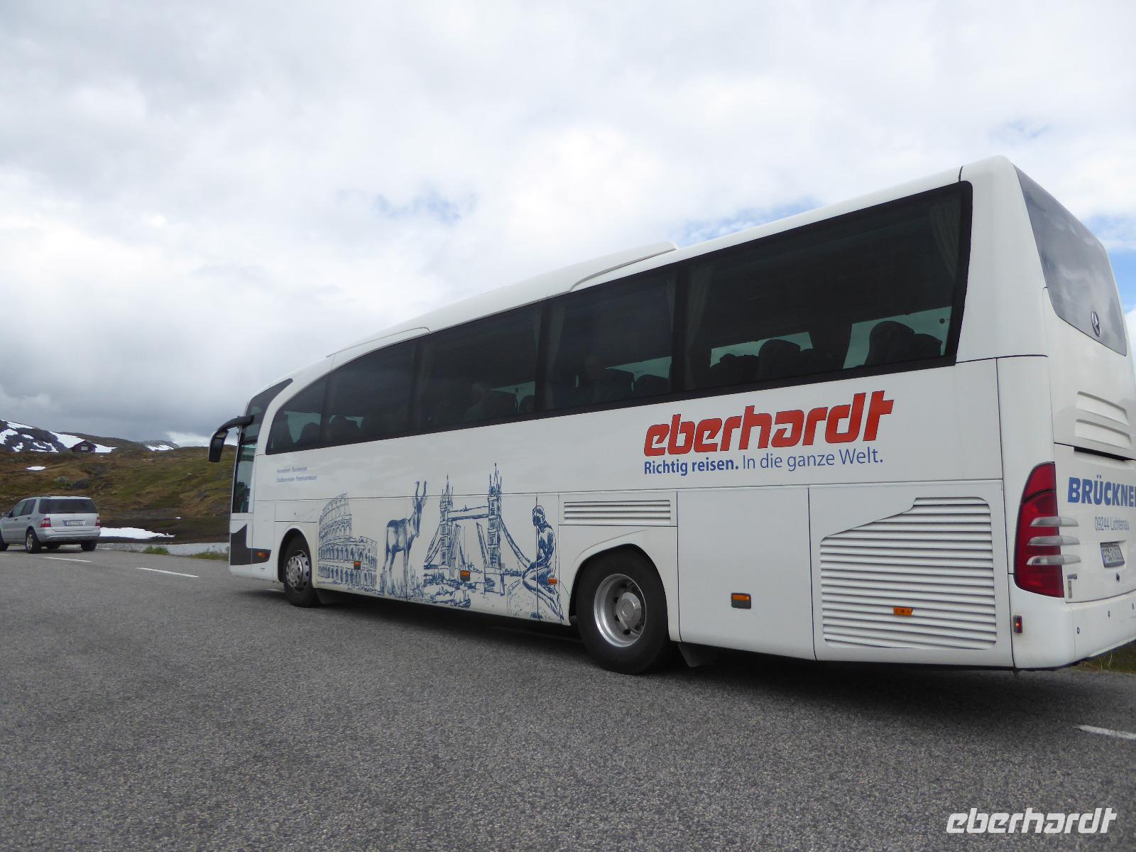 Zweihundertdreißig Kilometer lang ist das Gudbrandsdal, das wir heute durchfahren. Wir starten in Oyer, nördlich von Lillehammer, wo wir übernachtet haben. Traumhaft ist die Landschaft, die das Gudbrandsdal prägt. Im satten Grün leuchten die Hänge, azurblau leuchtet der Fluss, wenn er nicht gerade vor Freude überschäumt. An einigen Stellen bilden sich reißende Strudel. Bald schon haben wir Ringebu erreicht. Eine einheimische Reiseleiterin berichtete uns, dass sich die Kirche in Restaurierung befindet und nicht zu besuchen ist. Trotzdem biegen wir auf den schmalen aufwärts führenden Weg ab, um uns mit eigenen Augen zu überzeugen, dass dem so ist. Und siehe da - die Kirche ist gar nicht abgehängt. Dennoch können wir sie nur von außen besichtigen, da sie wegen einer Amtshandlung geschlossen ist. Just in dem Augenblick, als wir kommen, wird dieses Hinweisschild aufgehängt („Wegen Amtshandlung geschlossen"). Wir vermuten, dass es sich um eine Beerdigung handelt, da ein schwarzer PKW mit einem weißen Kreuz auf dem Dach in das Kirchengelände fuhr. Respektvoll ziehen wir uns zurück. Weiter geht unsere Fahrt durch das romantische Gudbrandsdal. Bei Vinstra wird das Tal enger, die Berge scheinen über unseren Köpfen zusammen zu stoßen. Kein Wunder, dass hier die Geschichte von Peer Gynt entstanden ist. In Otta verlassen wir die E6 und fahren Richtung Südwesten weiter auf der Straße 55. Diese schlängelt sich auf das Sognefjell. Die Aussicht wird immer spektakulärer. Wo es sich anbietet, halten wir zu ausgiebigen Fotostopps. Mittags kommen wir in Lom an. Hier ist eine achthundert Jahre alte Stabkirche zu bewundern. Wir nehmen uns genügend Zeit für jede Menge Fotos. Vor der Kirche ist ein Rasensprenger an. Es macht Spaß, dabei zuzuschauen, wie Touris aller Welt versuchen, das beste Foto zu machen und alles rund um sich ausblenden. Bis der Rasensprenger sie erwischt.(Ach ja, Schadenfreude schönste Freude - ist ja nicht böse gemeint, war nur Wasser und warm wars auch ). Ein paar Kilometer weiter, in Eleveseter, am gleichnamigen Hotel, befindet sich eine 33 Meter hohe Säule - die Sagasäule, die einen Querschnitt der norwegischen Geschichte darstellt und die selbst eine sagenumwobene Geschichte umgibt. Leider ist das Parken hier so ungünstig, dass wir nicht genügend Zeit haben, die Säule in aller Ruhe zu studieren. Wir müssen schnell wieder in den Bus schlüpfen, denn der steht definitiv im Weg. Wir fahren weiter über das Sognefjell, immer höher hinauf. Bald schon sind wir über der Baumgrenze und fahren durch eine schneebedeckte hochalpine Landschaft. Am späten Nachmittag erreichen wir Leikanger, unser heutiges Ziel.