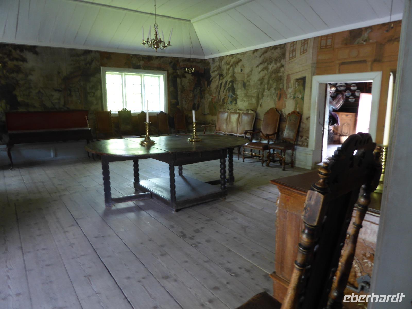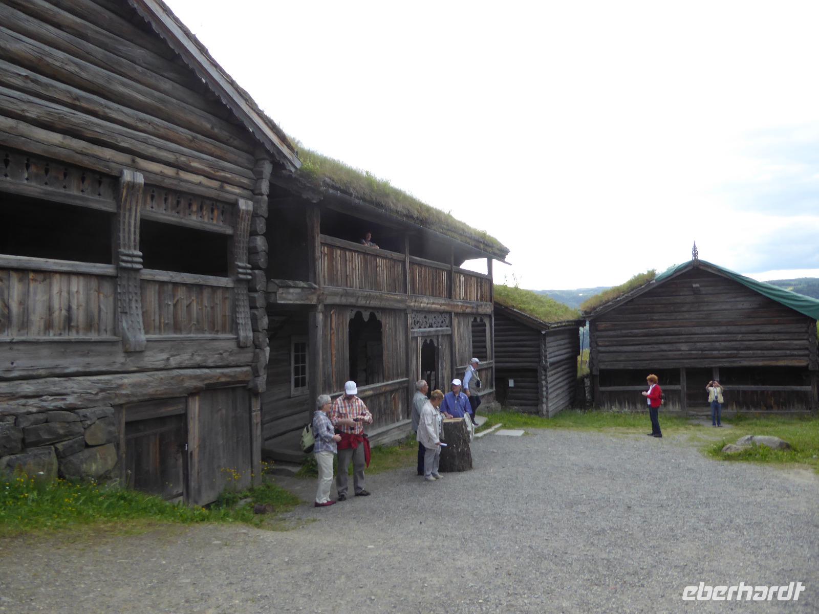 Wir reisen entschleunigt. Deshalb können wir ausschlafen und in aller Ruhe das Frühstücksbuffet plündern. Schon wieder Lachs und Kaviar! Erst 9.30 Uhr wollen wir starten. Da die Parkplätze vor dem Hotel rar sind, machen wir schon eine viertel Stunde vorher Platz. Fünf Minuten vor der Zeit - ist des Deutschen Pünktlichkeit, nicht wahr? So auch bei uns. Wir fahren nach Jevnaker. Dort besuchen wir das Hadeland Glaswerk. Nachdem wir endlich den Eingang zum Museum gefunden haben, führt uns Simon in die Fabrik. Wir sind live dabei, als eine Vase von drei Männern hergestellt wird. Ist das produktiv? Nein. Es ist Handarbeit. Für die Weingläser brauchen sie sogar zwölf bis dreizehn Leute. Wer soll denn das bezahlen? Die Preise in den Shops, die wir anschließend besuchen, zeigen, was Handarbeit kostet. Na sag mal, aus diesen Gläsern kann man doch auch nur trinken, oder? Nun, interessant war es allemal, so ein Werk zu besuchen. Wir fahren weiter nach Lillehammer. Unterwegs beschäftigen wir uns mit 12.000 Jahren norwegischer Geschichte. Mord und Totschlag waren viele hundert Jahre an der Tagesordnung. In Maihaugen besichtigen wir alte Bauernhäuser, die ein Zahnarzt zusammengetragen hat, um sie vor dem Verfall zu bewahren. Die Sonne scheint, der Himmel ist blau, das Gras grün. Hier könnten wir stundenlang verweilen. Jedoch wartet man im Hotel auf uns. Und ich sage Euch: zum Glück haben wir nicht gebummelt, denn kaum ward Ihr auf Euern Zimmern, kamen zwei riesige Busgruppen an, im Foyer ging gar nichts mehr. Zum Abendessen hatte sich der Spuk aufgelöst. Ein schmackhaftes Buffet wartet auf hungrige Mäuler. Und Pepes Schwester ist immer noch nicht geboren.