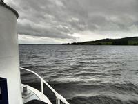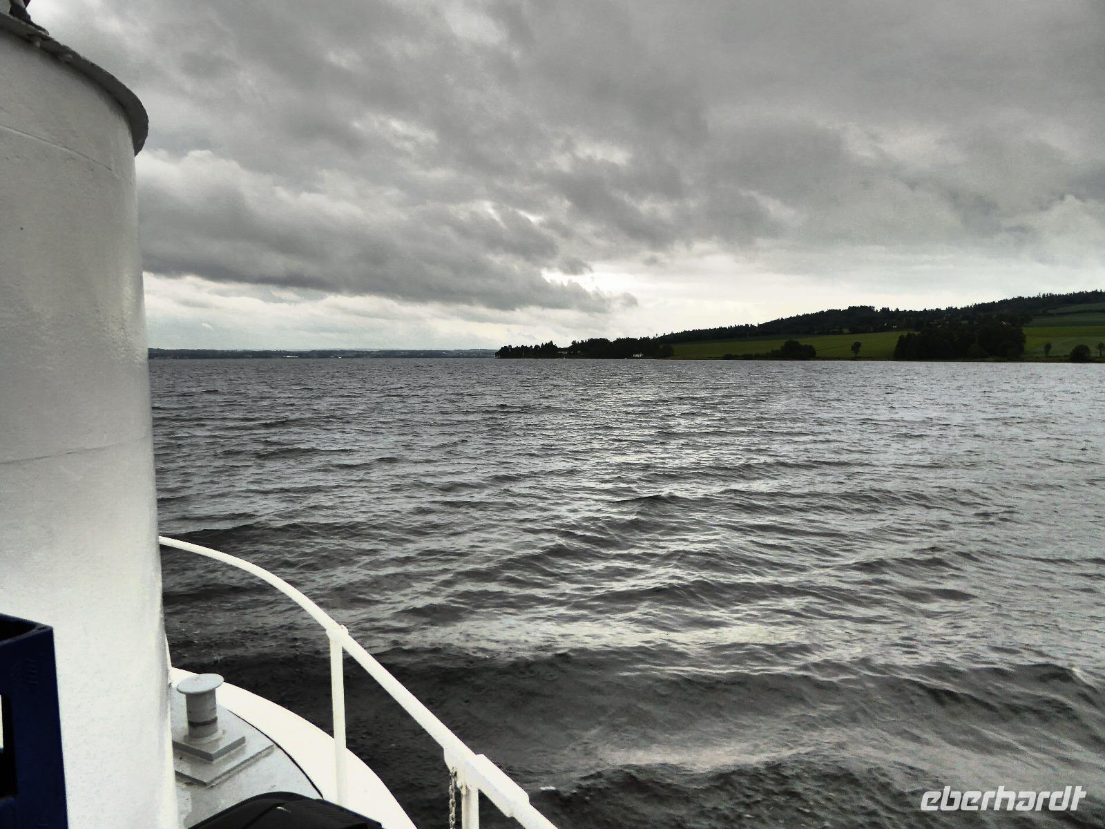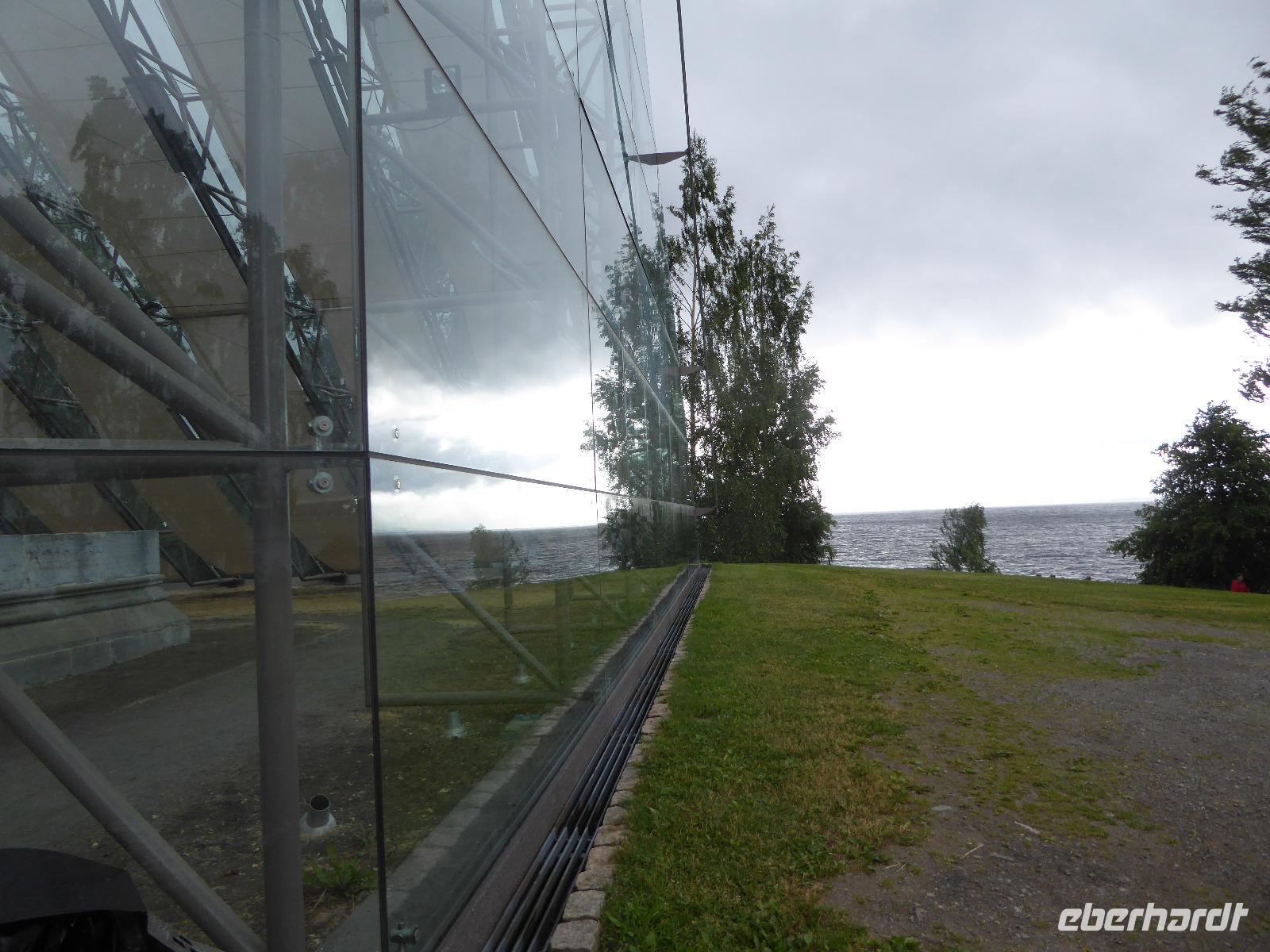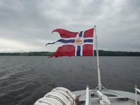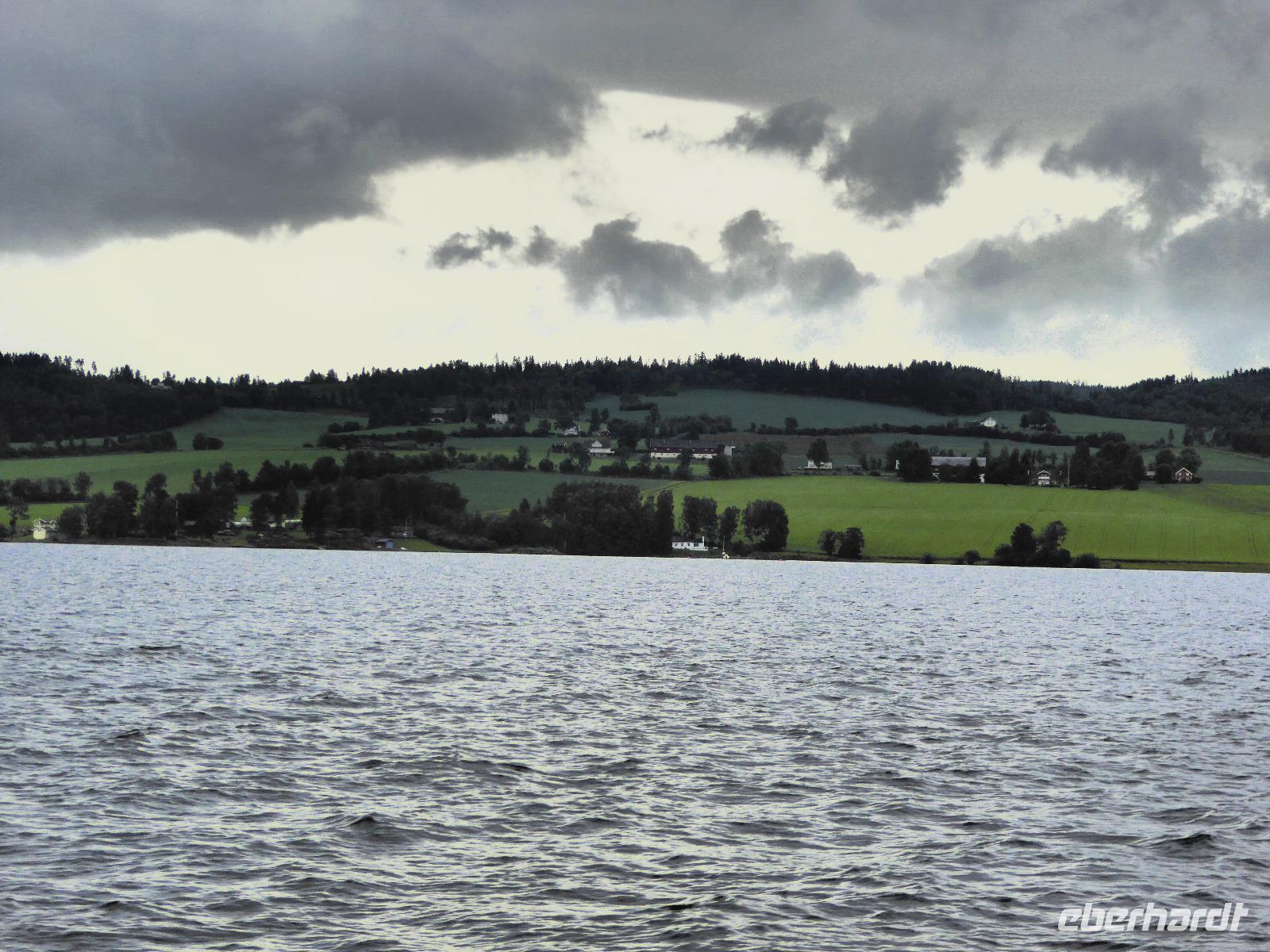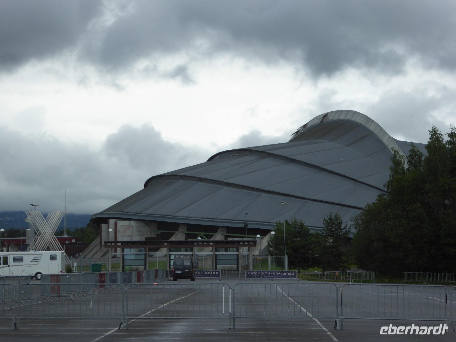 Wir starten bereits um 8. Das Wetter ist uns heute gar nicht hold. Es regnet wie verrückt. Und wir wollen auf dem Mjosasee Schiff-Fahren. Nach einer Stunde kommen wir in Gjovik an. Es regnet nicht mehr - zum Glück, denn unser Schiff, der Skibladner, wird noch aufgetankt und so lange dürfen keine Gäste an Bord. Also müssen wir uns eine halbe Stunde die Füße vertreten, denn erst 9.30 Uhr betreten wir das Schiff. An „Draußen-sitzen" ist nicht zu denken. Es ist zwar nicht kalt, aber ungemütlich. Also nehmen wir im unteren Bereich Platz. Nach einer Weile haben wir uns eingerichtet und schaffen es, die knapp eineinhalb Stunden Fahrt auf dem Mjosasee zu genießen. Mit ein bisschen mehr Sonne könnte es glatt romantisch sein, die Umgebung ist traumhaft. Gegen elf kommen wir in Hamar an, verabschieden uns von unserem Kapitän und der freundlichen Guide. Lutz ist mit dem Bus schon da. Es regnet. Wir fahren zum Hedmark Museum, hier werden wir um zwölf zu einer Führung erwartet. Wir sind zu früh. Also lassen wir uns erstmal die Würstchen schmecken. Die anschließende Führung ist auf Englisch. Gemeinsam können wir uns alles erschließen. Spannende Geschichte vom weintrinkenden, tanzenden Bischof und der verfallenen Kathedrale. Was für eine Akustik diese hat, erlauschen wir bei den Gesängen unserer Gastgeber. Ganz in der Nähe befindet sich das Eisenbahn-Museum, das Einige besuchen möchten. Andere verbringen Zeit in Hamar. Auf dem Rückweg zum Hotel legen wir einen Fotostopp an der Eishalle ein, die wie ein umgekipptes Wikingerboot aussieht (links übrigens ). Auch an der Schanzenanlage in Lillehammer halten wir an. Das Wetter hat sich beruhigt und wir können schöne Fotos schießen. Kurz vor dem Abendessen sind wir im Hotel. Und schon wieder öffnet der Himmel seine Schleusen und es gießt aus allen Kannen. Das interessiert uns nicht mehr - wir schlemmern im Restaurant. Baby Milla ist immer noch nicht da.
