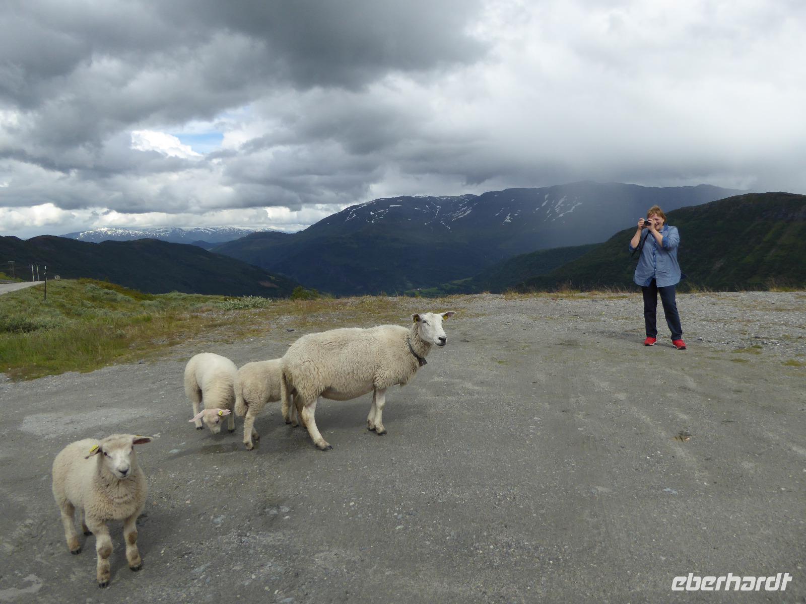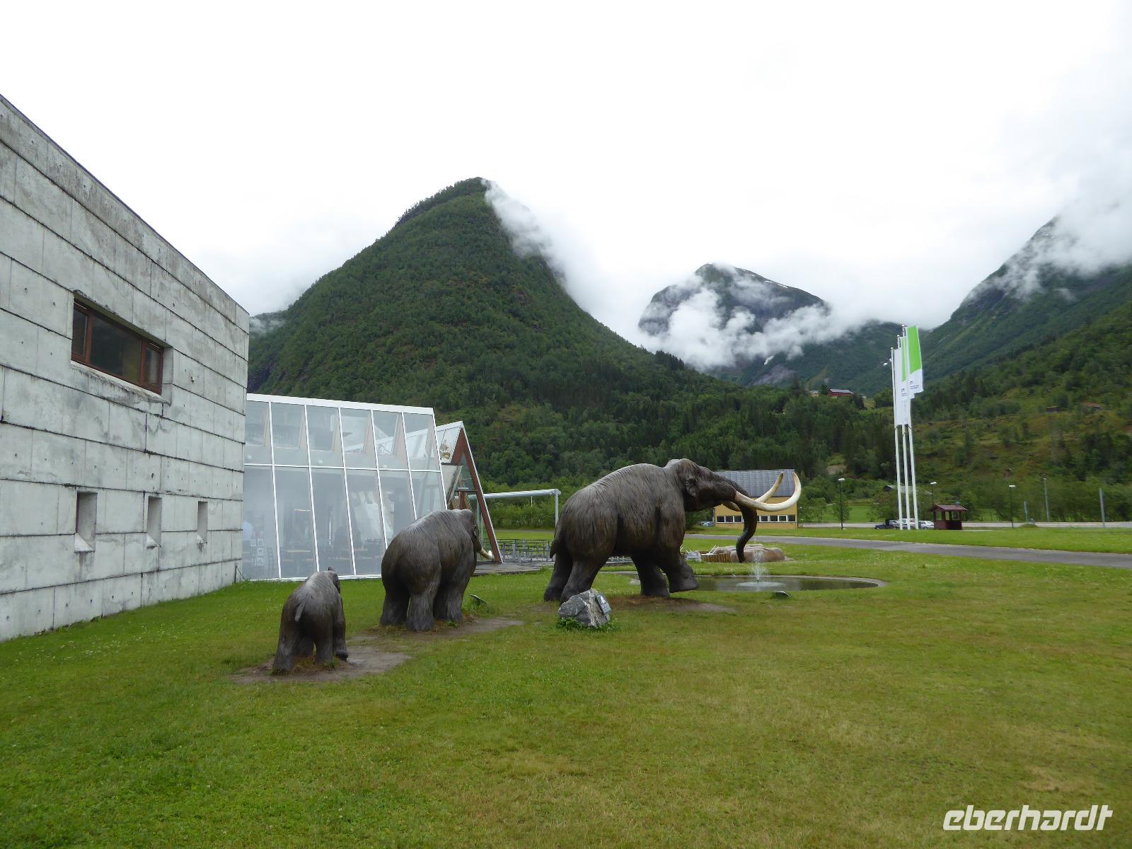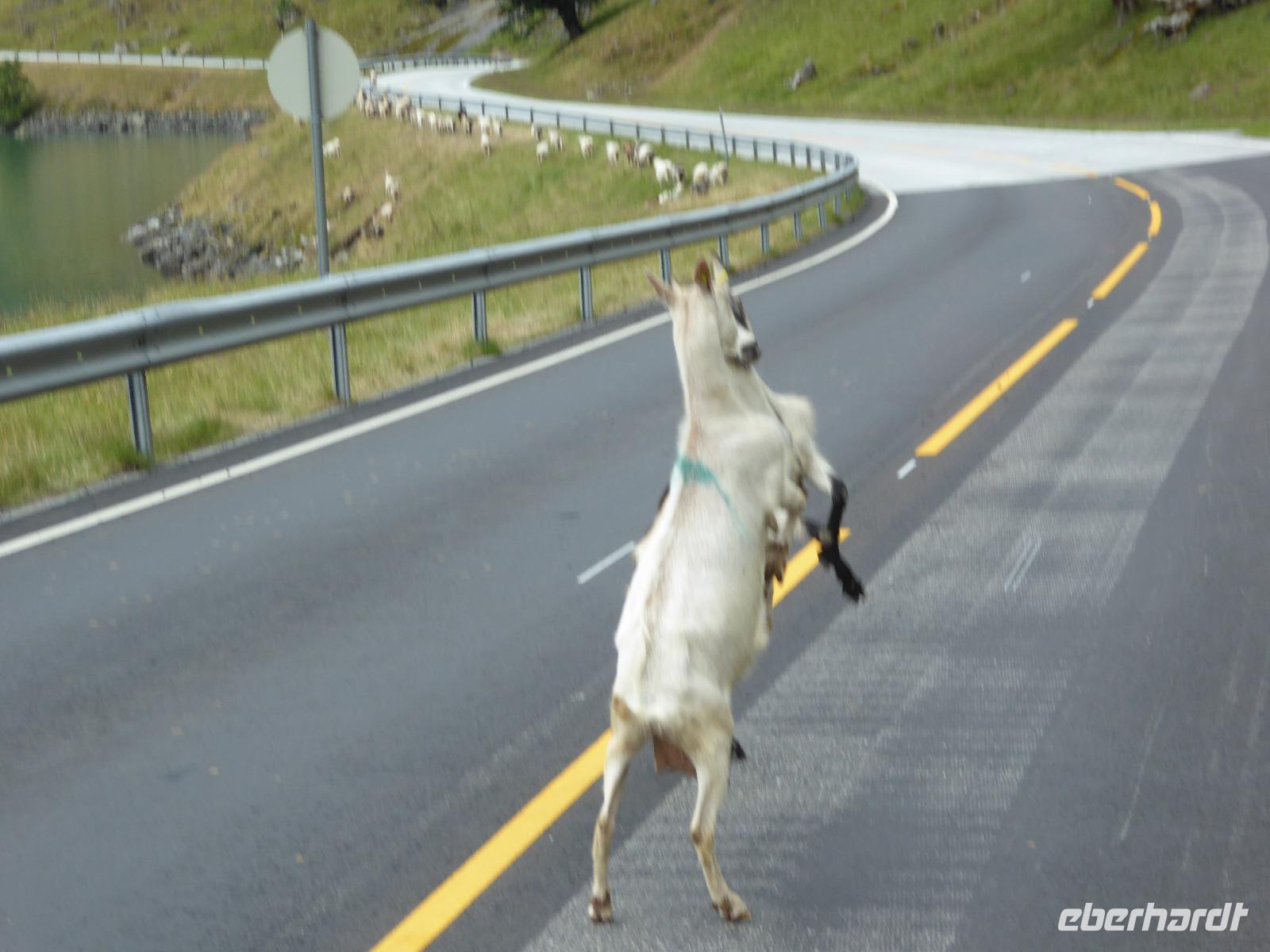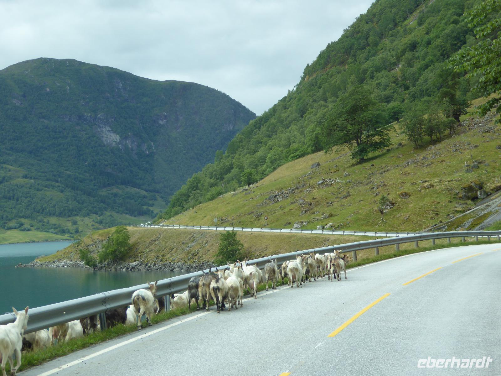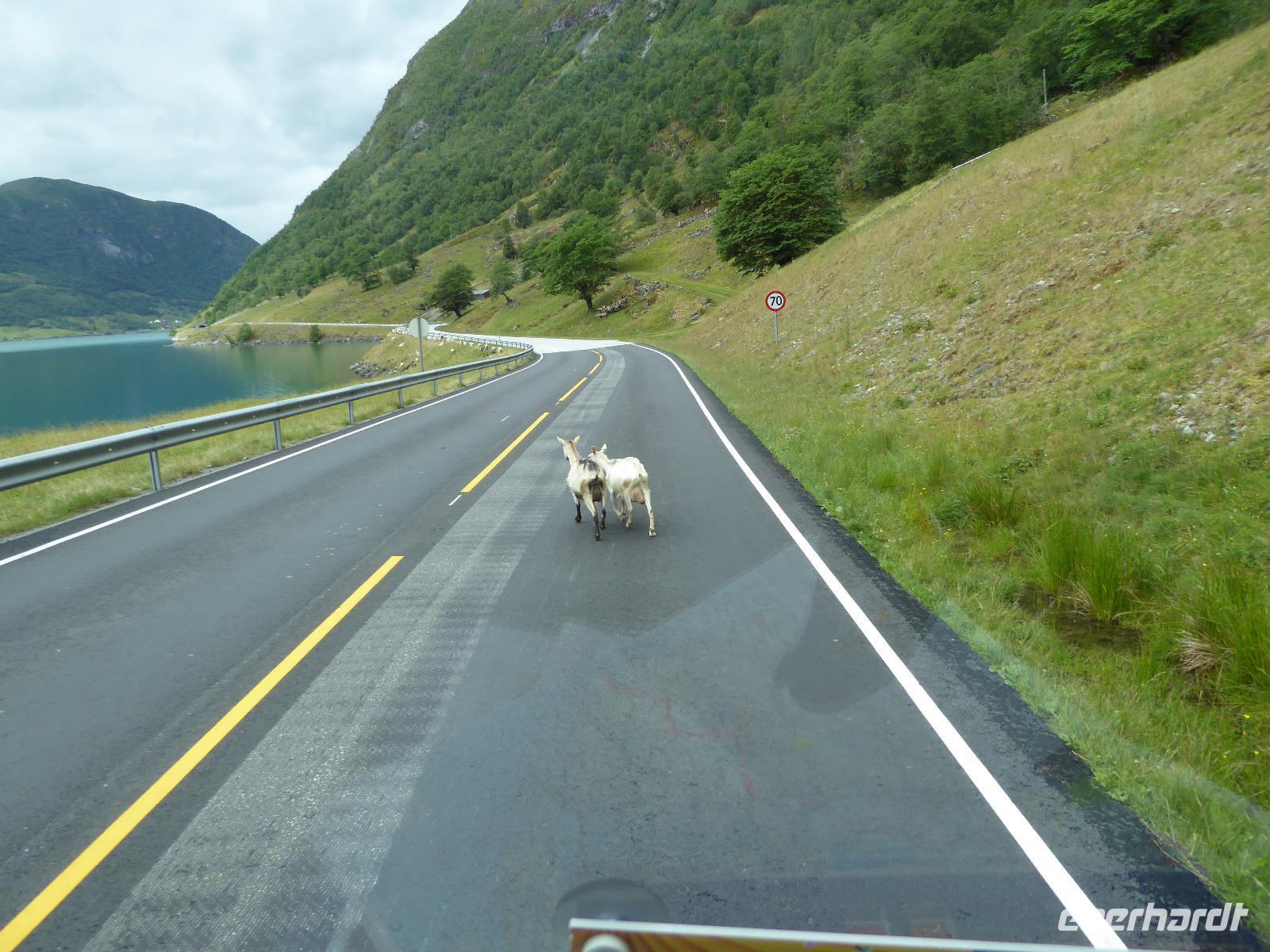 Gemütlich starten wir in den Tag, erst um neun fahren wir los. Am Vormittag besuchen wir das Gletschermuseum in Fjarland. Ein zwanzigminütiger Film lässt uns in die beeindruckende Welt der Gletscher eintauchen. Interaktiv führen Schautafeln durch das Museum und erklären anschaulich, warum das Eis blau und die Fjorde grün sind. Auch dem Gletschermann Ötzi sind ein paar Tafeln gewidmet. Am Ende der Ausstellung kann man durch einen nachgestalteten Gletscher laufen. Vorsicht! An einer Stelle ragt die Hand eines Toten aus dem Eis! Nach gut anderthalb Stunden haben wir alles angesehen und setzen unsere Fahrt fort. Es dauert nicht lange, bis wir den ersten Halt zum Fotografieren einlegen. Die Landschaft ist einfach zu verführerisch. Unterwegs treffen wir immer mal wieder auf Exemplare der einheimischen Tierwelt. Zwar sind es keine Elche, aber Ziegen und Schafe, die es sich auf der Straße gemütlich machen und unser Touristenherz erfreuen.