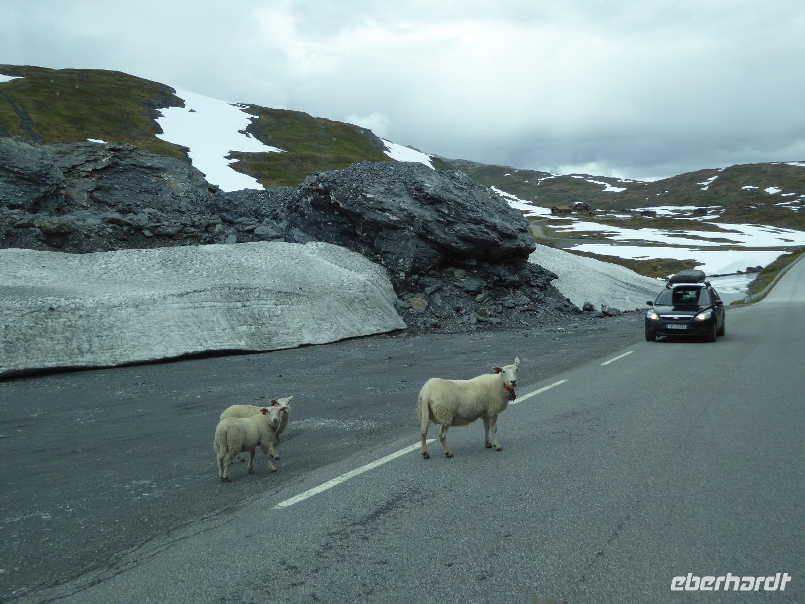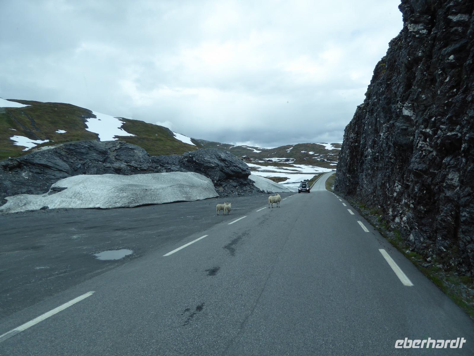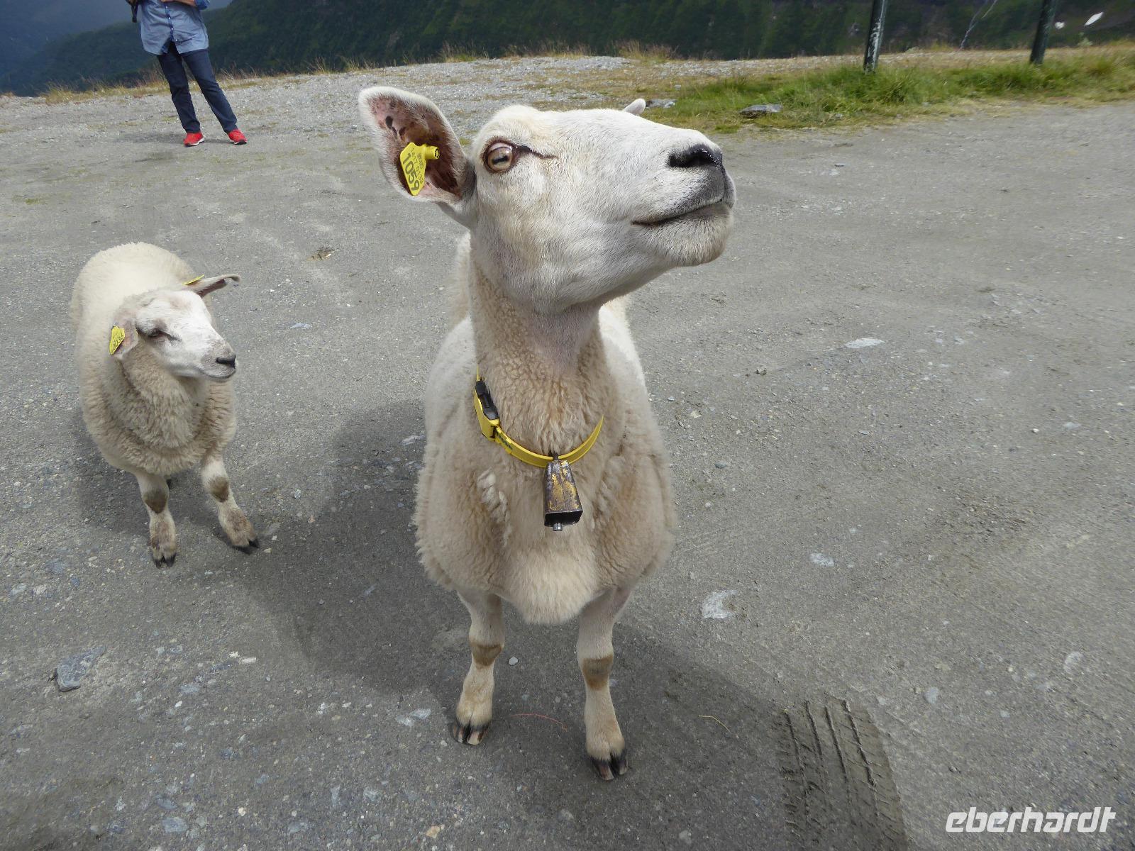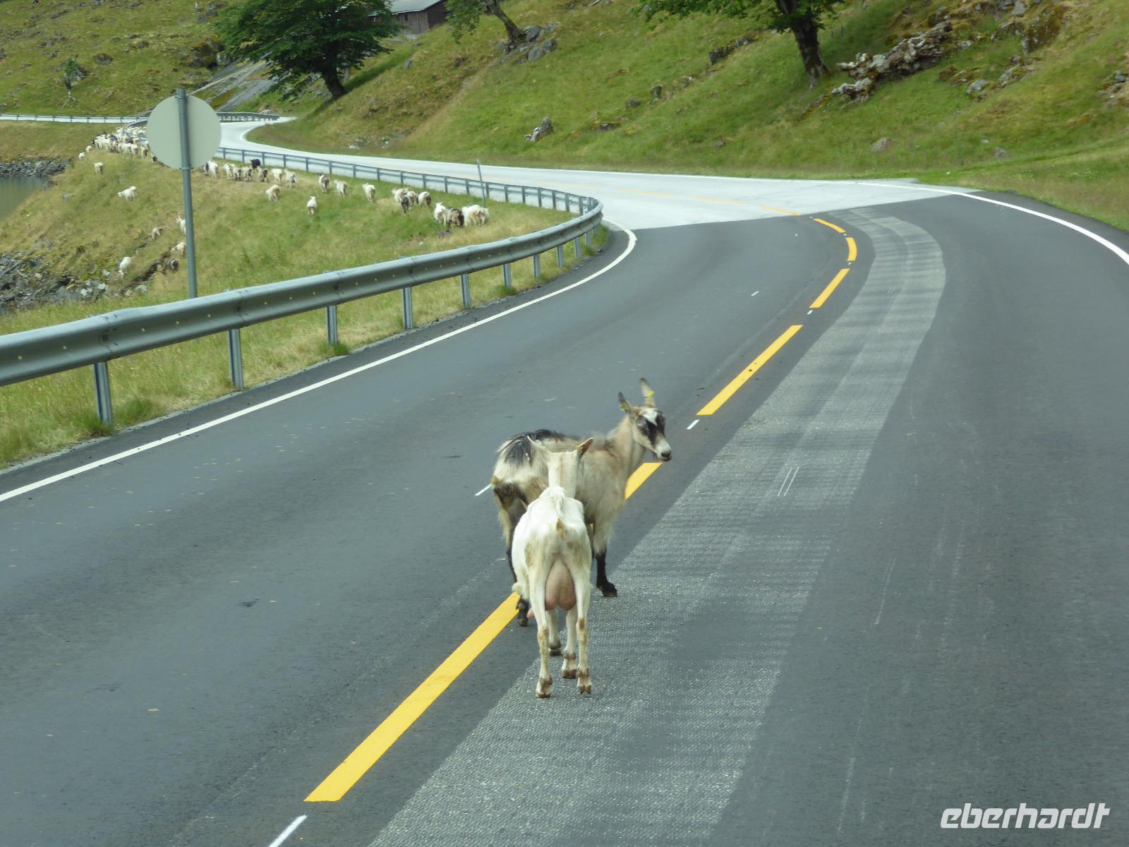 Gemütlich starten wir in den Tag, erst um neun fahren wir los. Am Vormittag besuchen wir das Gletschermuseum in Fjarland. Ein zwanzigminütiger Film lässt uns in die beeindruckende Welt der Gletscher eintauchen. Interaktiv führen Schautafeln durch das Museum und erklären anschaulich, warum das Eis blau und die Fjorde grün sind. Auch dem Gletschermann Ötzi sind ein paar Tafeln gewidmet. Am Ende der Ausstellung kann man durch einen nachgestalteten Gletscher laufen. Vorsicht! An einer Stelle ragt die Hand eines Toten aus dem Eis! Nach gut anderthalb Stunden haben wir alles angesehen und setzen unsere Fahrt fort. Es dauert nicht lange, bis wir den ersten Halt zum Fotografieren einlegen. Die Landschaft ist einfach zu verführerisch. Unterwegs treffen wir immer mal wieder auf Exemplare der einheimischen Tierwelt. Zwar sind es keine Elche, aber Ziegen und Schafe, die es sich auf der Straße gemütlich machen und unser Touristenherz erfreuen.