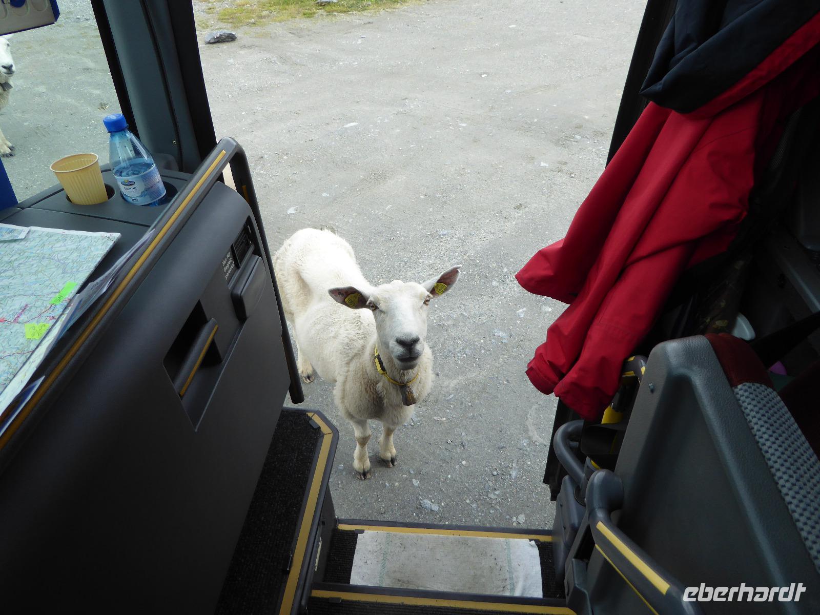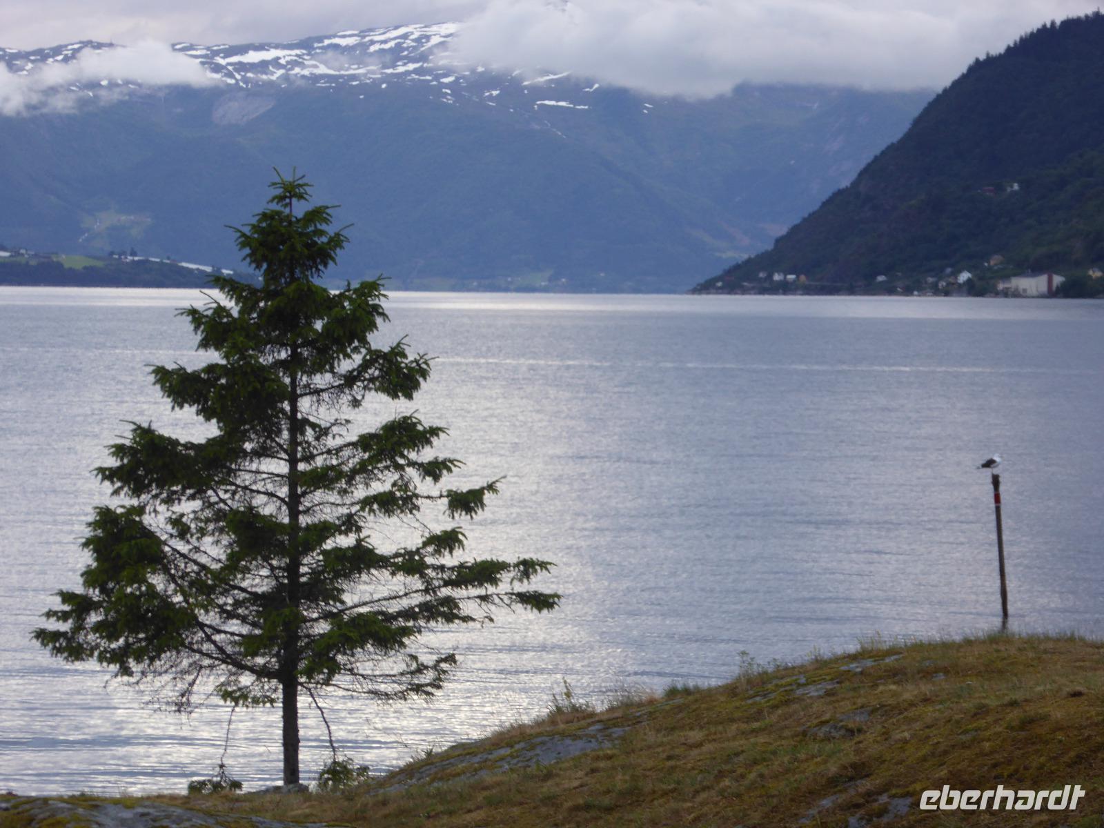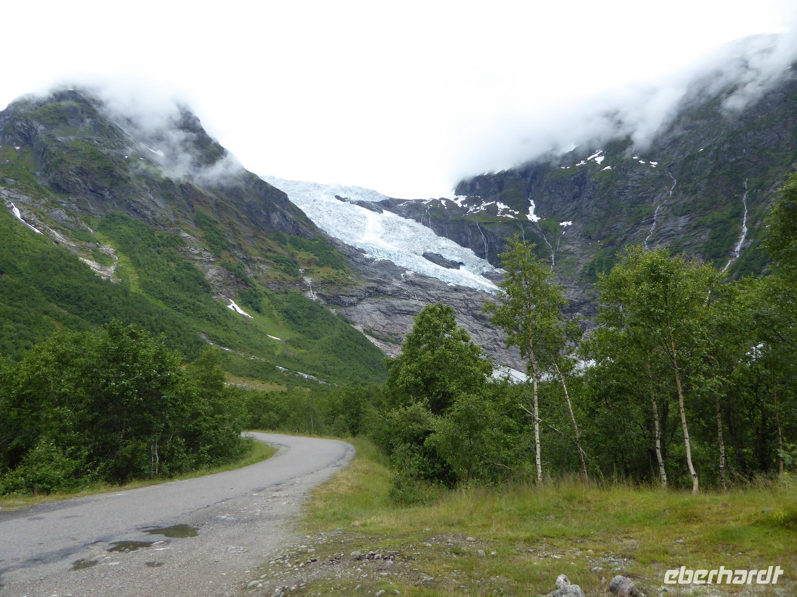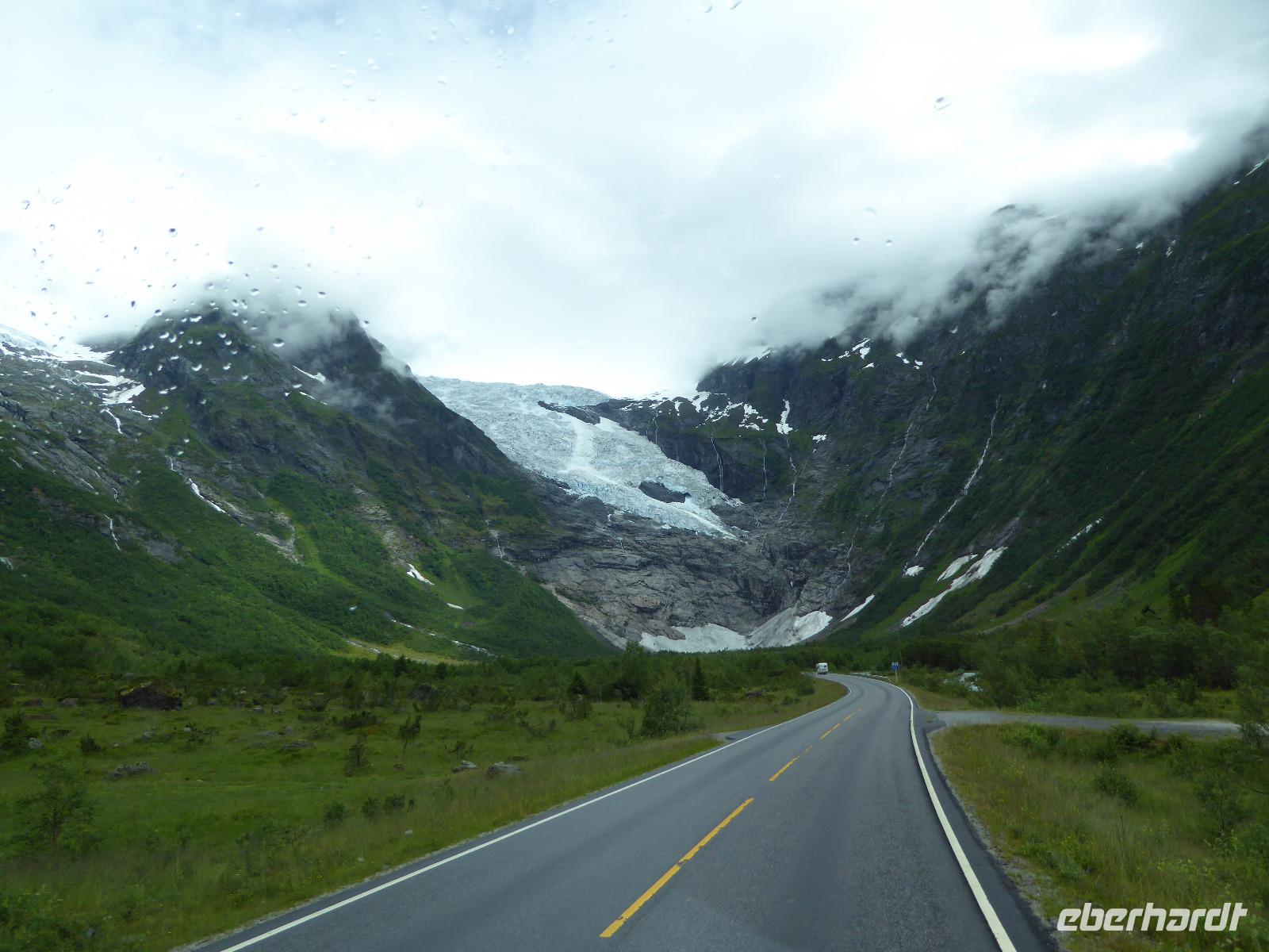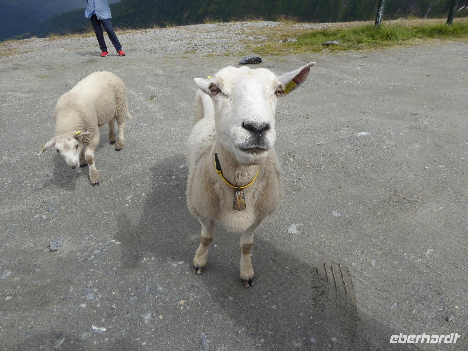 Gemütlich starten wir in den Tag, erst um neun fahren wir los. Am Vormittag besuchen wir das Gletschermuseum in Fjarland. Ein zwanzigminütiger Film lässt uns in die beeindruckende Welt der Gletscher eintauchen. Interaktiv führen Schautafeln durch das Museum und erklären anschaulich, warum das Eis blau und die Fjorde grün sind. Auch dem Gletschermann Ötzi sind ein paar Tafeln gewidmet. Am Ende der Ausstellung kann man durch einen nachgestalteten Gletscher laufen. Vorsicht! An einer Stelle ragt die Hand eines Toten aus dem Eis! Nach gut anderthalb Stunden haben wir alles angesehen und setzen unsere Fahrt fort. Es dauert nicht lange, bis wir den ersten Halt zum Fotografieren einlegen. Die Landschaft ist einfach zu verführerisch. Unterwegs treffen wir immer mal wieder auf Exemplare der einheimischen Tierwelt. Zwar sind es keine Elche, aber Ziegen und Schafe, die es sich auf der Straße gemütlich machen und unser Touristenherz erfreuen.