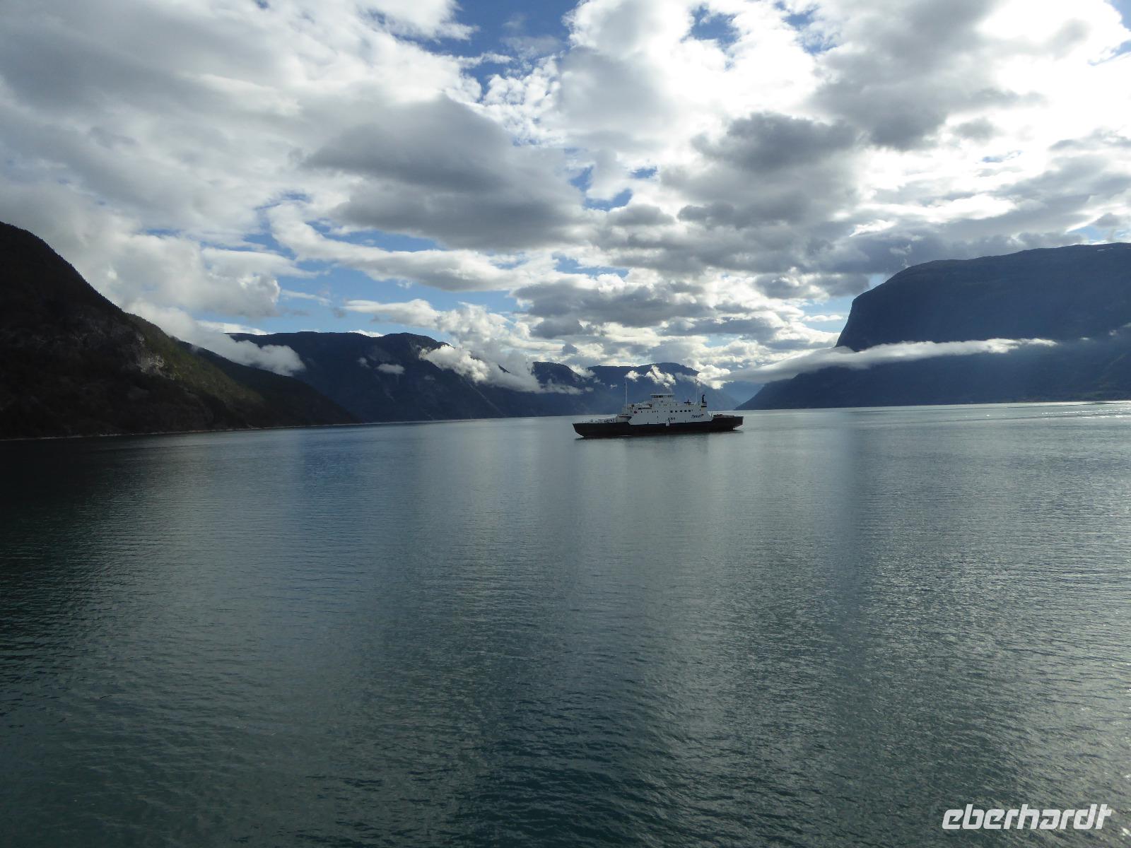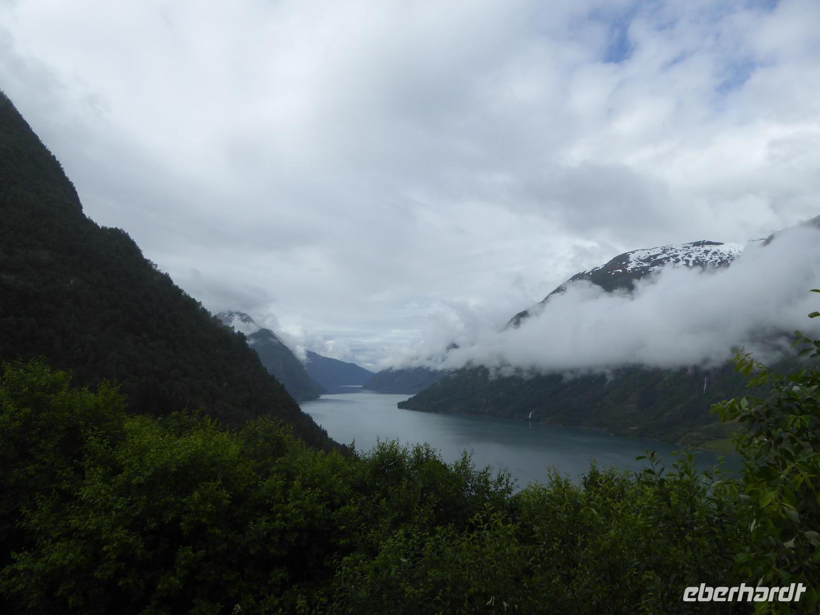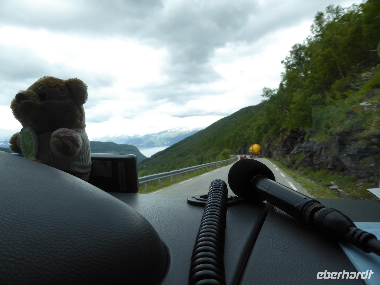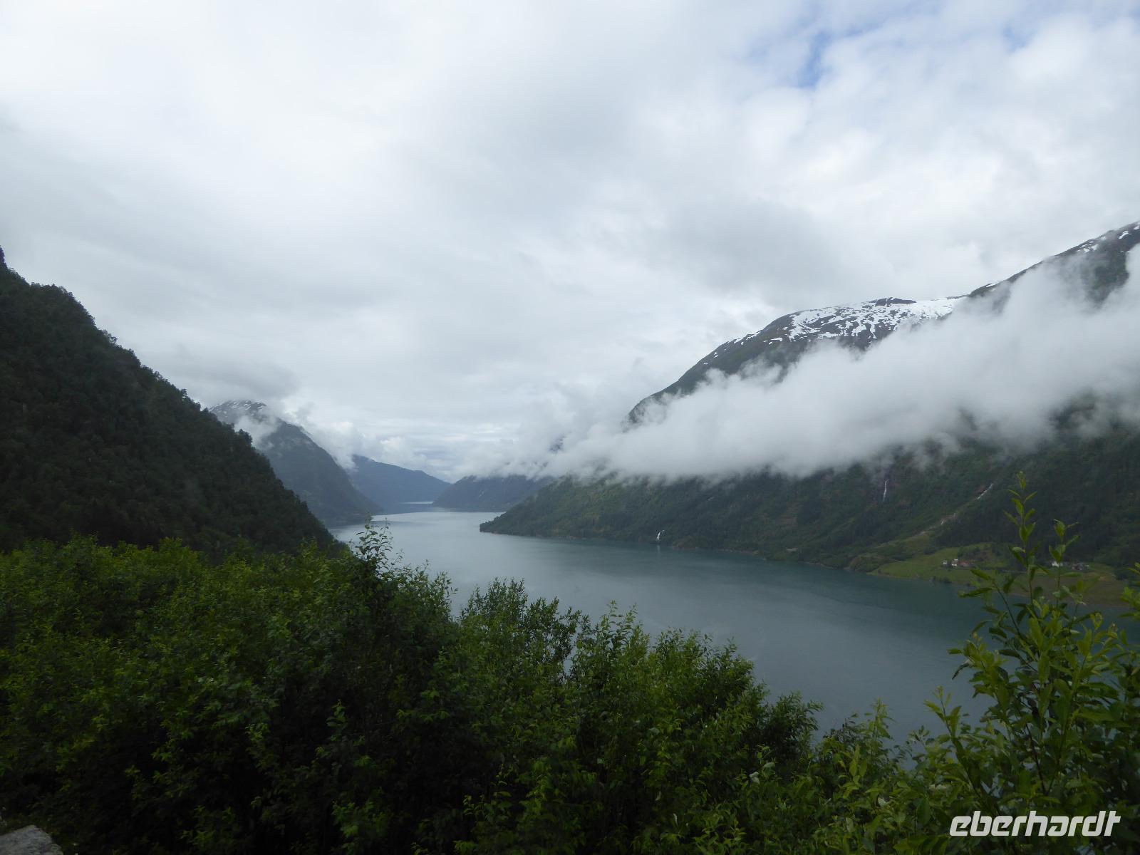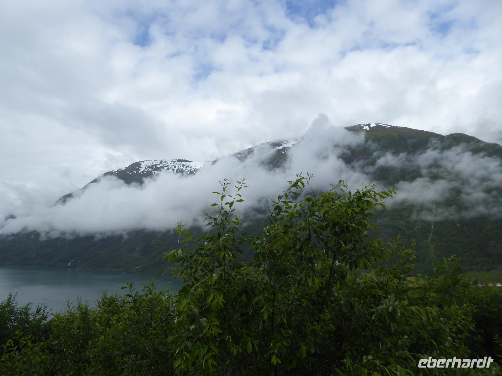 Gemütlich starten wir in den Tag, erst um neun fahren wir los. Am Vormittag besuchen wir das Gletschermuseum in Fjarland. Ein zwanzigminütiger Film lässt uns in die beeindruckende Welt der Gletscher eintauchen. Interaktiv führen Schautafeln durch das Museum und erklären anschaulich, warum das Eis blau und die Fjorde grün sind. Auch dem Gletschermann Ötzi sind ein paar Tafeln gewidmet. Am Ende der Ausstellung kann man durch einen nachgestalteten Gletscher laufen. Vorsicht! An einer Stelle ragt die Hand eines Toten aus dem Eis! Nach gut anderthalb Stunden haben wir alles angesehen und setzen unsere Fahrt fort. Es dauert nicht lange, bis wir den ersten Halt zum Fotografieren einlegen. Die Landschaft ist einfach zu verführerisch. Unterwegs treffen wir immer mal wieder auf Exemplare der einheimischen Tierwelt. Zwar sind es keine Elche, aber Ziegen und Schafe, die es sich auf der Straße gemütlich machen und unser Touristenherz erfreuen.