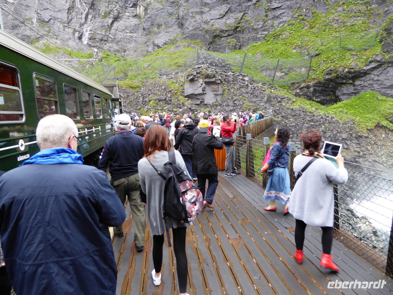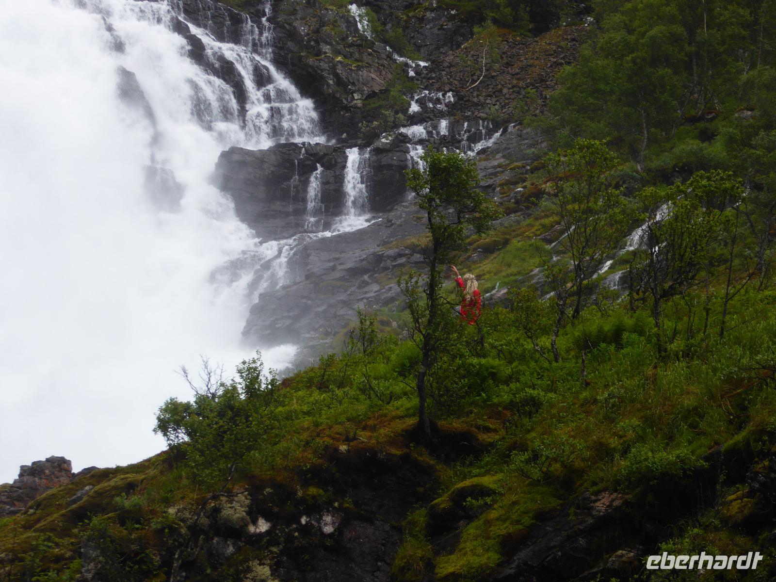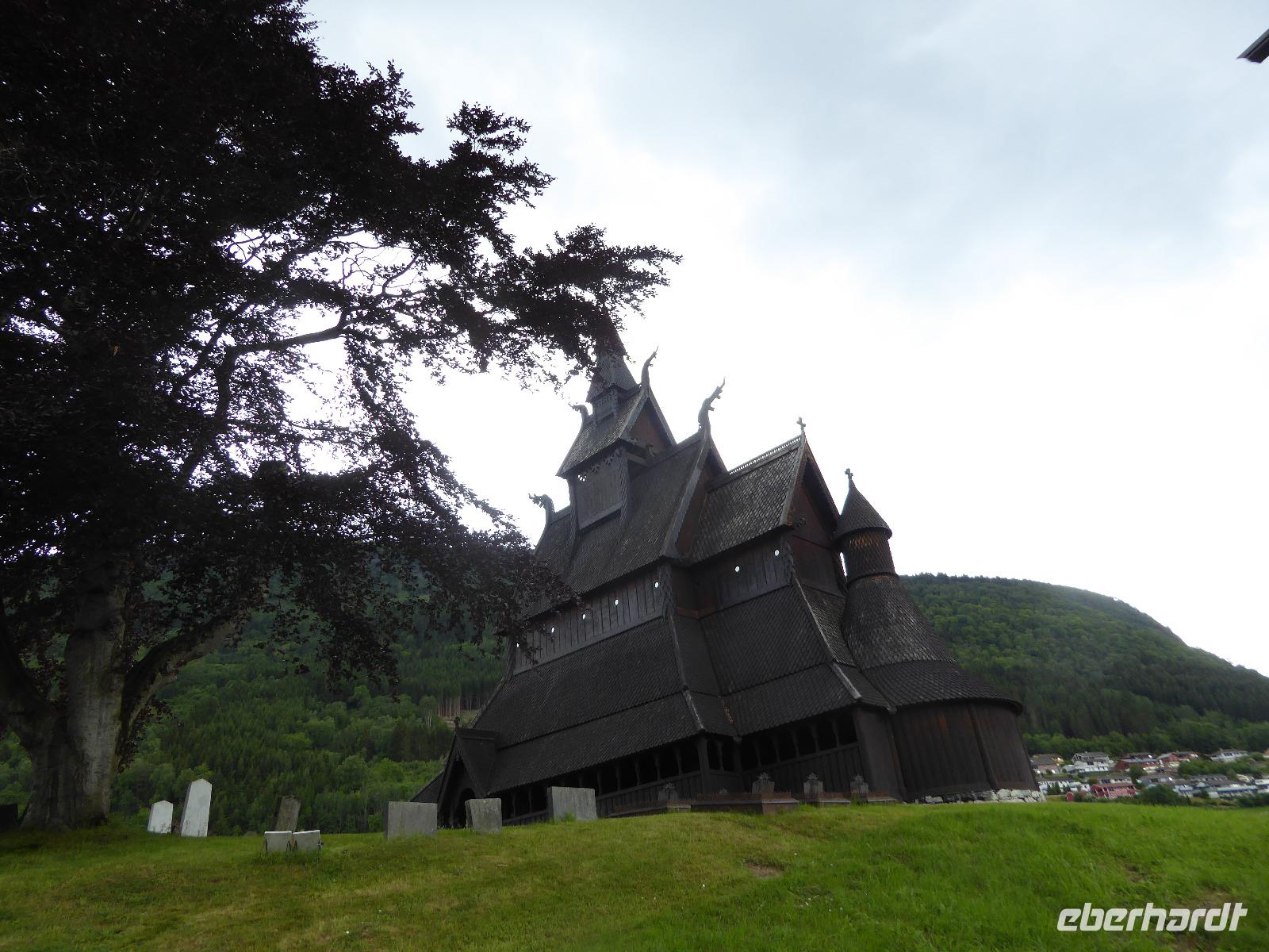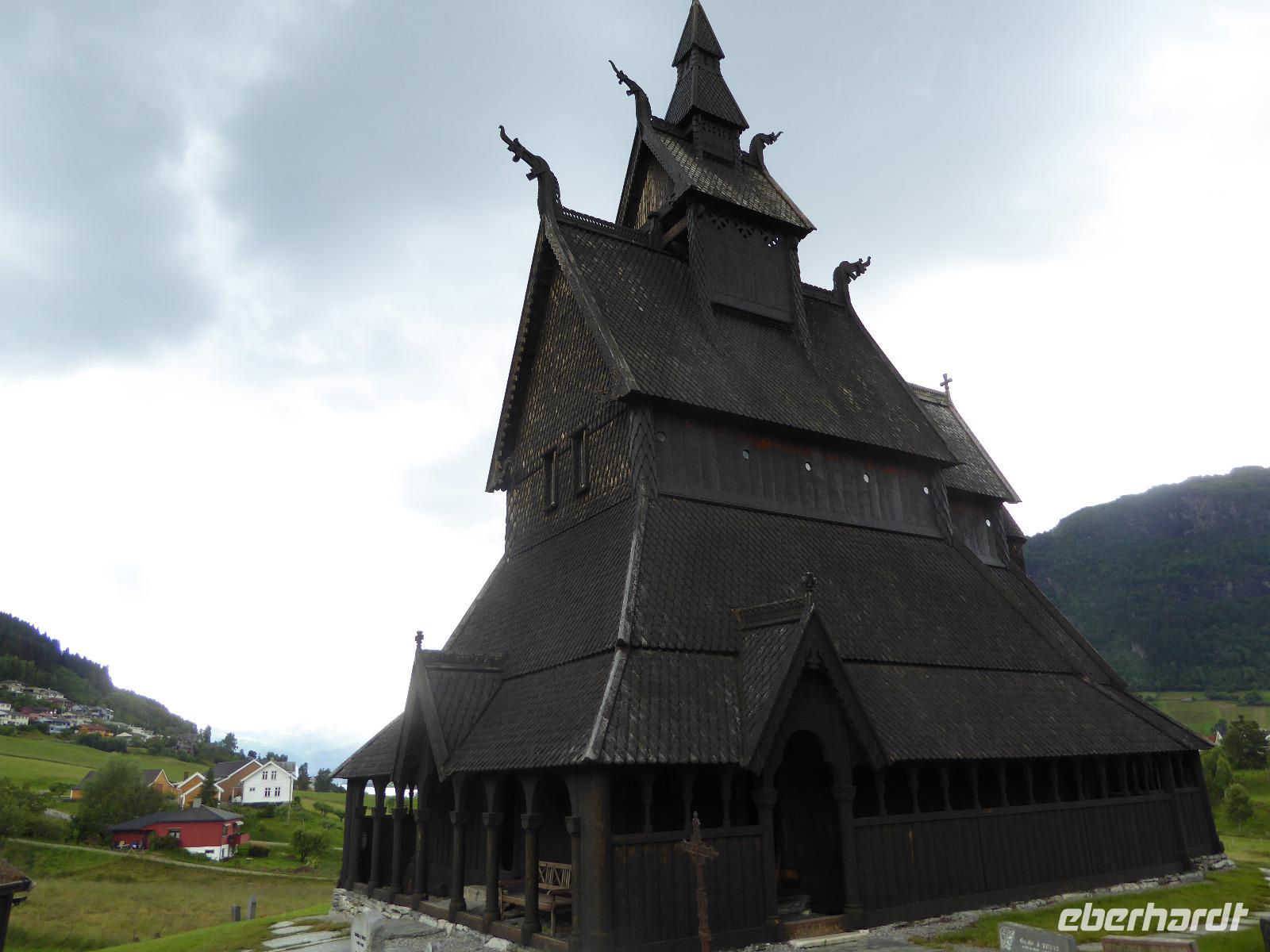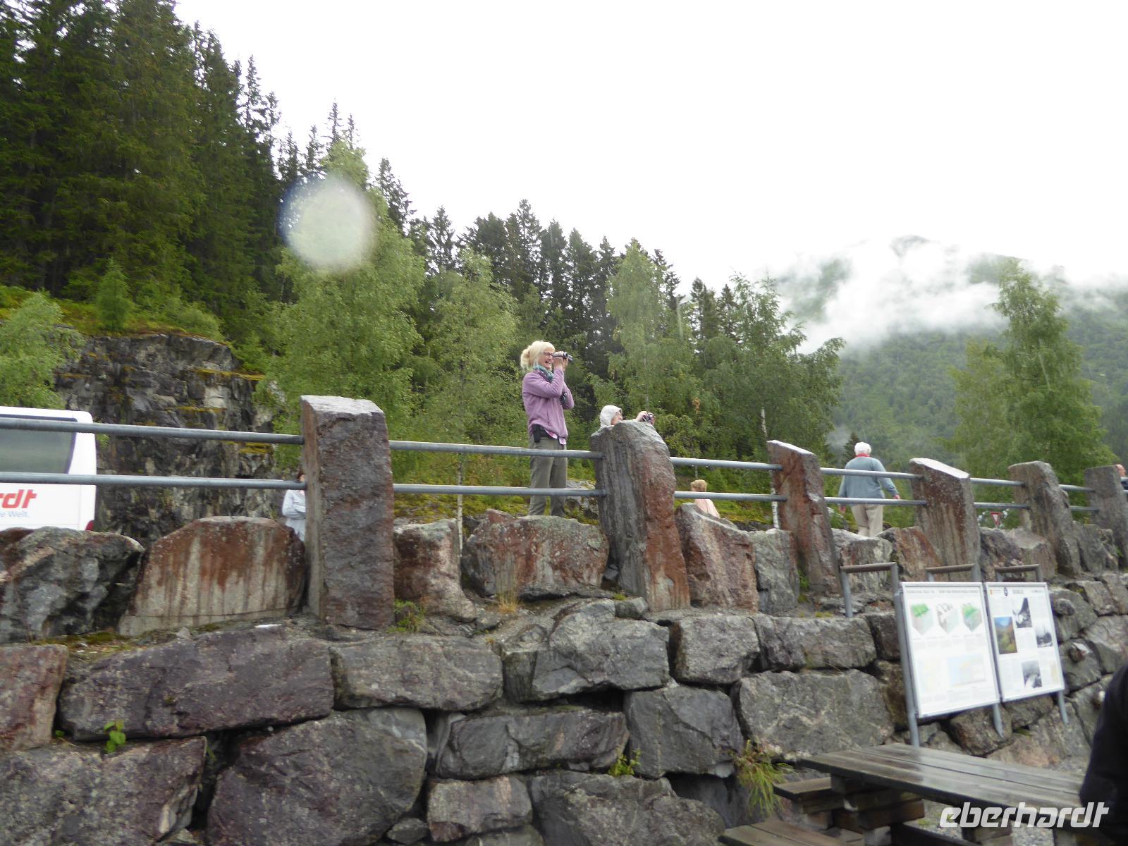 Wir starten um acht Uhr morgens. Mit der Fähre fahren wir von Manheller nach Fodnes und bekommen einen Eindruck vom Verkehrswesen in Norwegen. Bedingt durch die natürlichen Gegebenheiten, muss man sich hier immer danach richten, ob und wann eine Fähre fährt. Wir haben Glück und müssen nicht warten. Rechtzeitig kommen wir in Flam an und haben Zeit, durch die Souvenirläden zu schlendern. Mit der Flambahn wollen wir heute von Flam nach Myrdal fahren. Die Flambahn ist die steilste Eisenbahntrecke der Welt (auf Normalspur und ohne Zahnrad) und Norwegens spektakulärste. Ab zwanzig Minuten vor der Abfahrtszeit werden die Passagiere sortiert, so dass es keine Drängelei beim Einsteigen gibt. Wir stehen in der Linie 3, am Gleis 4 und steigen ein in Tür 11. Alles klappt wunderbar. Plätze 1 bis 25 sind für uns reserviert und das heißt, dass wir den Wagon ganz für uns alleine haben. Die Fahrt beginnt und schon bald hält es die Fotografen nicht mehr auf ihren Plätzen. Mal ist die Aussicht links spektakulär, mal eher rechts. Und kaum hat man den Fotoapparat gezückt, kommt ein Tunnel. Man muss schon schnell sein, um seine Bilder einzufangen. Doch Fotomotive gibt es genug. Tunnel auch, insgesamt zweiundzwanzig. Fünfzig Minuten dauert die Fahrt. Unterbrochen wird sie an einem Bahnhof, wo wir auf den Gegenzug warten müssen. Und von einem Stopp am Kjossfossen, einem Wasserfall, der sich dreiundneunzig Meter in die Tiefe stürzt. Dort singt und tanzt eine nordische Elfe für uns - großartig, einfach großartig! In Myrdal steigen wir um in die Bergenbahn, mit der wir nochmal eine Stunde bis nach Voss fahren. Lutz steht schon mit dem Bus am Bahnhof und erwartet uns. Wir fahren zum Tvindefoss, der sich über vier Kaskaden und einhundertvierundfünfzig Meter in die Tiefe stürzt. Ein Kleinod besuchen wir in Hopperstad. In der stockfinsteren Stabkirche aus dem 12. Jahrhundert erklärt uns ein norwegischer Student in überraschend gutem Deutsch die Kostbarkeiten der Kirche. So ist hier ein wunderschön geschnitztes Drachenportal zu bewundern und die Geschichte von einem Pfarrer zu hören, der sich selbst sehr gern hatte und von sich und seiner Frau Spuren hinterließ. Draußen tobt inzwischen ein regelrechtes Unwetter. Es gießt in Strömen. Doch kaum ist die kleine Führung vorbei, lässt auch der Regen wieder nach und wir kommen nur ein bisschen nass bis zum Bus. Noch einmal müssen wir einen Fjord mit einer Fähre überwinden, bevor wir wieder nach Leikanger kommen.