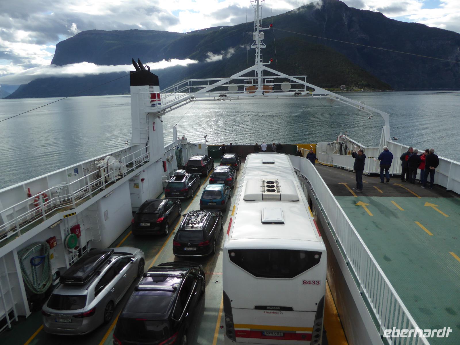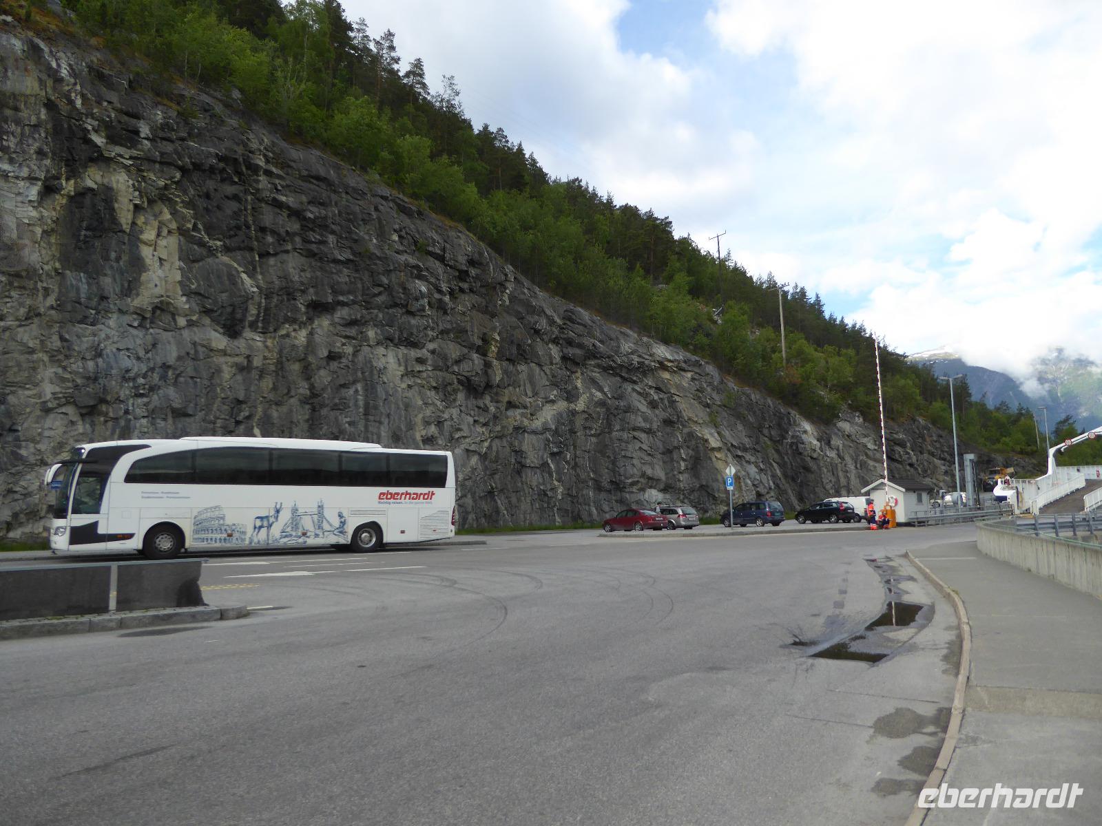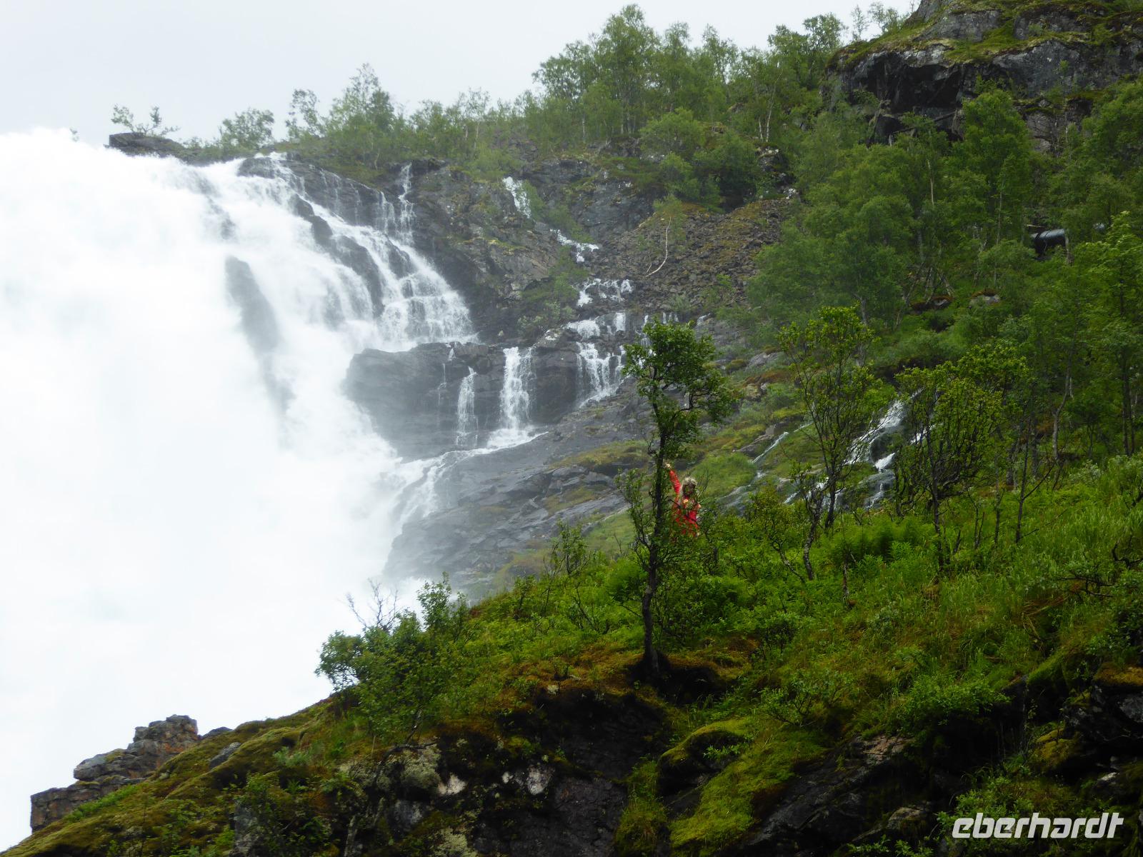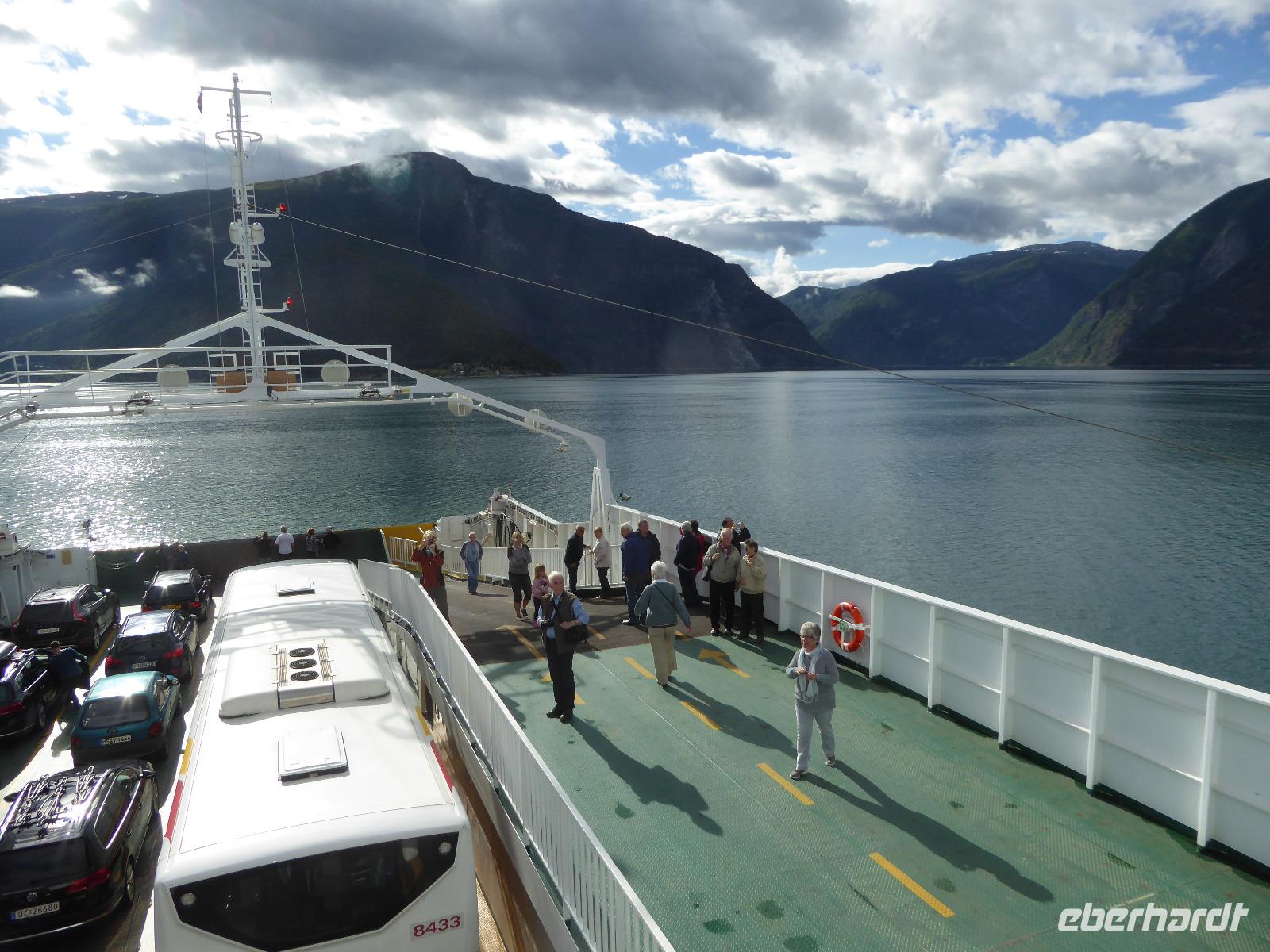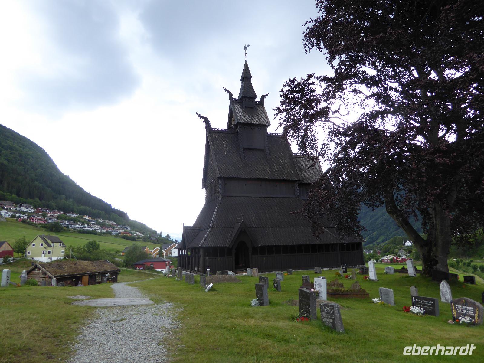 Wir starten um acht Uhr morgens. Mit der Fähre fahren wir von Manheller nach Fodnes und bekommen einen Eindruck vom Verkehrswesen in Norwegen. Bedingt durch die natürlichen Gegebenheiten, muss man sich hier immer danach richten, ob und wann eine Fähre fährt. Wir haben Glück und müssen nicht warten. Rechtzeitig kommen wir in Flam an und haben Zeit, durch die Souvenirläden zu schlendern. Mit der Flambahn wollen wir heute von Flam nach Myrdal fahren. Die Flambahn ist die steilste Eisenbahntrecke der Welt (auf Normalspur und ohne Zahnrad) und Norwegens spektakulärste. Ab zwanzig Minuten vor der Abfahrtszeit werden die Passagiere sortiert, so dass es keine Drängelei beim Einsteigen gibt. Wir stehen in der Linie 3, am Gleis 4 und steigen ein in Tür 11. Alles klappt wunderbar. Plätze 1 bis 25 sind für uns reserviert und das heißt, dass wir den Wagon ganz für uns alleine haben. Die Fahrt beginnt und schon bald hält es die Fotografen nicht mehr auf ihren Plätzen. Mal ist die Aussicht links spektakulär, mal eher rechts. Und kaum hat man den Fotoapparat gezückt, kommt ein Tunnel. Man muss schon schnell sein, um seine Bilder einzufangen. Doch Fotomotive gibt es genug. Tunnel auch, insgesamt zweiundzwanzig. Fünfzig Minuten dauert die Fahrt. Unterbrochen wird sie an einem Bahnhof, wo wir auf den Gegenzug warten müssen. Und von einem Stopp am Kjossfossen, einem Wasserfall, der sich dreiundneunzig Meter in die Tiefe stürzt. Dort singt und tanzt eine nordische Elfe für uns - großartig, einfach großartig! In Myrdal steigen wir um in die Bergenbahn, mit der wir nochmal eine Stunde bis nach Voss fahren. Lutz steht schon mit dem Bus am Bahnhof und erwartet uns. Wir fahren zum Tvindefoss, der sich über vier Kaskaden und einhundertvierundfünfzig Meter in die Tiefe stürzt. Ein Kleinod besuchen wir in Hopperstad. In der stockfinsteren Stabkirche aus dem 12. Jahrhundert erklärt uns ein norwegischer Student in überraschend gutem Deutsch die Kostbarkeiten der Kirche. So ist hier ein wunderschön geschnitztes Drachenportal zu bewundern und die Geschichte von einem Pfarrer zu hören, der sich selbst sehr gern hatte und von sich und seiner Frau Spuren hinterließ. Draußen tobt inzwischen ein regelrechtes Unwetter. Es gießt in Strömen. Doch kaum ist die kleine Führung vorbei, lässt auch der Regen wieder nach und wir kommen nur ein bisschen nass bis zum Bus. Noch einmal müssen wir einen Fjord mit einer Fähre überwinden, bevor wir wieder nach Leikanger kommen.