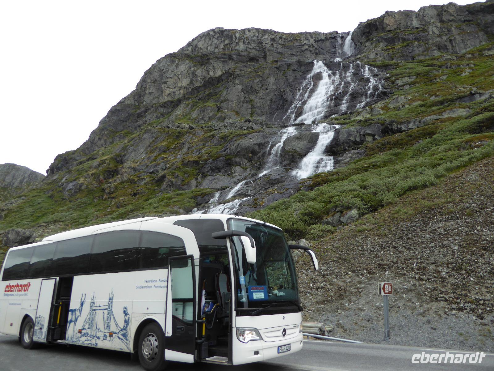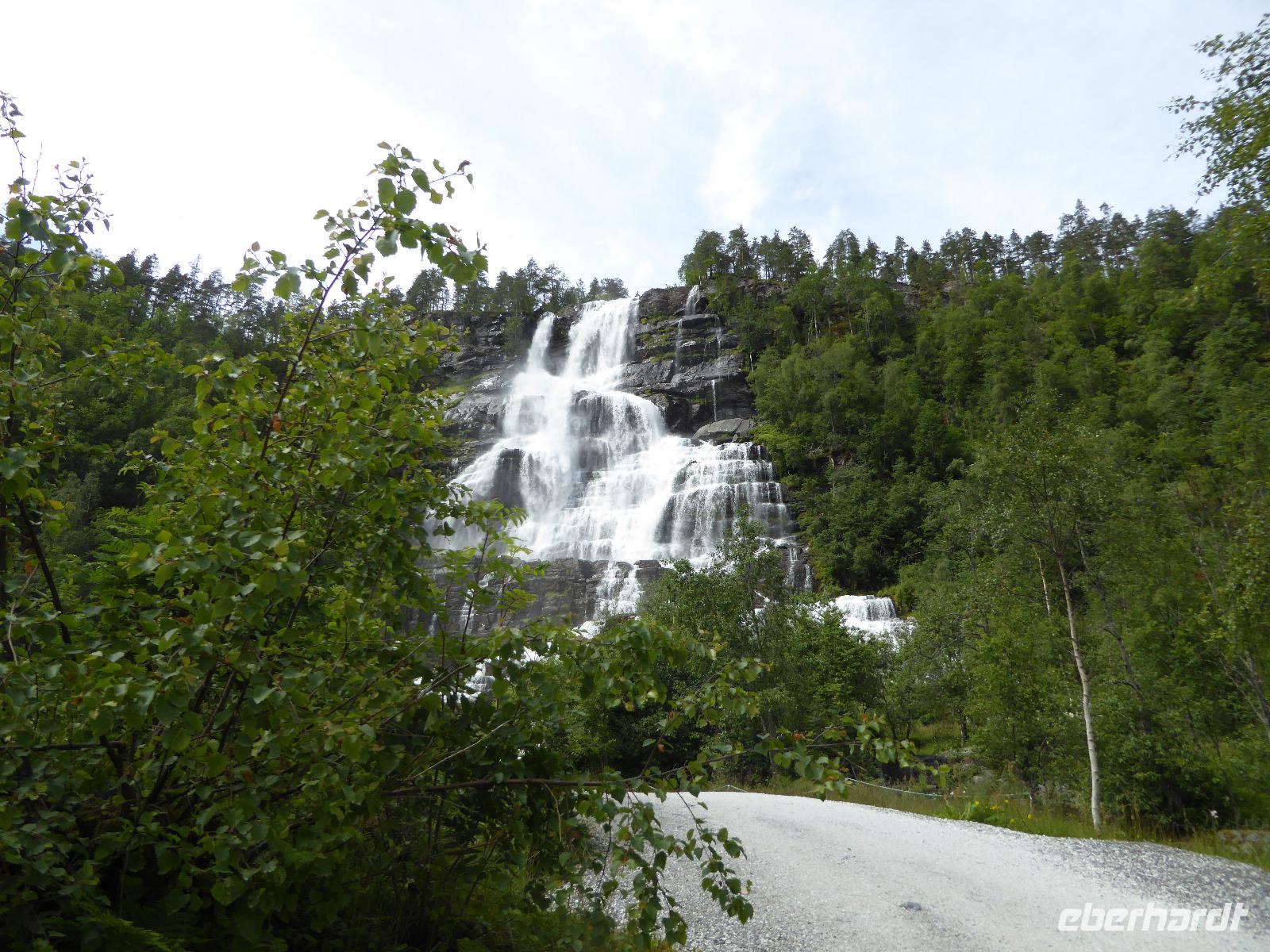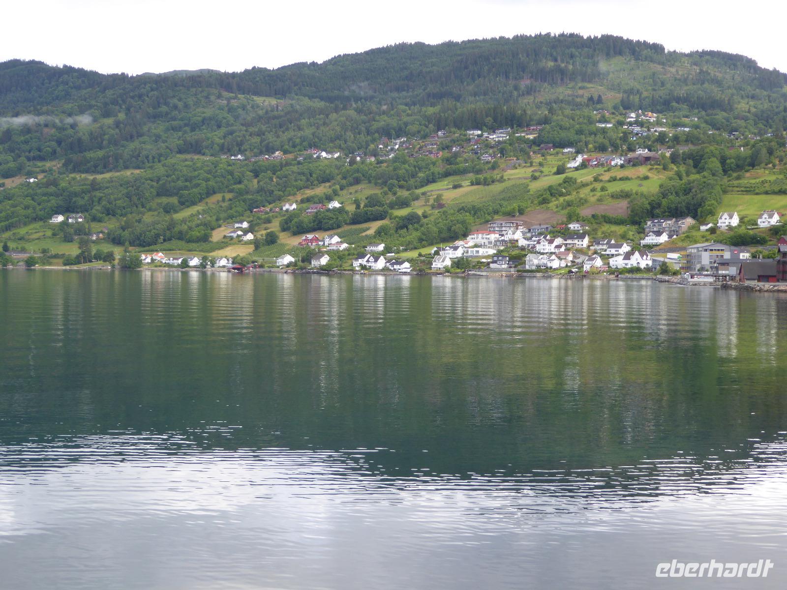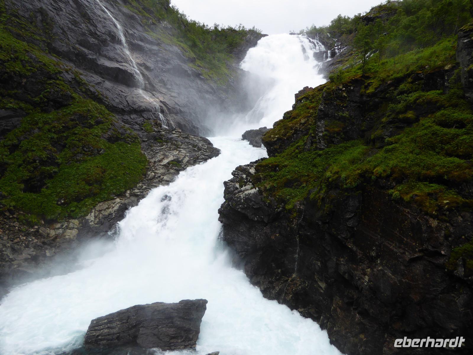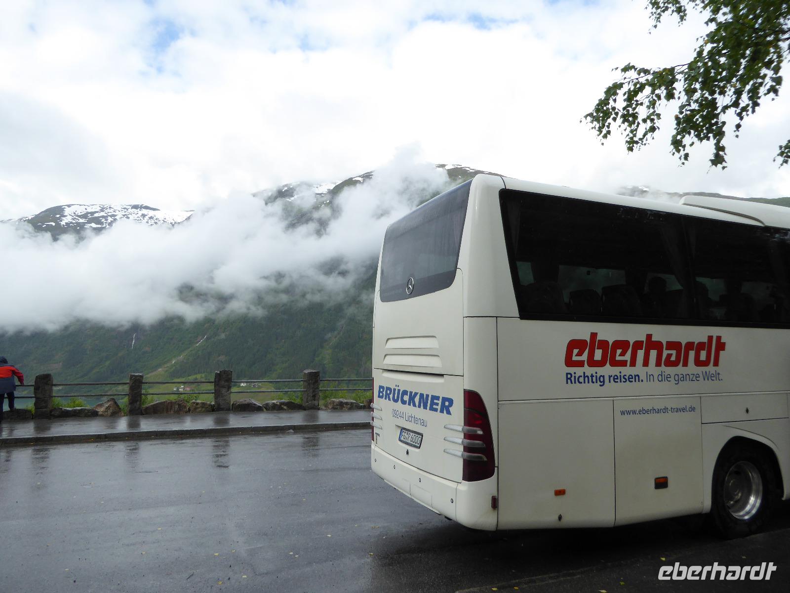 Wir starten um acht Uhr morgens. Mit der Fähre fahren wir von Manheller nach Fodnes und bekommen einen Eindruck vom Verkehrswesen in Norwegen. Bedingt durch die natürlichen Gegebenheiten, muss man sich hier immer danach richten, ob und wann eine Fähre fährt. Wir haben Glück und müssen nicht warten. Rechtzeitig kommen wir in Flam an und haben Zeit, durch die Souvenirläden zu schlendern. Mit der Flambahn wollen wir heute von Flam nach Myrdal fahren. Die Flambahn ist die steilste Eisenbahntrecke der Welt (auf Normalspur und ohne Zahnrad) und Norwegens spektakulärste. Ab zwanzig Minuten vor der Abfahrtszeit werden die Passagiere sortiert, so dass es keine Drängelei beim Einsteigen gibt. Wir stehen in der Linie 3, am Gleis 4 und steigen ein in Tür 11. Alles klappt wunderbar. Plätze 1 bis 25 sind für uns reserviert und das heißt, dass wir den Wagon ganz für uns alleine haben. Die Fahrt beginnt und schon bald hält es die Fotografen nicht mehr auf ihren Plätzen. Mal ist die Aussicht links spektakulär, mal eher rechts. Und kaum hat man den Fotoapparat gezückt, kommt ein Tunnel. Man muss schon schnell sein, um seine Bilder einzufangen. Doch Fotomotive gibt es genug. Tunnel auch, insgesamt zweiundzwanzig. Fünfzig Minuten dauert die Fahrt. Unterbrochen wird sie an einem Bahnhof, wo wir auf den Gegenzug warten müssen. Und von einem Stopp am Kjossfossen, einem Wasserfall, der sich dreiundneunzig Meter in die Tiefe stürzt. Dort singt und tanzt eine nordische Elfe für uns - großartig, einfach großartig! In Myrdal steigen wir um in die Bergenbahn, mit der wir nochmal eine Stunde bis nach Voss fahren. Lutz steht schon mit dem Bus am Bahnhof und erwartet uns. Wir fahren zum Tvindefoss, der sich über vier Kaskaden und einhundertvierundfünfzig Meter in die Tiefe stürzt. Ein Kleinod besuchen wir in Hopperstad. In der stockfinsteren Stabkirche aus dem 12. Jahrhundert erklärt uns ein norwegischer Student in überraschend gutem Deutsch die Kostbarkeiten der Kirche. So ist hier ein wunderschön geschnitztes Drachenportal zu bewundern und die Geschichte von einem Pfarrer zu hören, der sich selbst sehr gern hatte und von sich und seiner Frau Spuren hinterließ. Draußen tobt inzwischen ein regelrechtes Unwetter. Es gießt in Strömen. Doch kaum ist die kleine Führung vorbei, lässt auch der Regen wieder nach und wir kommen nur ein bisschen nass bis zum Bus. Noch einmal müssen wir einen Fjord mit einer Fähre überwinden, bevor wir wieder nach Leikanger kommen.