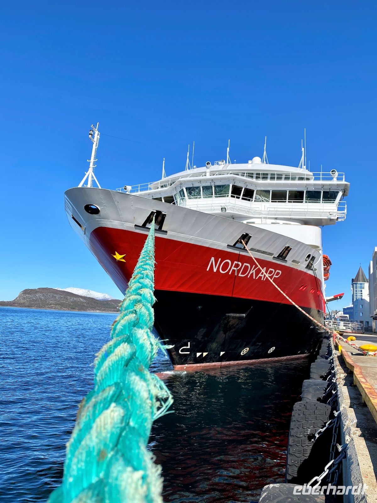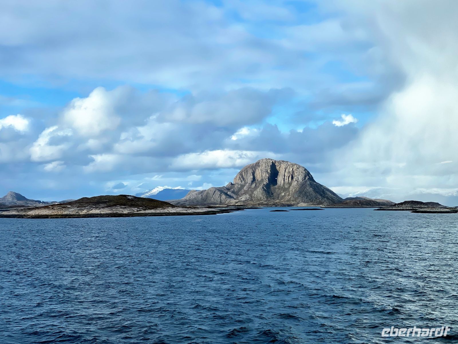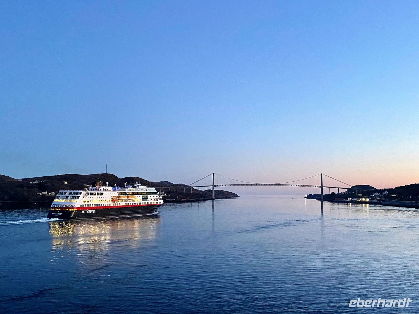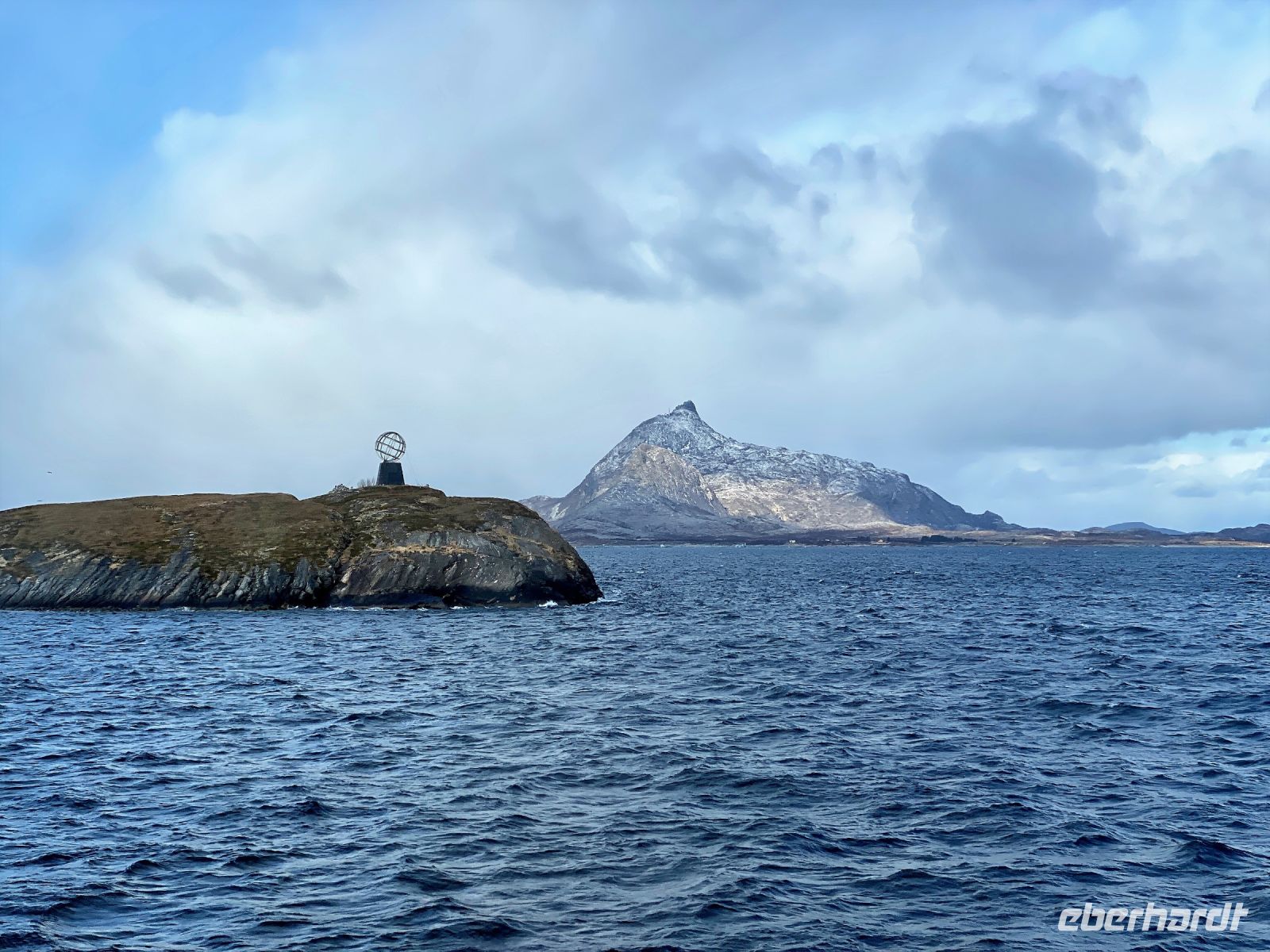 Unser zehnter Tag auf der MS Nordkapp markiert einen weiteren Meilenstein. Gegen 08:40 Uhr überquert unser Schiff südgehend den Polarkreis. Natürlich darf auch hierbei eine Zeremonie nicht fehlen – anstatt Eiswürfel gibt es heute Lebertran, serviert auf einem Hurtigruten-Löffel. Wer diesen begehrten Löffel sein eigen nennen möchte muss wohl oder übel den Lebertran zu sich nehmen. Hier hieß es Augen zu und durch. Ein weiteres Erlebnis am heutigen Tag ist ein Besuch auf der Brücke. Ganz fasziniert nehmen wir hier alles in Augenschein, bekommen sogar einige Erklärungen und genießen für einen kurzen Moment den Traumausblick von hier oben. Nach diesen tollen Eindrücken passiert unser Schiff gegen 12:30 Uhr die Helgelandküste und die sagenumwobene Bergkette der Sieben Schwestern. Leider verstecken sie sich heute in den Wolken. Am Nachmittag erreichen wir Brønnøysund, einen besonderen Hafen auf unserer Route. Denn der Ort liegt genau in der Mitte der norwegischen Küstenlinie. Von hier aus sind es 840 km in nördlicher Richtung zum Nordkap und genauso 840 km bis zum Kap Lindesnes im Süden Norwegens. Einige von uns nutzen hier die Möglichkeit zu einer kleinen Wanderung mit dem Expeditionsteam zum berühmten Torghatten – dem von Mythen und Legenden geprägten Berg mit dem Loch in der Mitte. Die Wanderung ist nochmal ein schöner Ausgleich zu den Tagen auf dem Schiff und lässt uns noch einmal in die spektakuläre Natur Norwegens eintauchen. Mit diesen tollen Eindrücken kehren wir am späten Nachmittag zurück an Bord, wo uns am Abend das traditionelle Captains Dinner erwartet. Hier werden wir beim Betreten des Restaurants vom Kapitän, seinen Offizieren und der Restaurantcrew persönlich begrüßt (wer steuert nun eigentlich das Schiff?). Sie stehen Spalier und jeder von uns erhält zur Begrüßung ein Glas Sekt. Anschließend nehmen wir Platz und genießen unser 3-Gänge-Menü. Was für ein Abendessen und schöner Abschluss an diesem Tag.