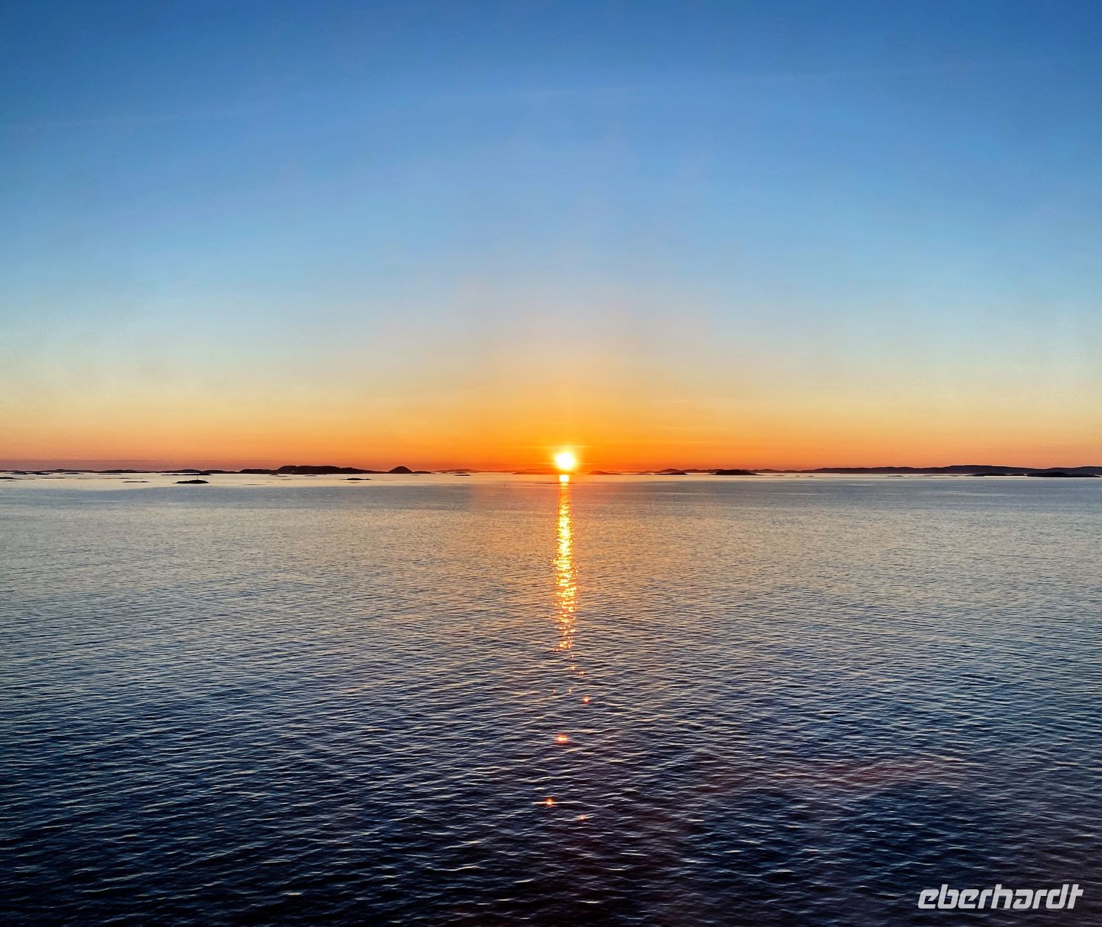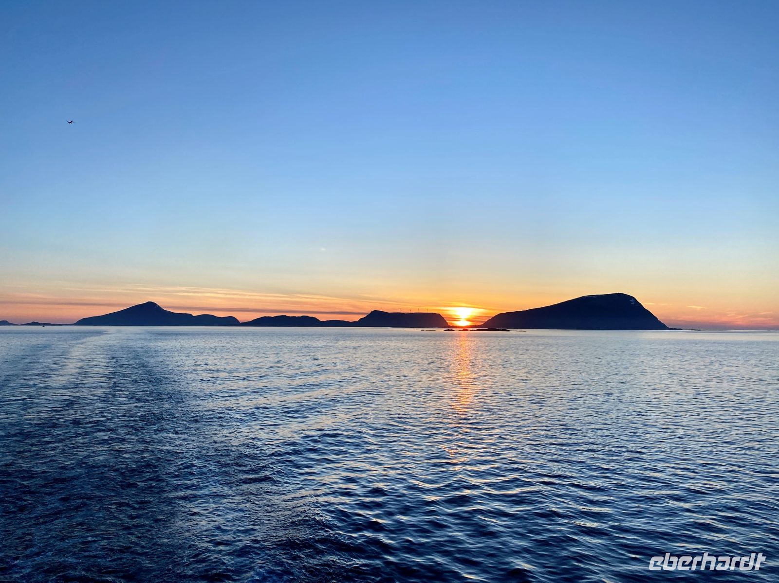 Nach einer ruhigen Nacht und einem ausgiebigen Frühstück erreichen wir am Morgen Trondheim, die über 1000 Jahre alte Stadt in der Mündung des Flusses Nid. Bei schönstem Wetter erwartet uns am Kai schon unsere Stadtführerin, mit der wir die Stadt in den nächsten Stunden zu Fuß erkunden werden. Natürlich dürfen hier Sehenswürdigkeiten wie die Speicherstadt, die alte Stadtbrücke, die königliche Residenz und der Nidaros-Dom mit seiner beeindruckenden Fassade nicht fehlen. Nach einem ausgiebigen Stadtspaziergang kehren wir mit vielen Impressionen und Bildern zurück aufs Schiff und müssen uns erst einmal beim leckeren Mittagessen stärken. Unser Schiff verlässt den Hafen von Trondheim und passiert kurze Zeit später Munkholmen – die kleine Insel im Trondheimsfjord. Das Schiff lässt den Trondheimsfjord hinter sich und nimmt wieder Kurs auf. Unser nächster Stopp an diesem Tag wird erst gegen späten Abend in Rørvik sein und so entspannen wir am Nachmittag auf unserem Schiff und genießen bei schönstem Wetter die norwegische Küstenlandschaft. Dabei hält die Strecke am Nachmittag noch ein kleines Highlight für uns bereit. Kurz nach 15 Uhr passieren wir Kjeungskjær Fyr, einen 21 Meter hohen Leuchtturm der vor der norwegischen Küste auf einer Schäre liegt und aufgrund seiner achteckigen Form einzigartig in Norwegen ist. Ein weiteres tolles Foto für unsere Sammlung. Am Abend werden wir heute wieder mit einem einzigartig schönen Sonnenuntergang belohnt und kurze Zeit später erreichen wir auch den letzten Hafen an diesem Tag – Rørvik – in dem uns die MS Trollfjord begegnet. Und so neigt sich auch der 3 Tag mit vielen Highlights dem Ende zu.