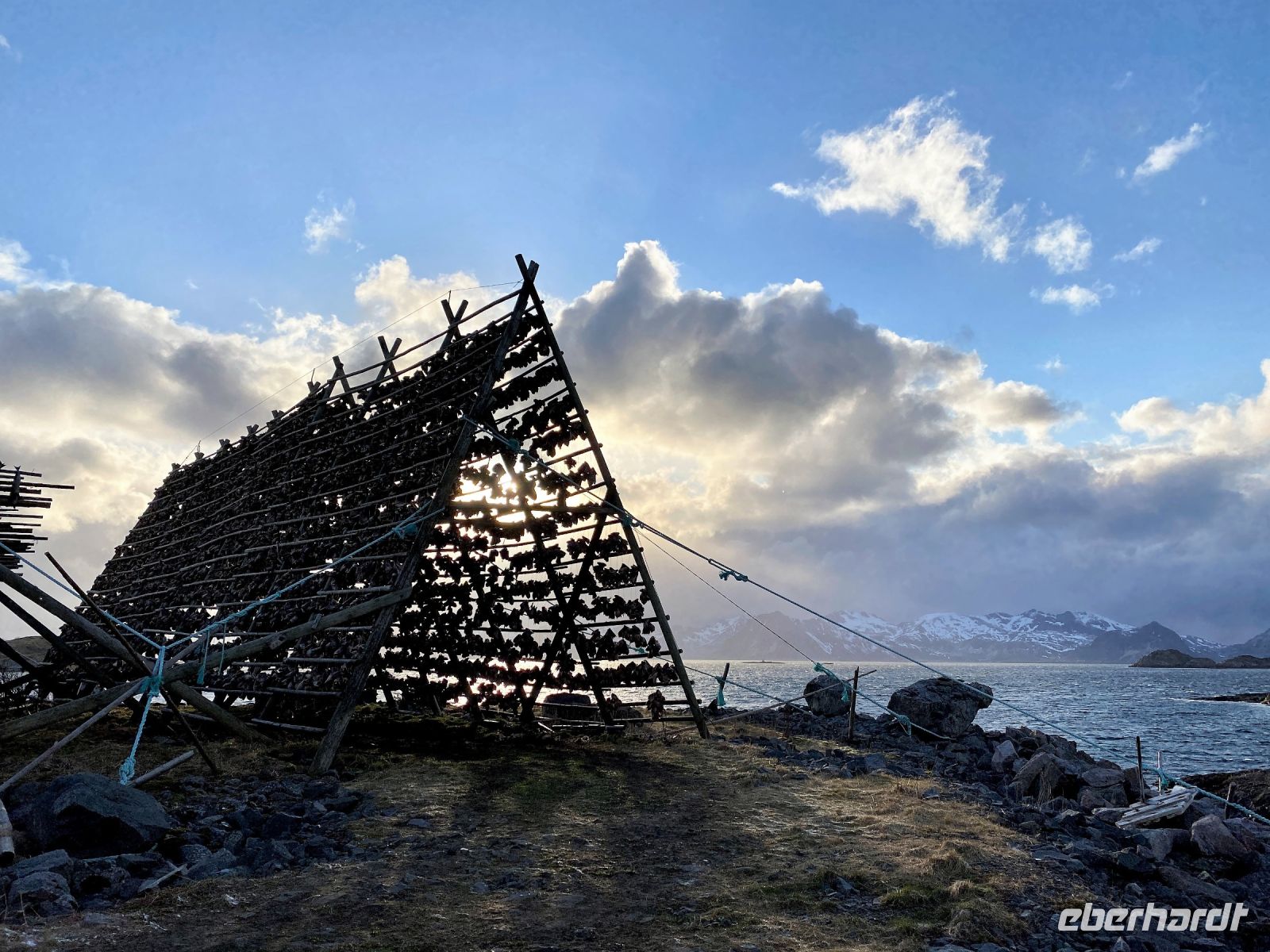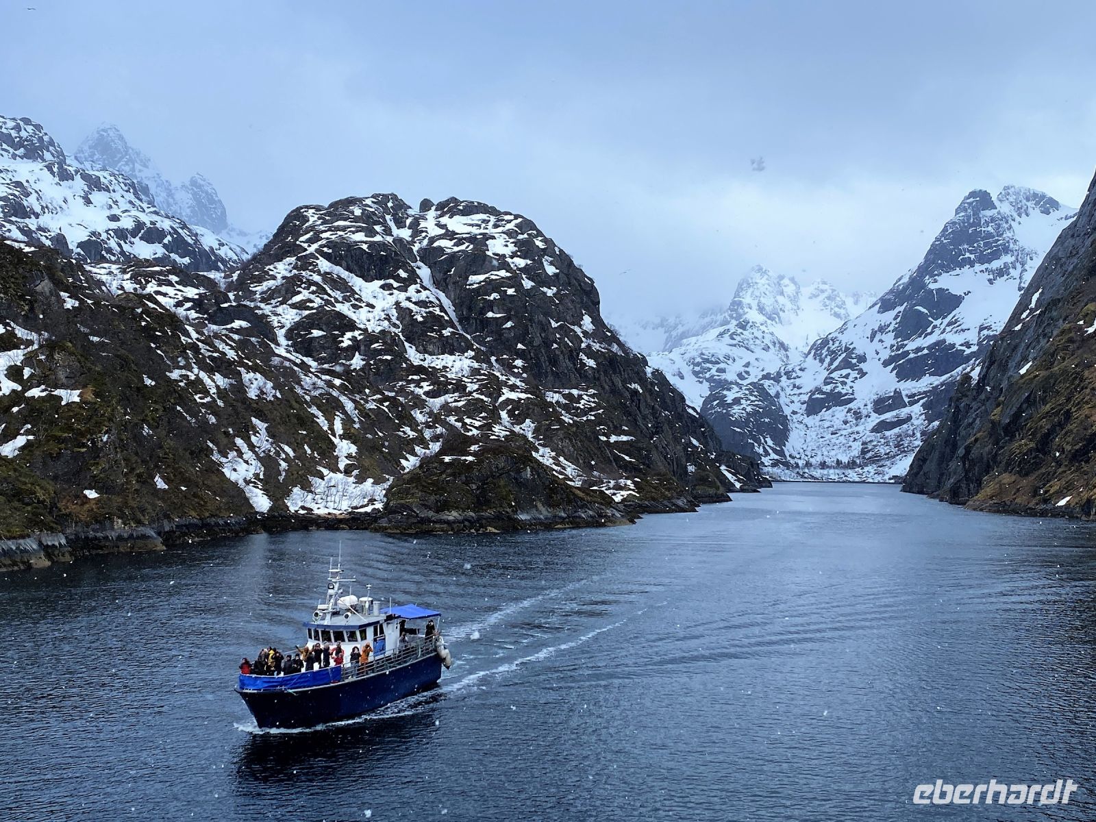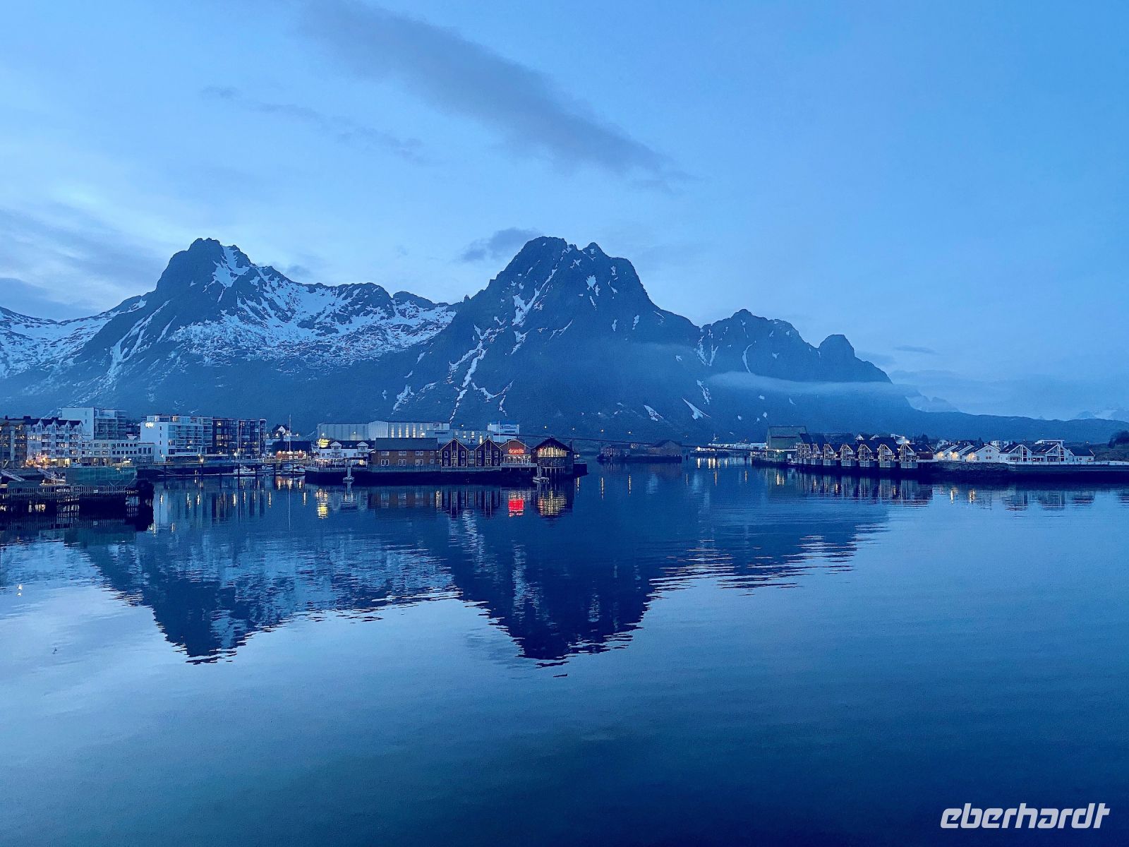 Ein großes Highlight auf unserer Reise ist die bezaubernde Inselwelt der Vesterålen und Lofoten. Und so machen sich bereits am frühen Morgen einige Gäste unserer Gruppe in Harstad auf den Weg, um die faszinierende Schönheit der Vesterålen zu entdecken. Der Ausflug beginnt mit der Fahrt zur Halbinsel Trondenes, wo wir eine mittelalterliche Steinkirche aus dem 13. Jahrhundert, die weltweit nördlichste ihrer Art, besuchen. Anschließend genießen wir von Trondenes aus die malerische Busfahrt über die Insel Hinnøya, entdecken hier sogar einige Rentiere, zu unserer Fähre am Gullesfjord. An Bord stärken wir uns mit einem heißen Getränk und frisch gebackenen Waffeln und genießen die herrliche Aussicht. Anschließend geht die Fahrt weiter entlang des Sigerfjords nach Sortland, wo wir von unserem Schiff hupend empfangen werden. Wieder an Bord stärken wir uns beim Mittagessen und freuen uns auf die vielen kleinen Highlights die der Tage heute noch mit sich bringt – das Hurtigrutenmuseum in Stockmarknen, die Fahrt durch den engen Raftsund am Nachmittag und für einige von uns die spektakuläre Seeadlertour mit Fahrt in den sagenumwobenen Trollfjord. Am frühen Abend erreichen wir den Hafen von Svolvær und verlassen hier für einige Stunden unser Schiff, um uns auf eine Entdeckungstour mit dem Bus über die berühmte Inselwelt der Lofoten zu begeben. Wir genießen die faszinierende Landschaft, entdecken das kleine Fischerdorf Henningsvær und kommen sogar in den Genuss, einmal so richtig den Stockfisch zu riechen, hängt er um diese Jahreszeit doch überall auf den Gestellen in und um Henningsvær. Wir versuchen ein gutes Foto zu ergattern, ohne uns direkt darunter stellen zu müssen, denn unser örtlicher Guide warnt uns ausdrücklich davor, wenn wir den Rest der Reise nicht auch so riechen möchten. Und so schaffen wir es, nach schönen und eindrucksvollen Stunden auf den Lofoten, am Abend ohne den Geruch von Stockfisch an unserer Kleidung unbeschadet zurück aufs Schiff.
