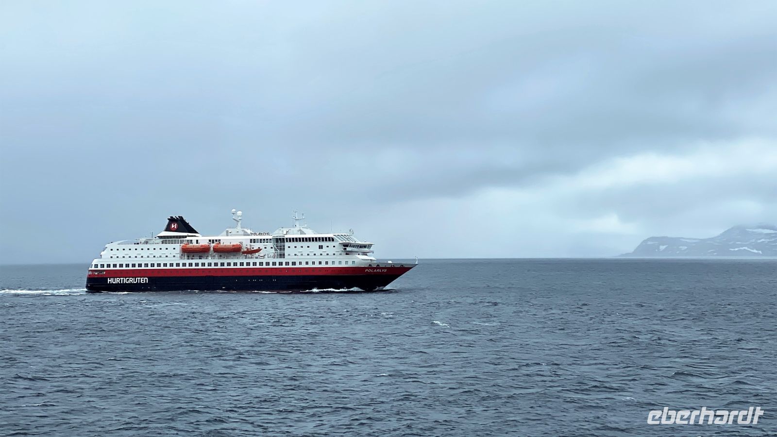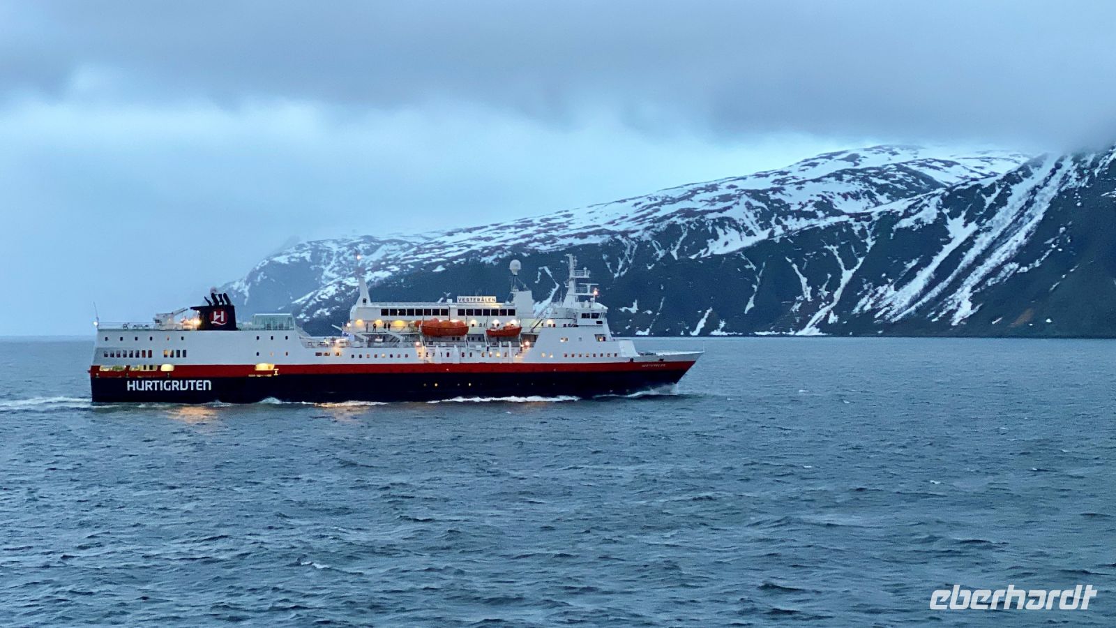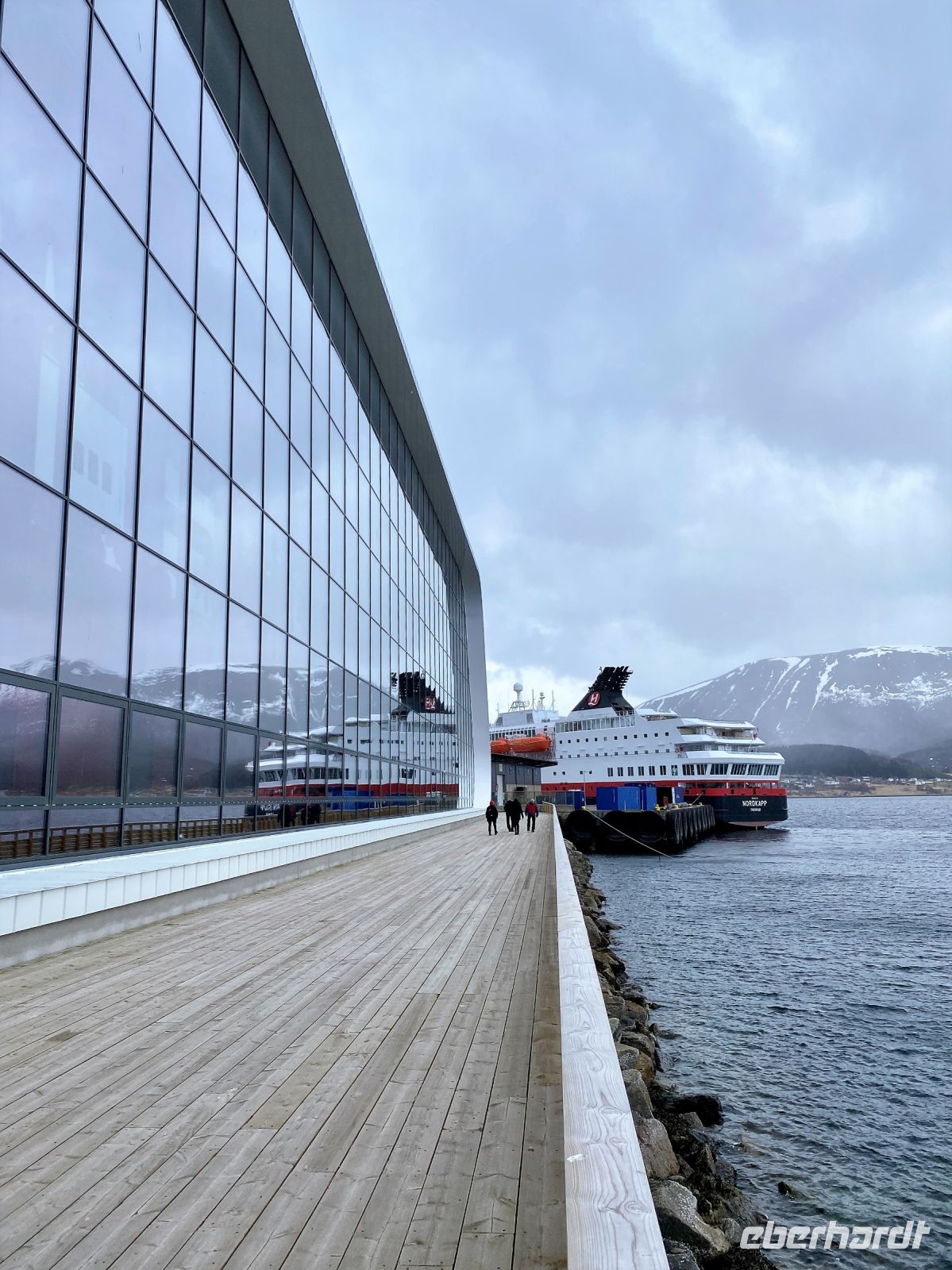 Die Zeit vergeht wie im Flug – nun sind wir schon den 5 Tag auf dem Schiff. In 2 Tagen erreichen wir bereits den Wendepunkt unserer Reise und bei diesem Gedanken wird man bereits heute schon etwas wehmütig, nachdem die ersten Tage schon so beeindruckend und erlebnisreich waren. Unser heutiges Ziel ist Tromsø, das Tor zum Eismeer und eine Stadt, die für ihr reichhaltiges Kulturangebot bekannt ist. Der Weg dorthin führt uns am Morgen über Harstad, wo wir auf die MS Kong Harald treffen, Finnsnes und durch die Rystraumen-Enge. Hier liegt auch die 2,1 km lange und rund 900 Meter breite Insel Ryøy, die eine interessante Geschichte bereithält – wurde sie viele Jahre doch durch die Universität Tromsø genutzt, um Moschusochsen auf der Insel anzusiedeln und deren Verhalten zu erforschen. Überpünktlich legt die MS Nordkapp dann am Nachmittag in Tromsø an. Im Hafen wechseln wir vom Schiff auf den Bus, um uns unter Führung unseres Guides Jørgen die Stadt zeigen zu lassen. Natürlich durfte hierbei ein Besuch der berühmten Eismeerkathedrale und des Polar-Museums nicht fehlen. Gegen 18:15 Uhr setzt unser Schiff seine nordgehende Fahrt fort. Auch wenn das Wetter heute nicht ganz so mitspielte wie die Tage zuvor, genossen wir auch den 5. Tag in vollen Zügen. Abgerundet wurde er dann noch mit einem wie immer sehr leckeren Abendessen, der Begegnung mit dem Schwesternschiff MS Vesterålen und etwas norwegischer Musik am Abend.