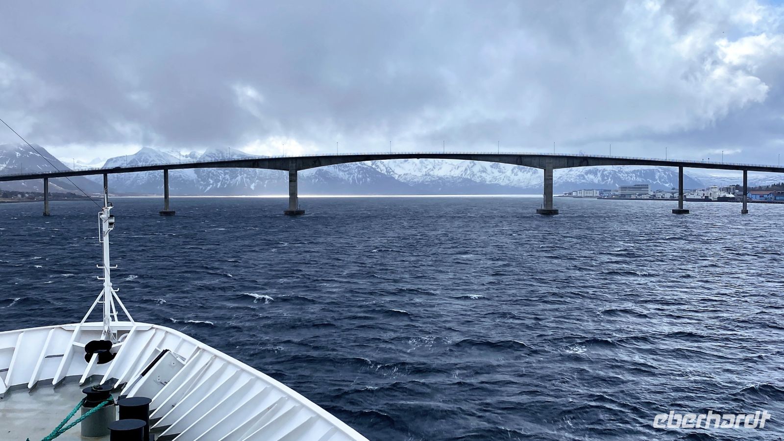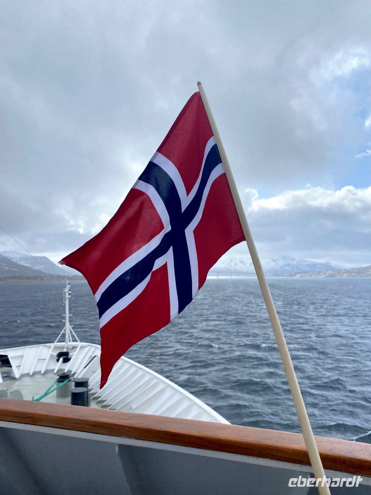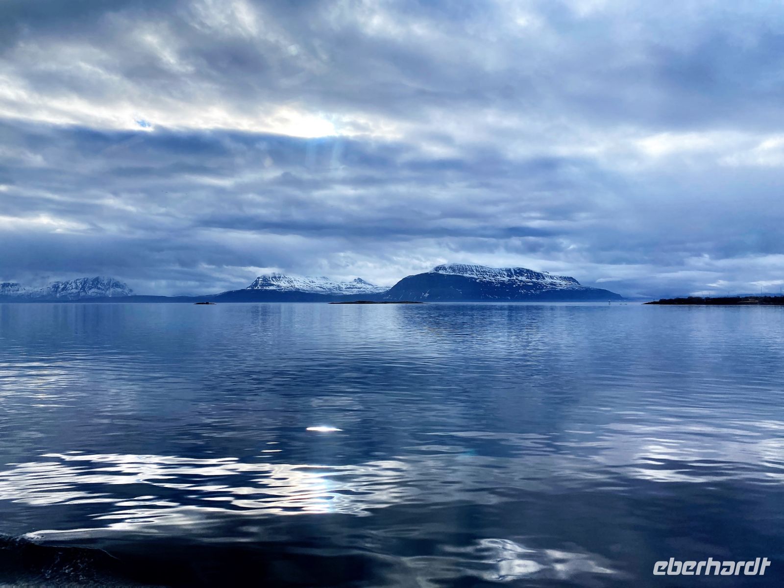 Die Zeit vergeht wie im Flug – nun sind wir schon den 5 Tag auf dem Schiff. In 2 Tagen erreichen wir bereits den Wendepunkt unserer Reise und bei diesem Gedanken wird man bereits heute schon etwas wehmütig, nachdem die ersten Tage schon so beeindruckend und erlebnisreich waren. Unser heutiges Ziel ist Tromsø, das Tor zum Eismeer und eine Stadt, die für ihr reichhaltiges Kulturangebot bekannt ist. Der Weg dorthin führt uns am Morgen über Harstad, wo wir auf die MS Kong Harald treffen, Finnsnes und durch die Rystraumen-Enge. Hier liegt auch die 2,1 km lange und rund 900 Meter breite Insel Ryøy, die eine interessante Geschichte bereithält – wurde sie viele Jahre doch durch die Universität Tromsø genutzt, um Moschusochsen auf der Insel anzusiedeln und deren Verhalten zu erforschen. Überpünktlich legt die MS Nordkapp dann am Nachmittag in Tromsø an. Im Hafen wechseln wir vom Schiff auf den Bus, um uns unter Führung unseres Guides Jørgen die Stadt zeigen zu lassen. Natürlich durfte hierbei ein Besuch der berühmten Eismeerkathedrale und des Polar-Museums nicht fehlen. Gegen 18:15 Uhr setzt unser Schiff seine nordgehende Fahrt fort. Auch wenn das Wetter heute nicht ganz so mitspielte wie die Tage zuvor, genossen wir auch den 5. Tag in vollen Zügen. Abgerundet wurde er dann noch mit einem wie immer sehr leckeren Abendessen, der Begegnung mit dem Schwesternschiff MS Vesterålen und etwas norwegischer Musik am Abend.