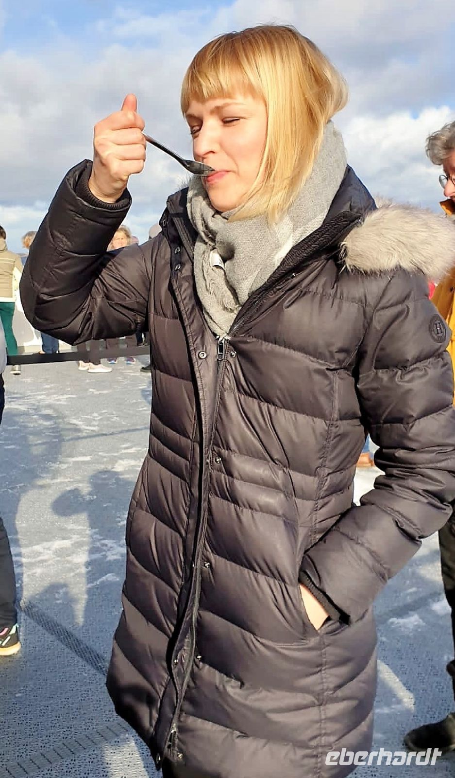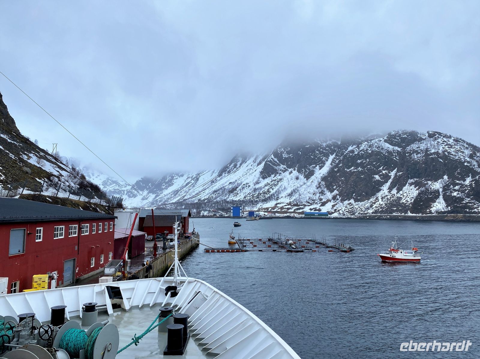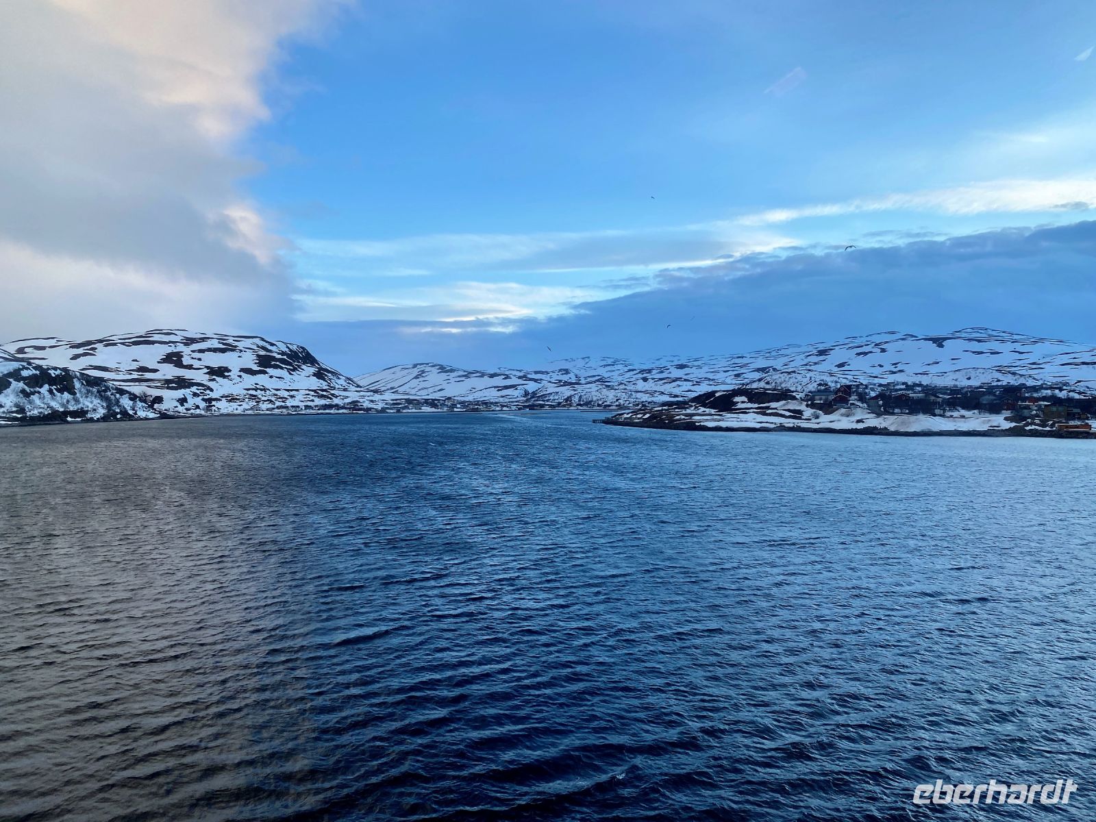 Heute am siebten Tag steht mit Ankunft in Kirkenes leider schon der Wendepunkt unserer Reise an. Für viele endete die spannende Reise entlang der norwegischen Küste hier, aber zum Glück noch nicht für unsere Gruppe. Wir dürfen unsere Fahrt bis Bergen fortsetzten. Doch bevor wir uns Gedanken über unsere Rückreise machen, nutzen wir den heutigen Tag noch einmal so richtig aus. Heut stehen viele Ausflüge zur Wahl: ein Ausflug zur russischen Grenze oder zu einem Schneehotel, aber auch eine Tour im Hundeschlitten. Da ist für jeden von uns etwas dabei. Wer keinen Ausflug macht, der nutzt die Zeit für einen Spaziergang ins nahegelegene Zentrum von Kirkenes. Und so verbringen wir den Vormittag getrennt voneinander und genießen unsere Zeit in Kirkenes ganz individuell. Ein krönender Abschluss der nordgehenden Route. Um die Mittagszeit verlässt unser Schiff dann schon wieder den Hafen – ab jetzt befinden wir uns also wieder auf dem Rückweg. Den restlichen Tag lassen wir an uns vorbeiziehen, es gibt kleinere Stopps in Vardø, Båtsfjord und Berlevåg. Am Abend dann, nach einem wie immer sehr leckeren Abendessen, treffen wir uns gemeinsam auf dem obersten Deck des Schiffes, um die ersten Tage unserer Reise Revue passieren zu lassen. Eine kleine Kostprobe typisch norwegischen Stockfischs und einem kleinen Schluck Aquavit dürfen hierbei heute nicht fehlen. Und so lassen wir den Abend gemeinsam ausklingen und freuen uns auf die kommenden Tage.