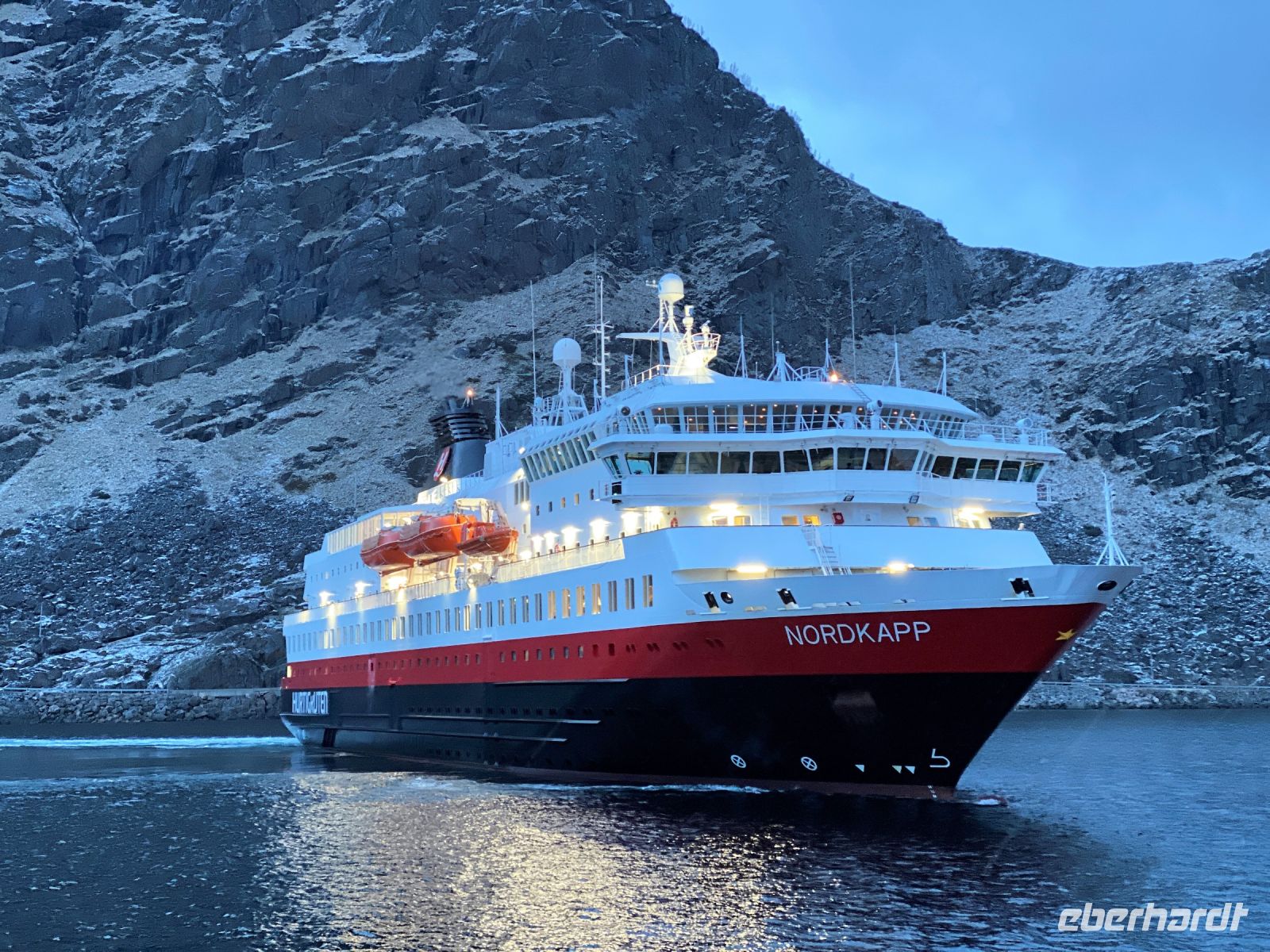Der Tag beginnt mit leichtem Wellengang, der erste den wir seit Beginn unserer Reise haben. Doch das trübt unsere Stimmung nicht, denn heute steht ein ganz besonderes Highlight auf unserem Programm – das Nordkap. Ein absolutes Highlight jeder Nordlandfahrt und für viele von uns ein langersehntes Sehnsuchtsziel. Der Weg dorthin, führt uns vom Anleger in Honningsvåg durch die äußerst reizvolle karge Landschaft Norwegens. Hier wächst kein Baum mehr und immer wieder bietet sich uns der Blick auf das Eismeer. Sogar die ersten Rentiere können wir auf unserem Weg entdecken. Oben am Kap angekommen haben wir ausreichend Zeit, um alles zu erkunden. Natürlich darf hierbei ein Foto mit dem berühmten Nordkap-Globus nicht fehlen. Mit etwas Glück gelingt es uns sogar hiervon ein freies Foto ohne unsere liebgewonnenen Mitreisenden zu ergattern. Das Nordkap ganz exklusiv! Wir genießen bei guten Wetterverhältnissen (kein Regen und nur sehr wenig Wind) die atemberaubende Aussicht auf das Eismeer. Es ist ein tolles Gefühl hier oben am Ende der Welt zu stehen. Den Rest der Zeit nutzen wir in der Nordkaphalle um Souvenirs zu kaufen, leckere Waffeln zu essen oder auch den beeindruckenden Panoramafilm über das Nordkap anzuschauen. Mit diesen tollen Eindrücken geht es am frühen Nachmittag wieder zurück zum Schiff, wo schon leckerer warmer Apfelkuchen und ein Becher Kakao auf uns wartet. Am Nachmittag gibt es mit der Finnkirka – eine wie eine Kirche geformte Klippe - noch eine weitere kleine Sehenswürdigkeit, bevor es etwas später in Richtung offenes Meer geht, was spätestens mit dem etwas stärkeren Wellengang wahrzunehmen ist. Am Abend entdecken wir dann im Meer auch die ersten Wale und freuen uns sehr, dass wir auch das auf unserer Reise erleben konnten. Und so geht der Tag langsam zu Ende.