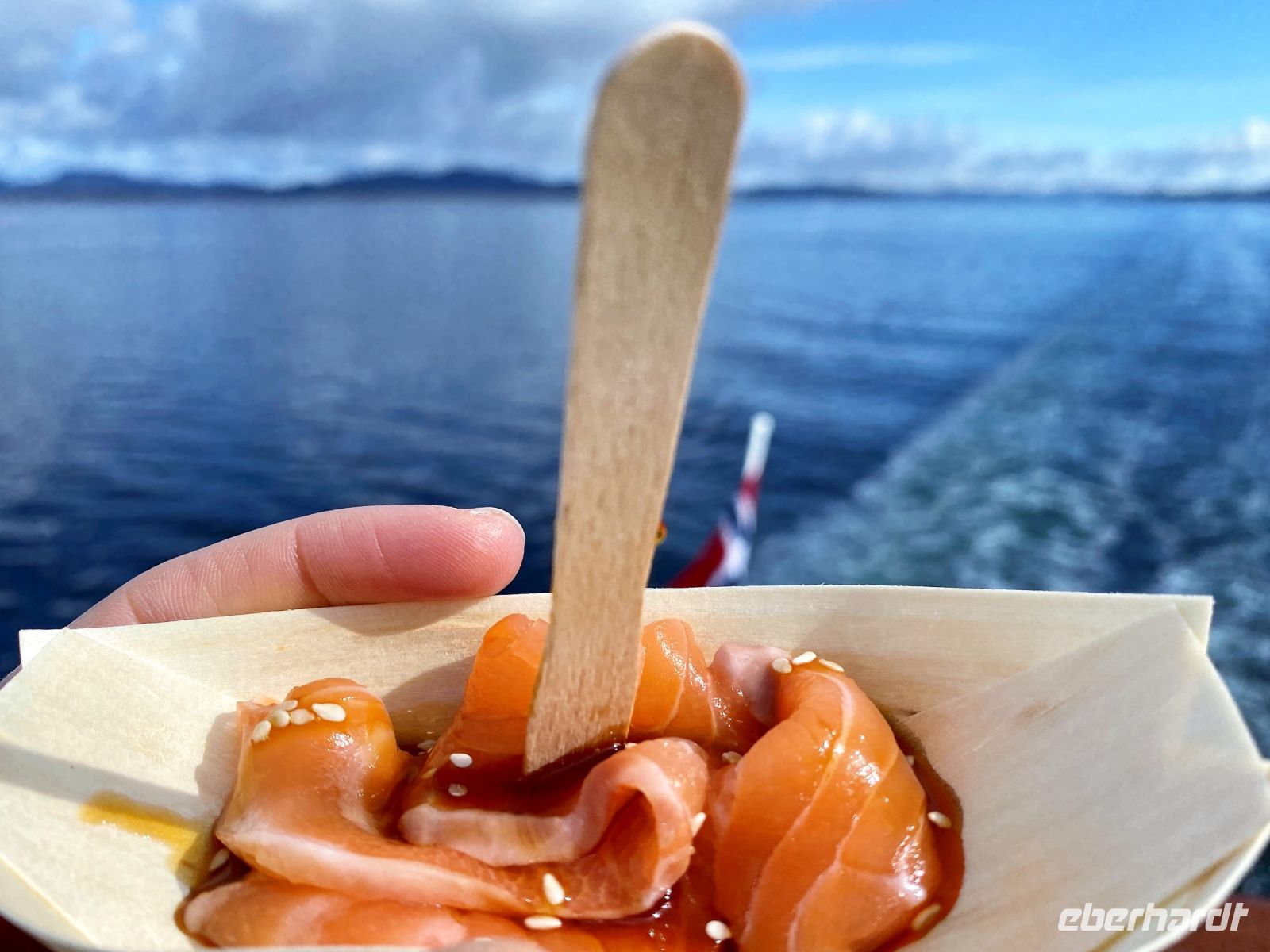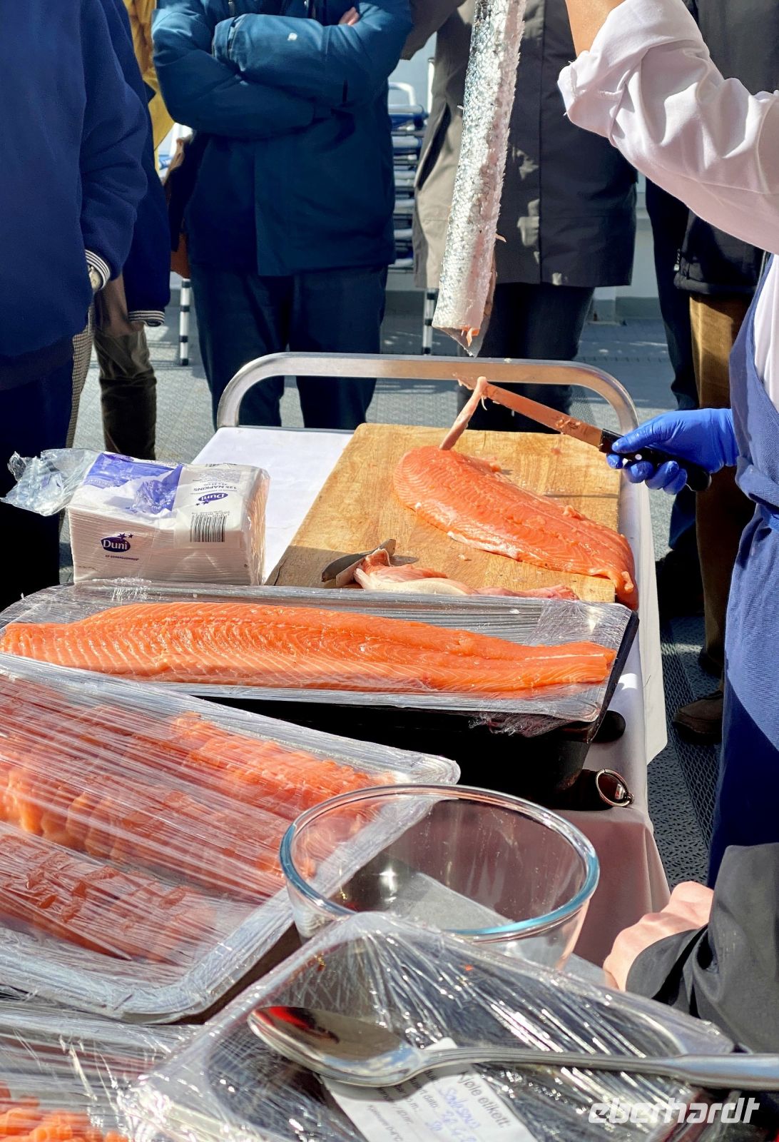 Am Morgen legt unser Schiff bereits gegen 6:30 Uhr in Trondheim an. Für einen Großteil der Gäste ist in Norwegens ehemaliger Hauptstadt die Reise zu Ende: Sie gehen hier schon von Bord. Wir aber bleiben noch einen Tag länger und verbringen den letzten Tag bis Bergen auf dem Schiff. Heute lassen wir es ruhig angehen. Wir bekommen noch einen kleinen Kurs im Lachsfiletieren und nutzen den restlichen Tag noch einmal zur Entspannung und um uns an der vorbeiziehenden Landschaft zu erfreuen. Satt sehen kann man sich daran ja einfach nicht. Und so zieht der Tag an uns vorbei und endet mit dem abschließenden allabendlichen Dinner. Anschließend treffen wir uns heute noch einmal in gemütlicher Runde und lassen diesen letzten Abend mit einer Kostprobe leckeren Moltebeerenlikörs gemeinsam ausklingen.