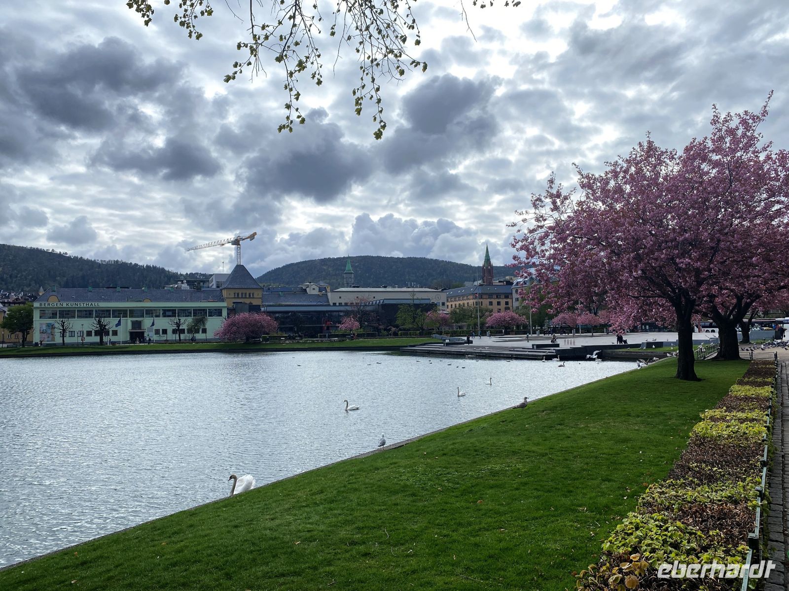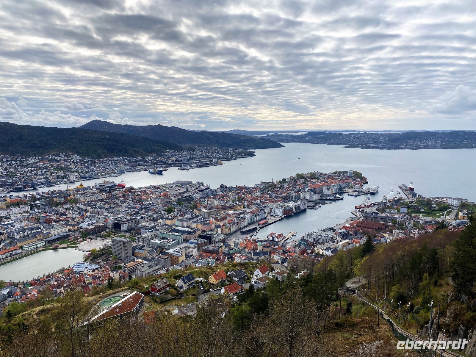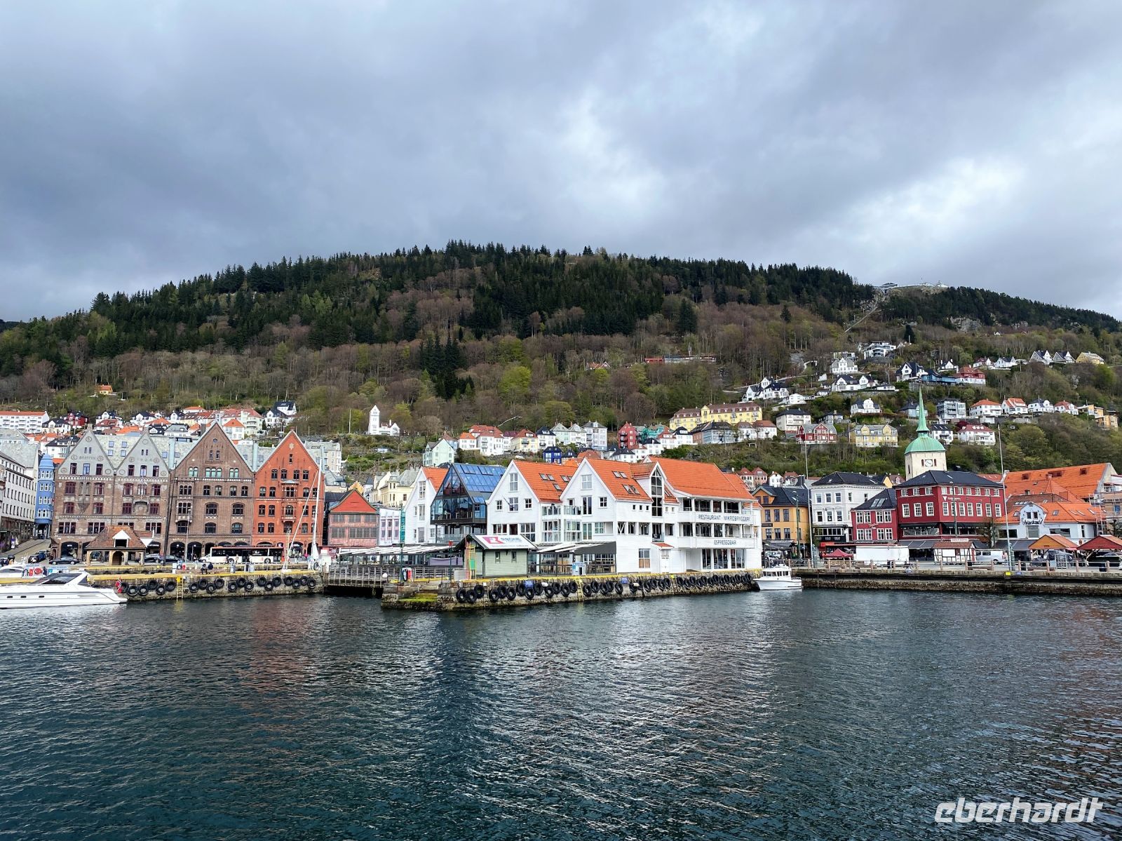 Der letzte Vormittag an Bord der MS Nordkapp. Ein letztes Mal das leckere Frühstück und Mittagessen genießen und ein letztes Mal die an uns vorbeiziehende norwegische Landschaft in uns aufsaugen, bevor wir früher als erwartet am Nachmittag gegen 14:30 Uhr in den Hafen von Bergen einlaufen. Unsere Seereise findet hier ihr Ende, Abschied nehmen müssen wir zum Glück aber noch nicht, bleibt uns doch noch ein Tag in Bergen. Und so begeben wir uns vom Schiff direkt zu unserem Bus, der uns zu unserem zentral gelegenen Hotel in Bergen bringt. Wir beziehen unsere Zimmer und treffen uns anschließend vor dem Hotel wieder, von wo aus wir gemeinsam mit Angela unserer Stadtführerin Bergen zu Fuß erkunden. Dabei erfahren wir viele interessante Geschichten über die Stadt und manchmal auch kuriose Dinge. Nach diesen tollen Eindrücken verabschieden wir Angela am Fischmarkt und verbringen den weiteren Abend auf ganz unterschiedliche Weise. Die einen gehen noch ein bisschen spazieren, andere finden den Weg zur Fischhalle, wo sie lecker zu Abend essen und eine kleine Gruppe von uns nutzt die guten Wetterbedingungen und fährt mit der berühmten Fløibanen, einer Standseilbahn, auf den 320 Meter hohen Berg Fløyen. Oben angekommen genießen wir die beeindruckende Panoramasicht auf die Stadt. Wenn das kein gelungener Abschluss für eine schöne Reise ist.