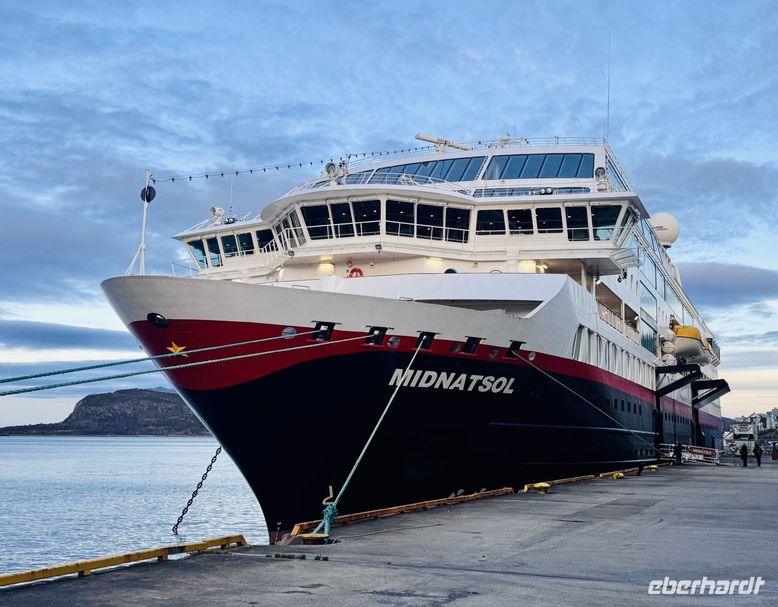 Wenig später geht es weiter über die offene Meerstrecke Hustadvika. Das Schiff hebt und senkt sich sanft in den langen Wellen, während der Wind pfeifend über das Deck zieht. Gegen Abend tauchen die Lichter von Molde auf – die „Stadt der Rosen“, die sich trotz des trüben Wetters freundlich präsentiert.