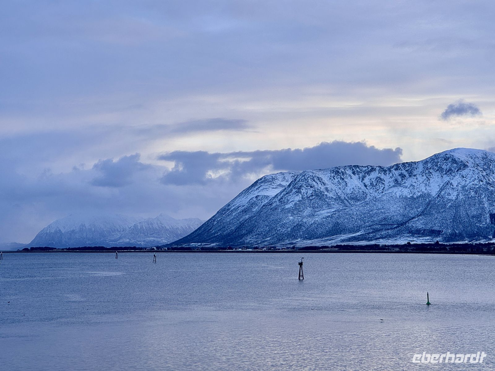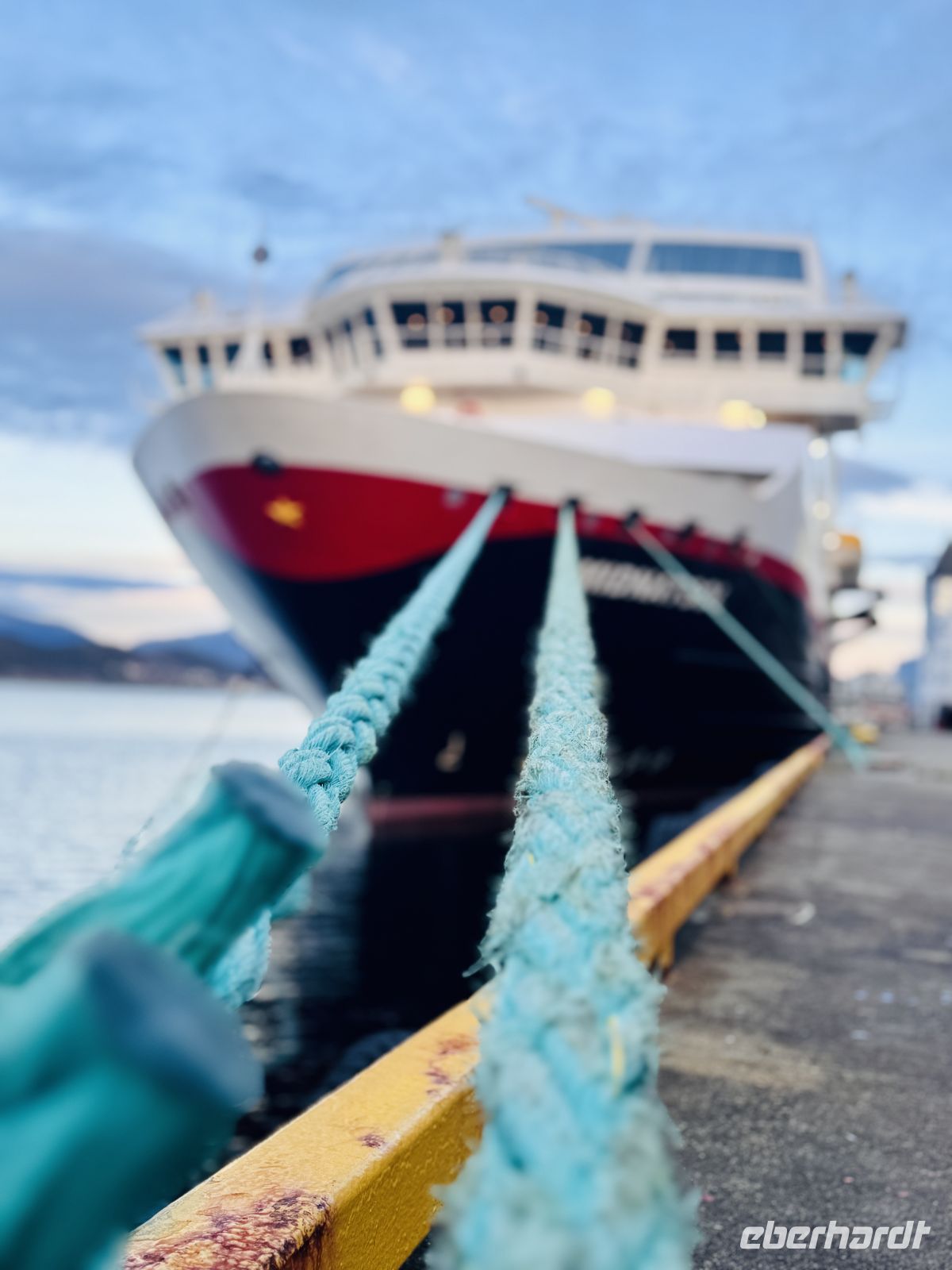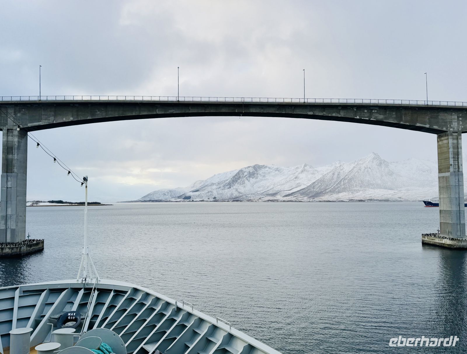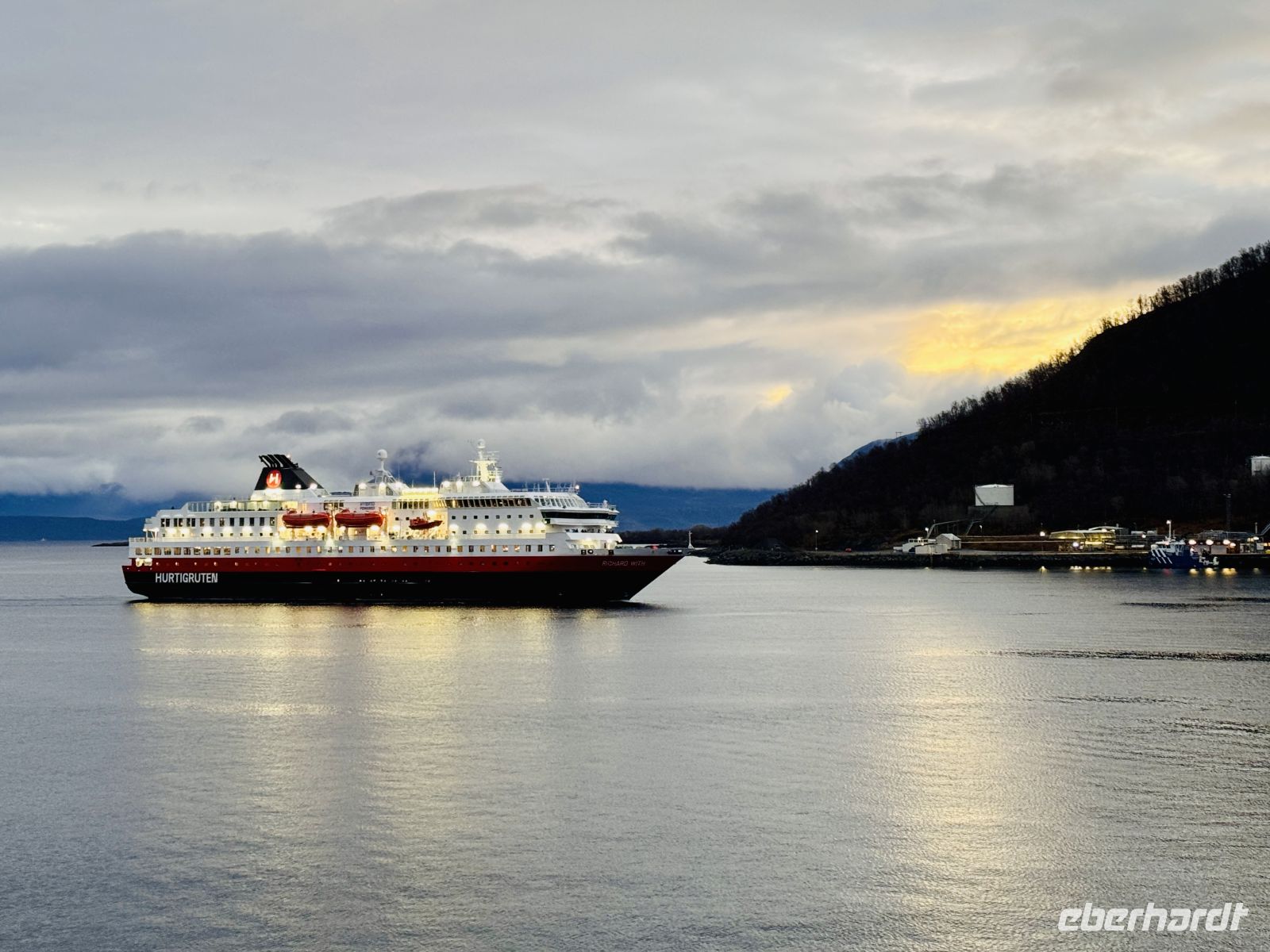 In Harstad machen wir einen kurzen Halt. Beim Ablegen begrüßen wir unser Schwesternschiff, die MS Richard With, mit einem freundlichen Hupen – die Freude über diese Begegnung ist auf beiden Seiten spürbar. Danach geht unsere Fahrt weiter in Richtung Tromsø. Zwischendurch legen wir noch einen kurzen Zwischenstopp in Finnsnes ein, bevor sich der Himmel langsam zuzieht und graue Wolken den Nachmittag einläuten.