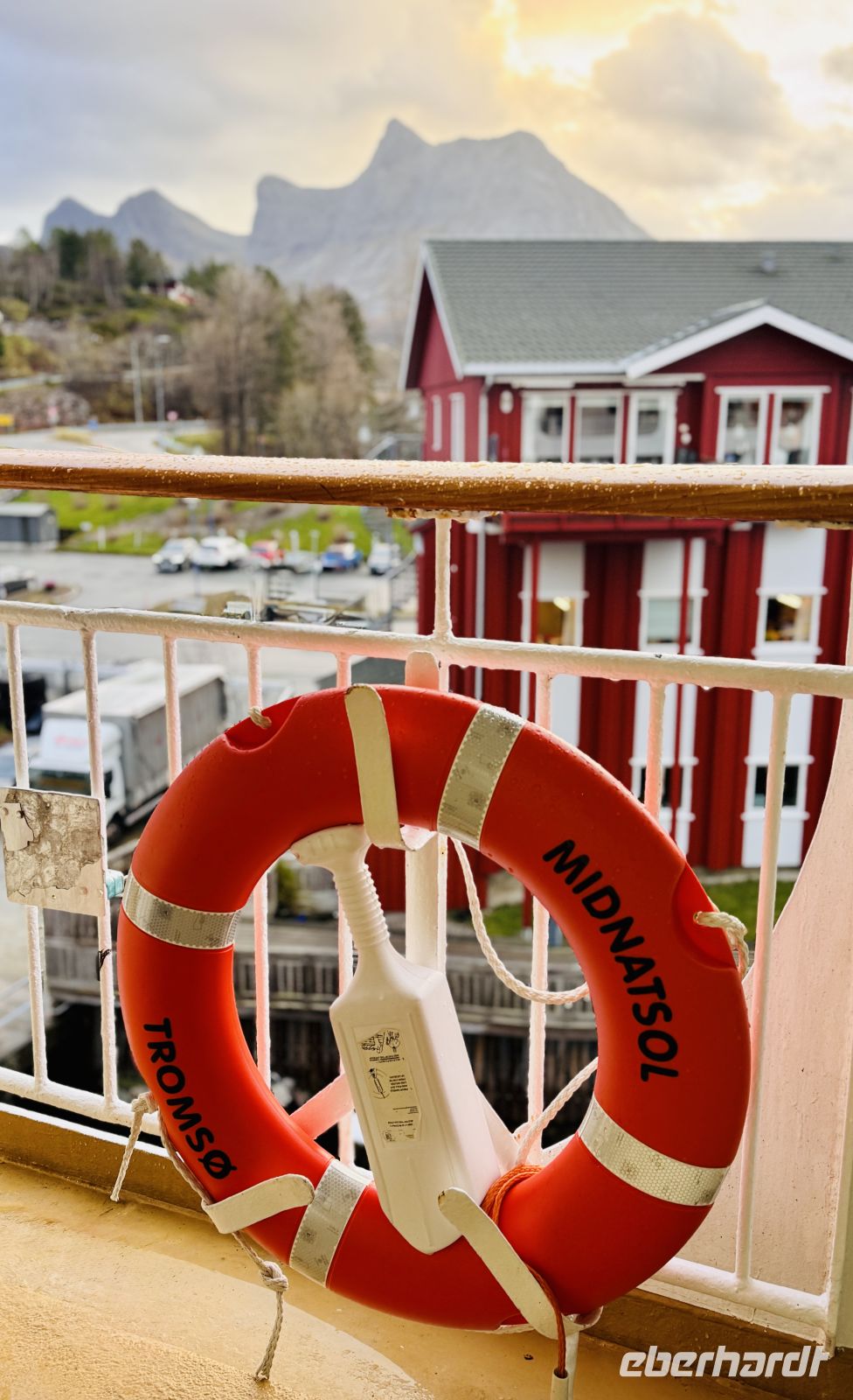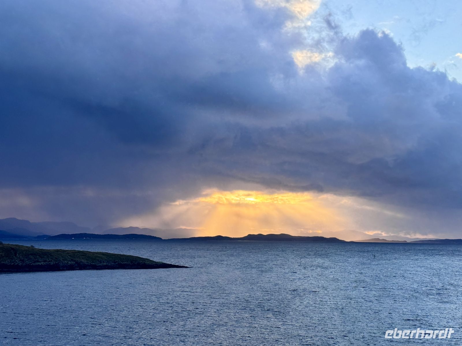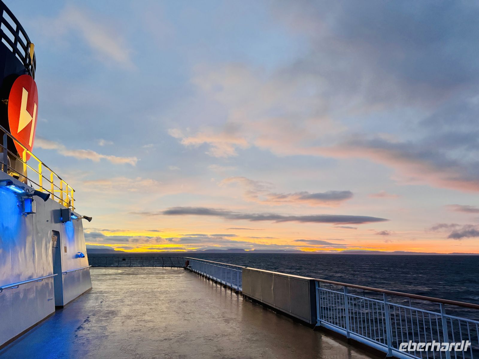Die Nacht ist noch einmal etwas unruhig, der Seegang spürbar – als wollte das Meer uns daran erinnern, dass wir uns wirklich auf einer Seereise befinden. Doch am frühen Morgen klart der Himmel langsam auf. Ein zarter Streifen Licht schiebt sich über den Horizont, die ersten Sonnenstrahlen brechen durch die Wolken und tauchen die Fjordlandschaft in ein goldenes Leuchten. So schön war der Morgen lange nicht mehr – ein perfekter Abschied von der See.