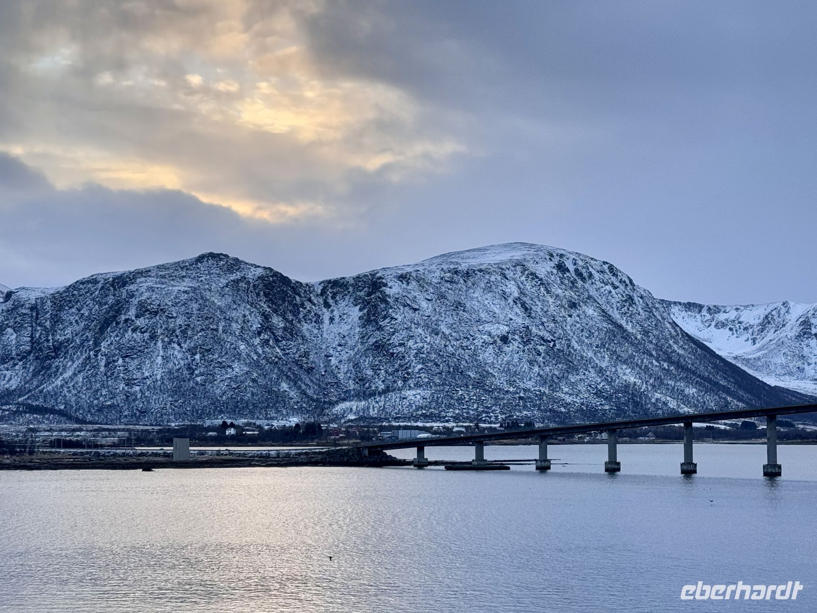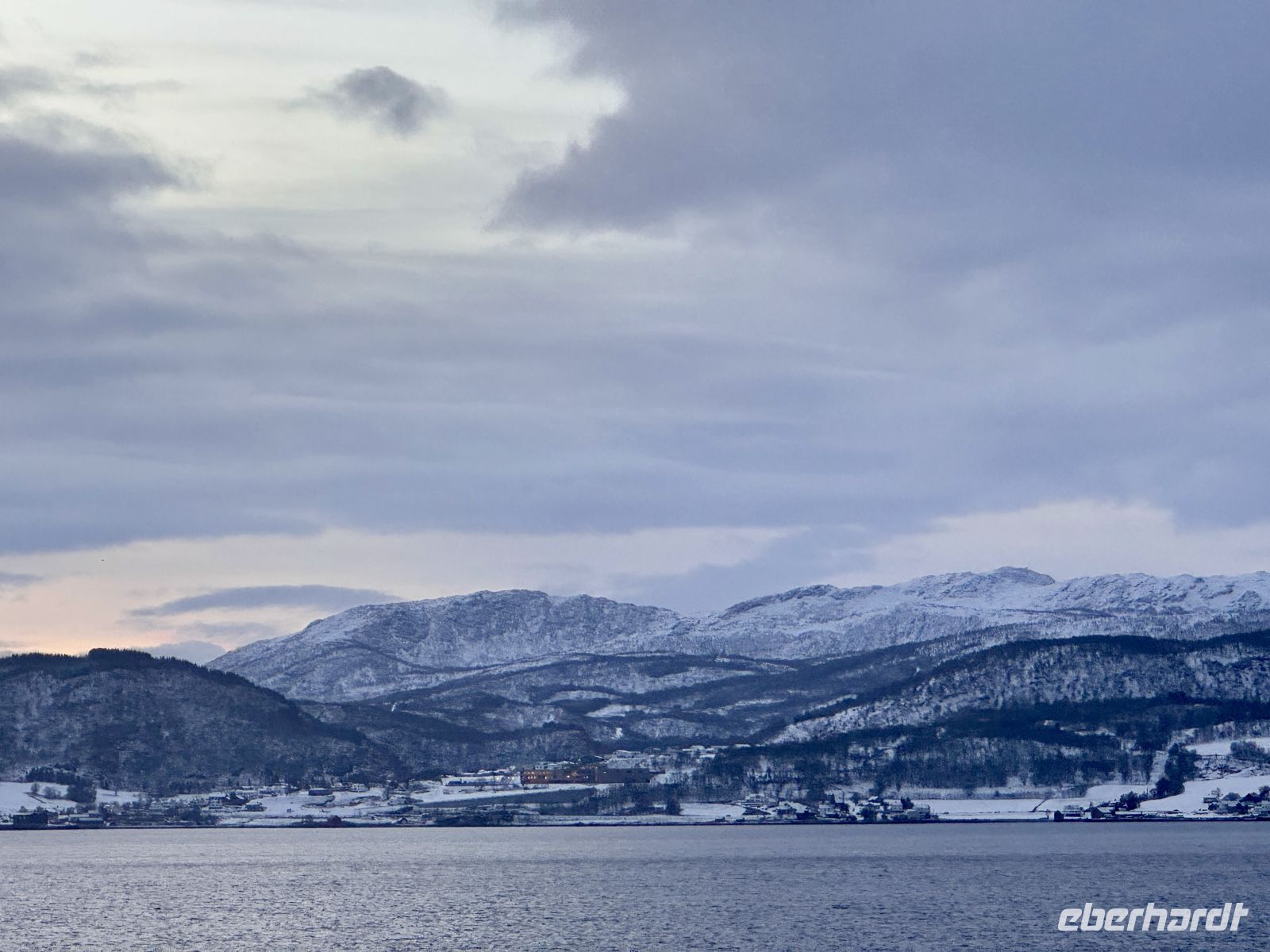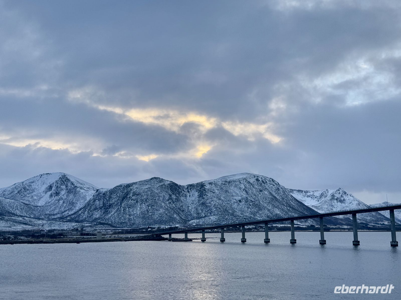 Bei Ørnes reißt der Himmel für einen Moment auf, und die Sonne lässt die leicht schneebedeckten Berggipfel der norwegischen Küste erstrahlen. Ein fast magischer Anblick nach dem grauen Start in den Tag.