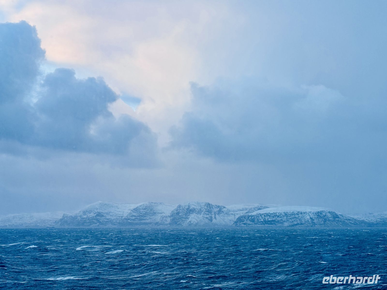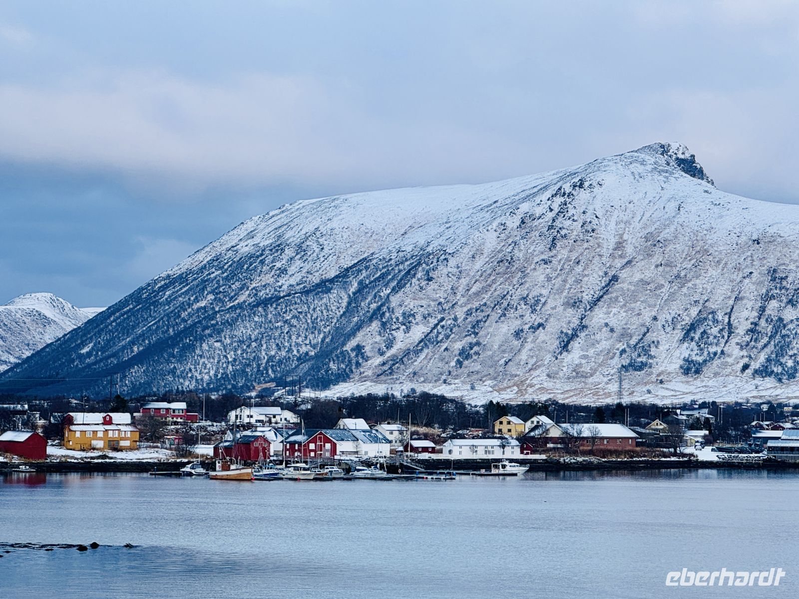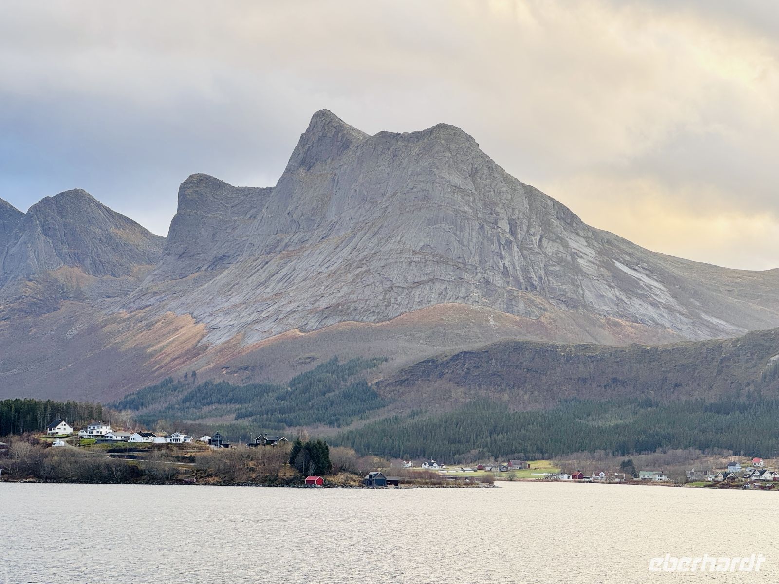 Bei Ørnes reißt der Himmel für einen Moment auf, und die Sonne lässt die leicht schneebedeckten Berggipfel der norwegischen Küste erstrahlen. Ein fast magischer Anblick nach dem grauen Start in den Tag.