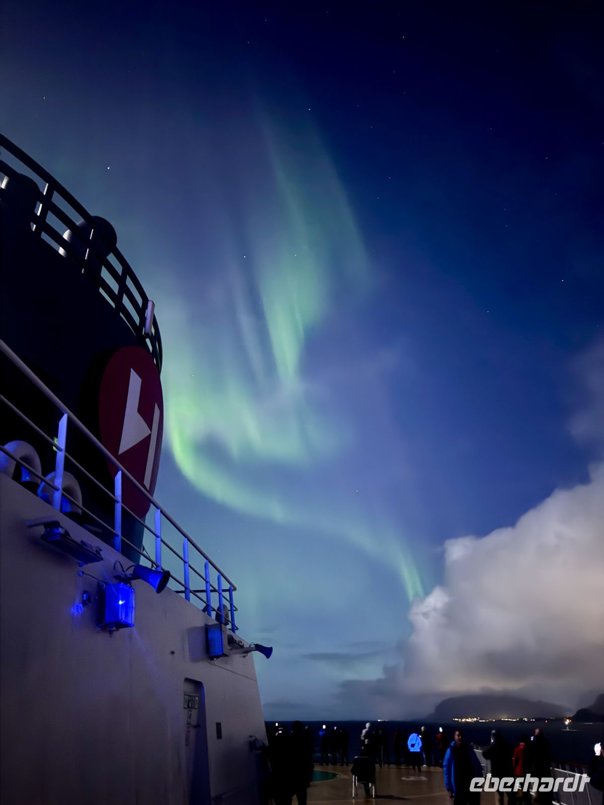 Am Nachmittag heißt es erneut „Leinen los“. Wir verlassen Bodø und steuern über den Vestfjord in Richtung Lofoten. Die Wellen sind inzwischen höher – fast drei Meter –, doch das Schiff trotzt dem Wind mit stoischer Ruhe. In der Ferne tauchen die ersten Konturen der Lofotenkette auf, steil, dunkel und geheimnisvoll. Und dann, wie zur Belohnung, erscheint über dem Meer ein zarter grüner Schleier: unsere ersten Polarlichter. Zart, flirrend und fast scheu tanzen sie am Himmel – ein unvergesslicher Moment, der uns alle an Deck lockt.