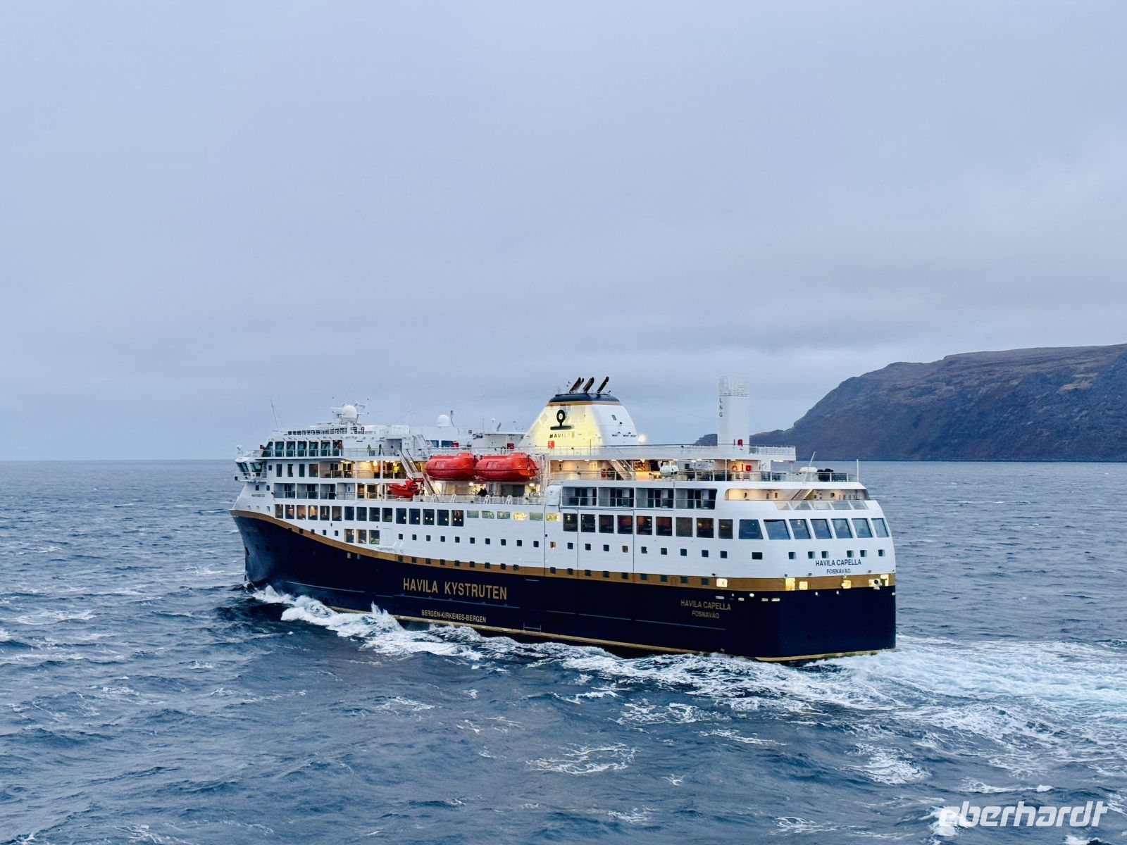 Eigentlich sollte uns der Vormittag nach Hammerfest führen – in die nördlichste Stadt Europas, wo die Struve-Meridiansäule und die moderne Kirche vom Wiederaufbau und Forschergeist der Menschen erzählen. Doch der Sturm ist zu stark - an ein sicheres Anlegen in Hammerfest ist nicht zu denken. So bleibt uns nichts anderes, als weiterzufahren – südwärts, entlang der schroffen Küste, während Wind und Wellen unser ständiger Begleiter sind.
