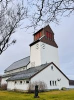 Am Nachmittag erreichen wir Brønnøysund – den geografischen Mittelpunkt Norwegens. Der leichte Regen begleitet uns bei unserem Spaziergang durch den kleinen, charmanten Ort. Zuerst besuchen wir den Punkt, der als „Mitte Norwegens“ markiert ist – ein unscheinbares Schild mit großer Bedeutung, das uns noch einmal vor Augen führt, wie weit wir auf unserer Reise bereits gekommen sind. Anschließend spazieren wir weiter zur Brønnøy-Kirche, die mit ihren grauen Steinmauern und dem spitzen Turm über dem Hafen thront. Auch wenn wir sie nur von außen betrachten, ist sie ein beeindruckendes Bauwerk – ruhig, beständig und fest verwurzelt in dieser nordischen Landschaft.