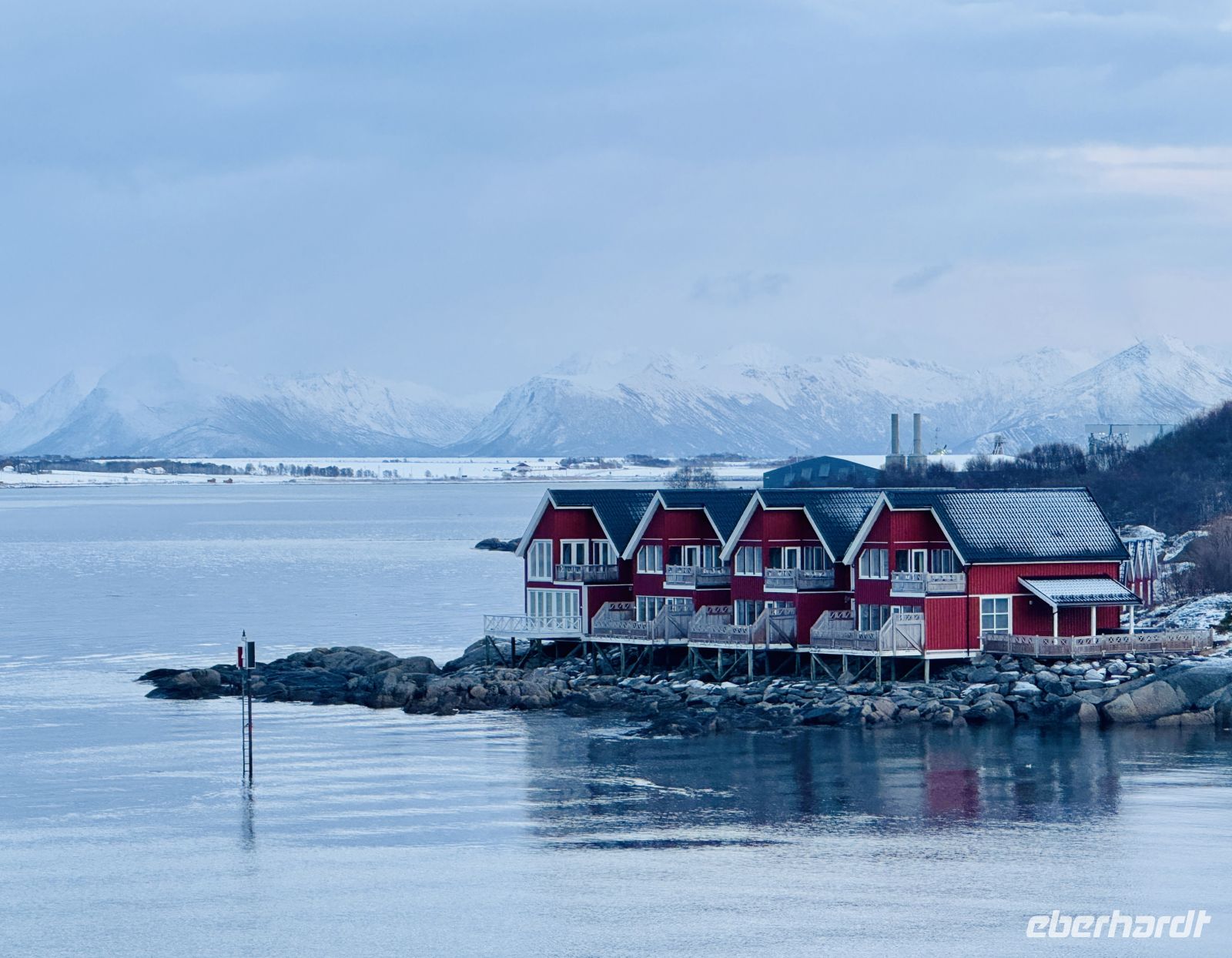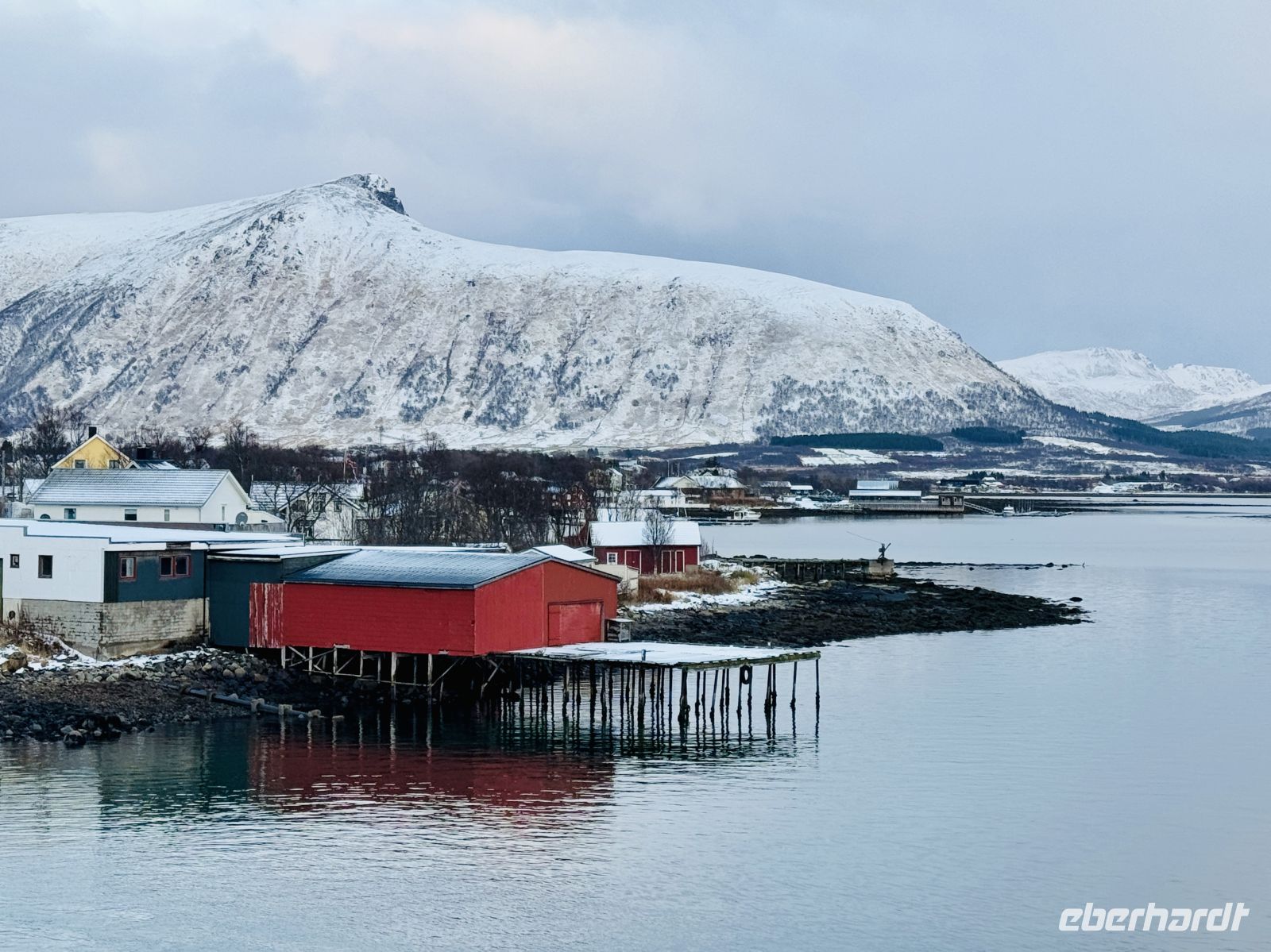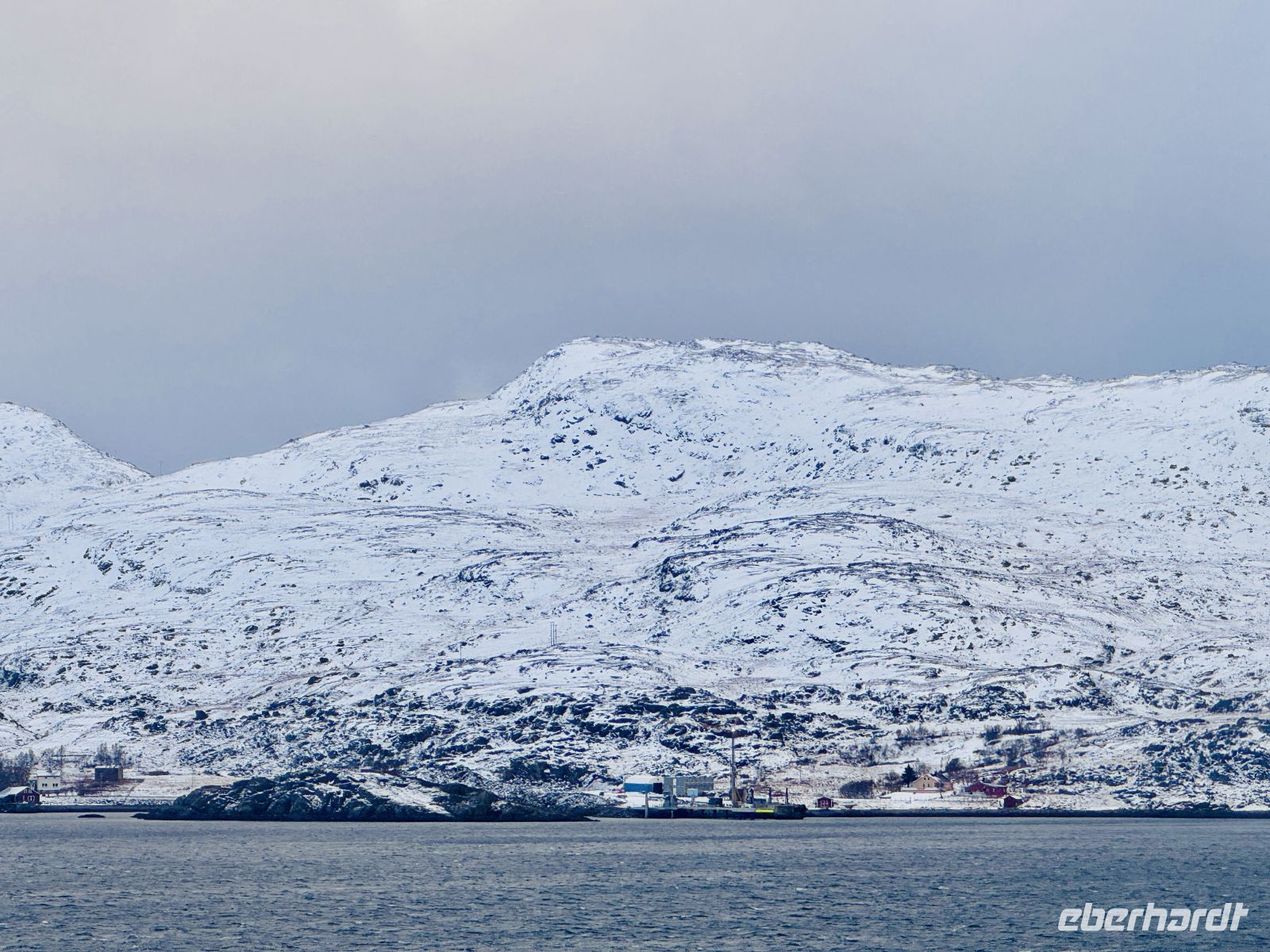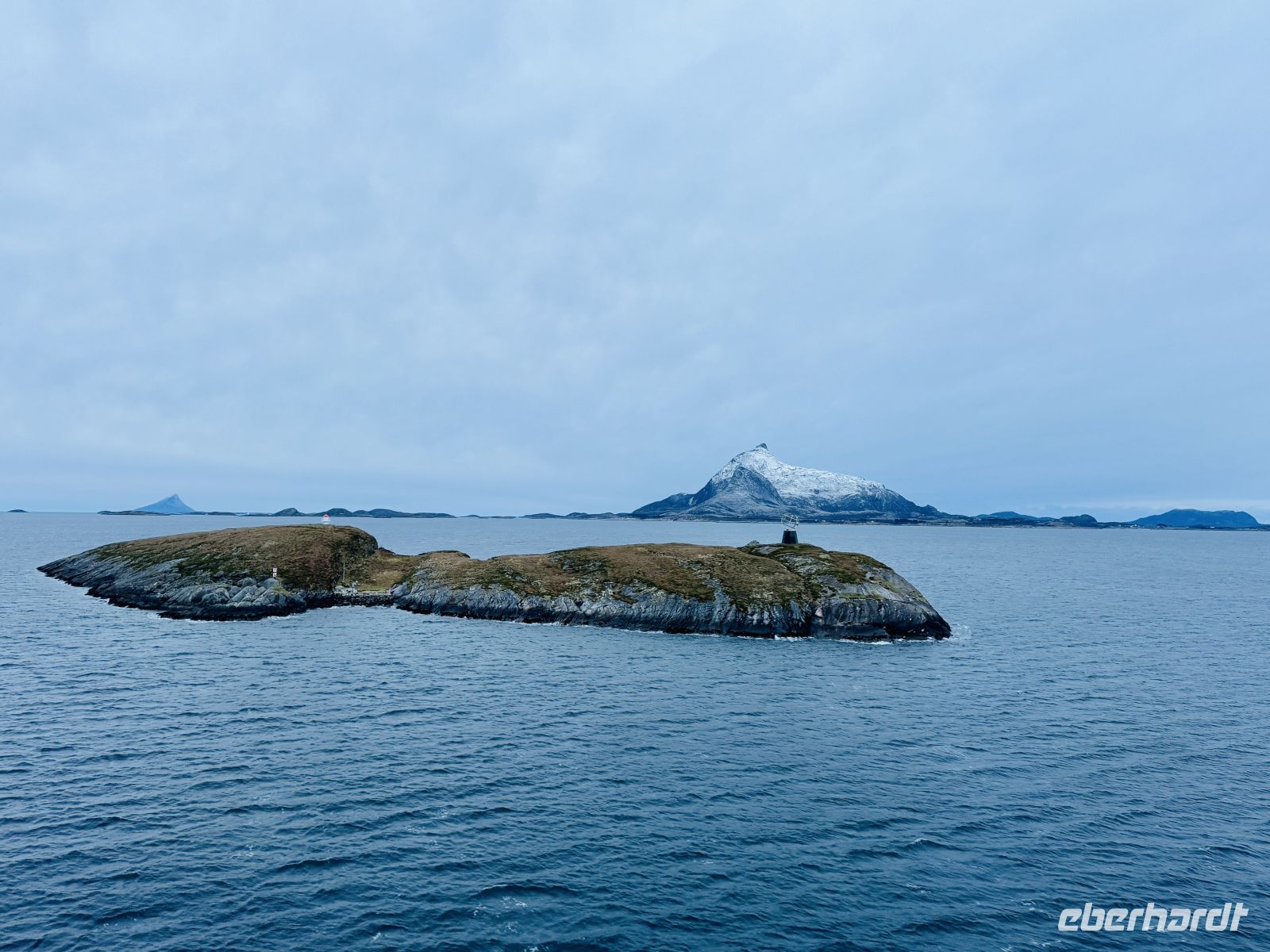 Während wir weiterfahren, gleitet das Schiff entlang der eindrucksvollen Helgelandküste. Die Landschaft wirkt geheimnisvoll unter der tiefhängenden Wolkendecke – felsige Inseln, schneebedeckte Hügel und immer wieder kleine rote Fischerhütten, die leuchtende Farbtupfer in der gedämpften Winterkulisse setzen. Am Horizont liegt die legendäre Bergkette der Sieben Schwestern. Heute allerdings haben sie sich gut versteckt – ihre Gipfel verschwinden vollständig in den Wolken, als wollten sie sich dem Blick entziehen. Nur ihre Umrisse zeichnen sich schemenhaft gegen den grauen Himmel ab.