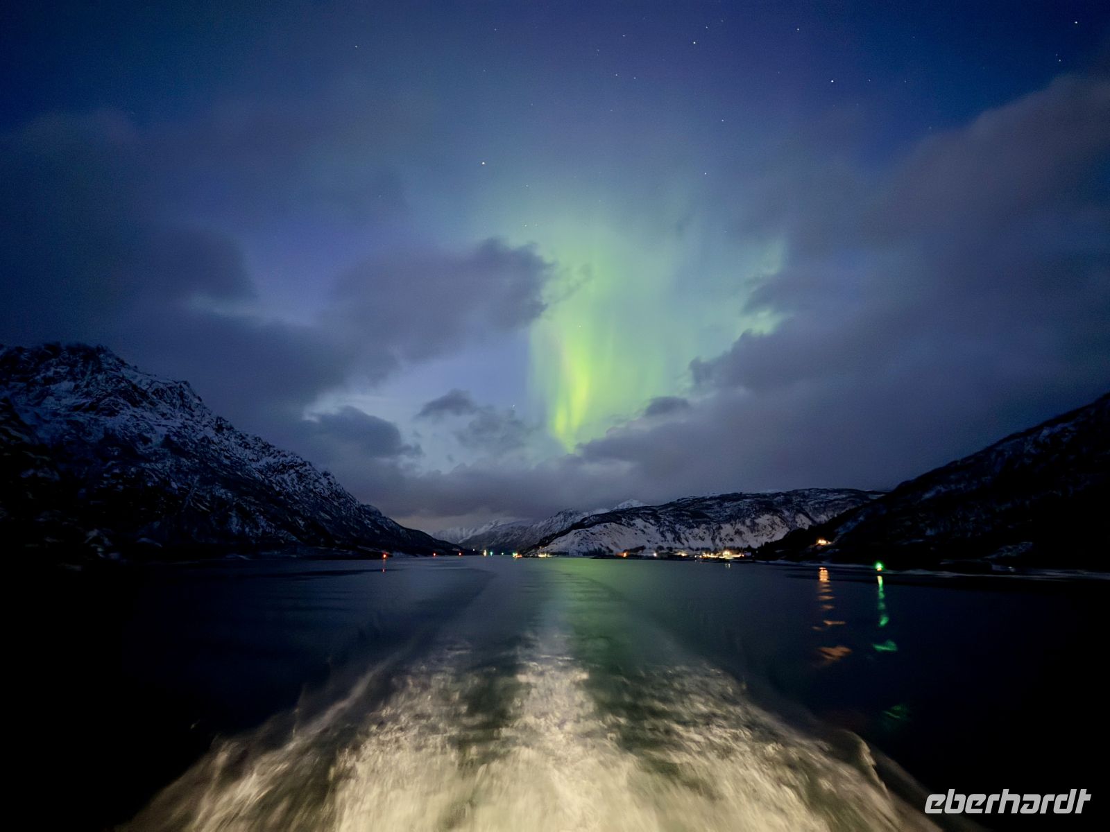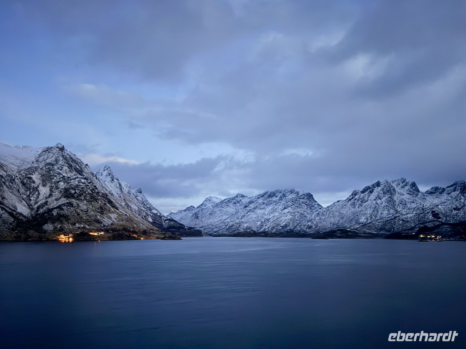 Später legt unser Schiff wieder ab. Durch die verschneite Nacht folgen wir der Lofotenkette, deren Konturen im Dunkel der Nacht kaum zu erkennen sind. Dann öffnet sich der Vestfjord vor uns – still, weit und geheimnisvoll - und damit nehmen wir Kurs zurück aufs Festland.