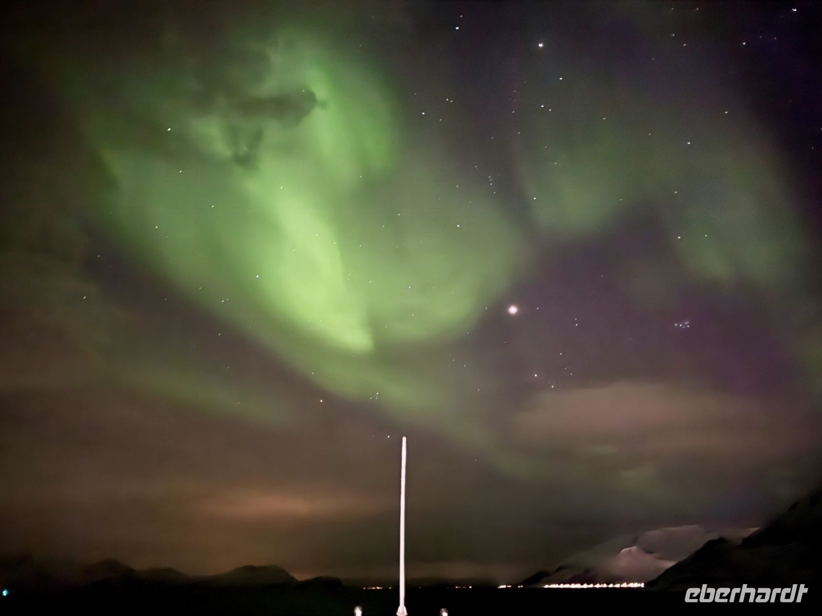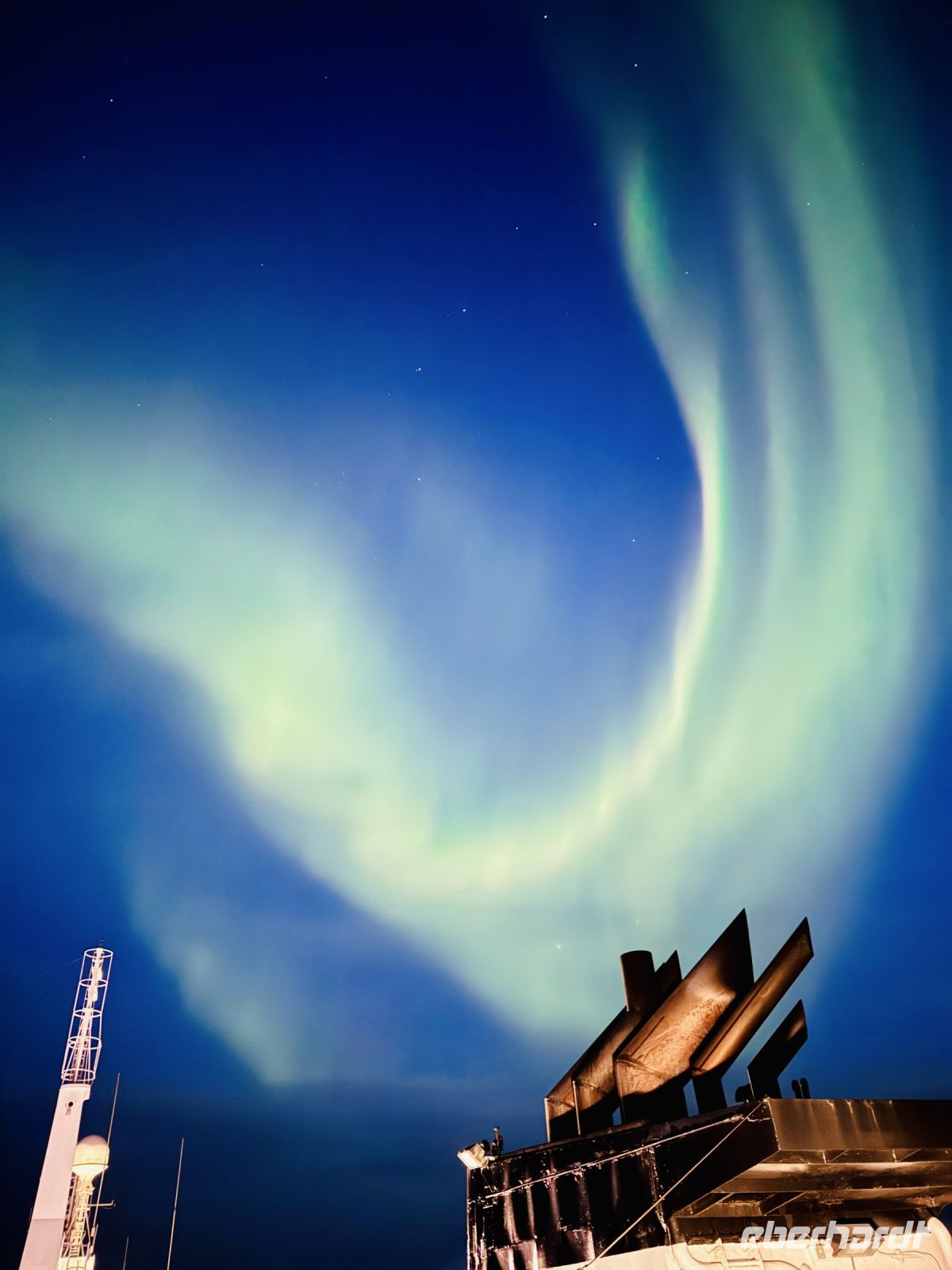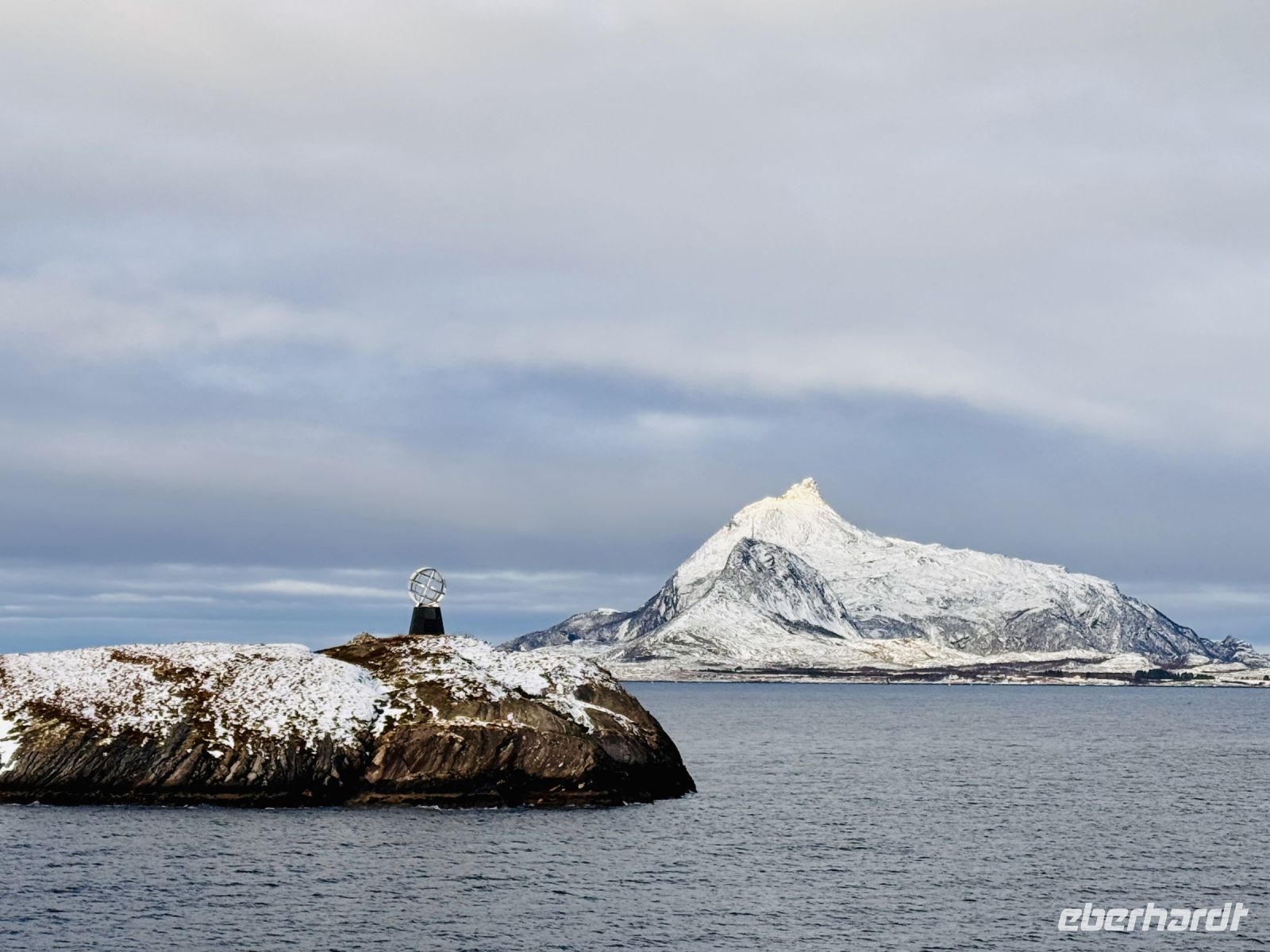 Der Tag beginnt mit dem dumpfen Prasseln von Regen und Schneeregen gegen die Fenster. Draußen ist es grau, der Himmel schwer von tiefhängenden Wolken, die über das unruhige Wasser ziehen. Der Wind rüttelt am Schiff, während wir langsam auf Hammerfest zusteuern. Als wir anlegen – aufgrund von Bauarbeiten im Hafen gut 2,5 Kilometer vom Stadtzentrum entfernt – zieht es uns dennoch nach draußen. Warm eingepackt machen wir uns auf den Weg zur Struve-Meridiansäule. Der Wind bläst uns eisig ins Gesicht, Schneeregen peitscht gegen unsere Jacken, doch wir lassen uns nicht beirren. Ein kurzer Spaziergang führt uns zu diesem geschichtsträchtigen Punkt, der an die erste exakte Vermessung der Erde erinnert. Von hier aus bietet sich uns ein Blick über die schroffe Küstenlinie. Lange halten wir es jedoch nicht aus – der eisige Wind und der unaufhörliche Niederschlag treiben uns bald wieder zurück zum Schiff. Zurück an Bord wird schnell klar: Es wird ein bewegter Nachmittag. Die Wellen erreichen bis zu 3,5 Meter, und das Schaukeln ist allgegenwärtig. Während einige sich mit einem Buch oder heißen Getränken in eine Ecke zurückziehen, kämpfen andere eher mit der eigenen Standfestigkeit. Gespräche verstummen gelegentlich, wenn eine besonders hohe Welle das Schiff durchrüttelt. An Ruhe ist nicht zu denken, aber immerhin gibt es genug zu erzählen – sei es über das raue Wetter oder darüber, wer den Seegang am besten wegsteckt. Am späten Abend, als wir Tromsø erreichen, wagen einige von uns noch einen Ausflug in die Stadt. In der stimmungsvollen Atmosphäre des Mitternachtskonzerts lassen sie sich von Musik verzaubern, während wir anderen den Tag ruhig ausklingen lassen. Polarlichter sind heute nicht zu sehen – der Himmel bleibt wolkenverhangen. Aber nach diesem schaukelnden Tag reicht es auch völlig aus, einfach ein wenig zur Ruhe zu kommen.