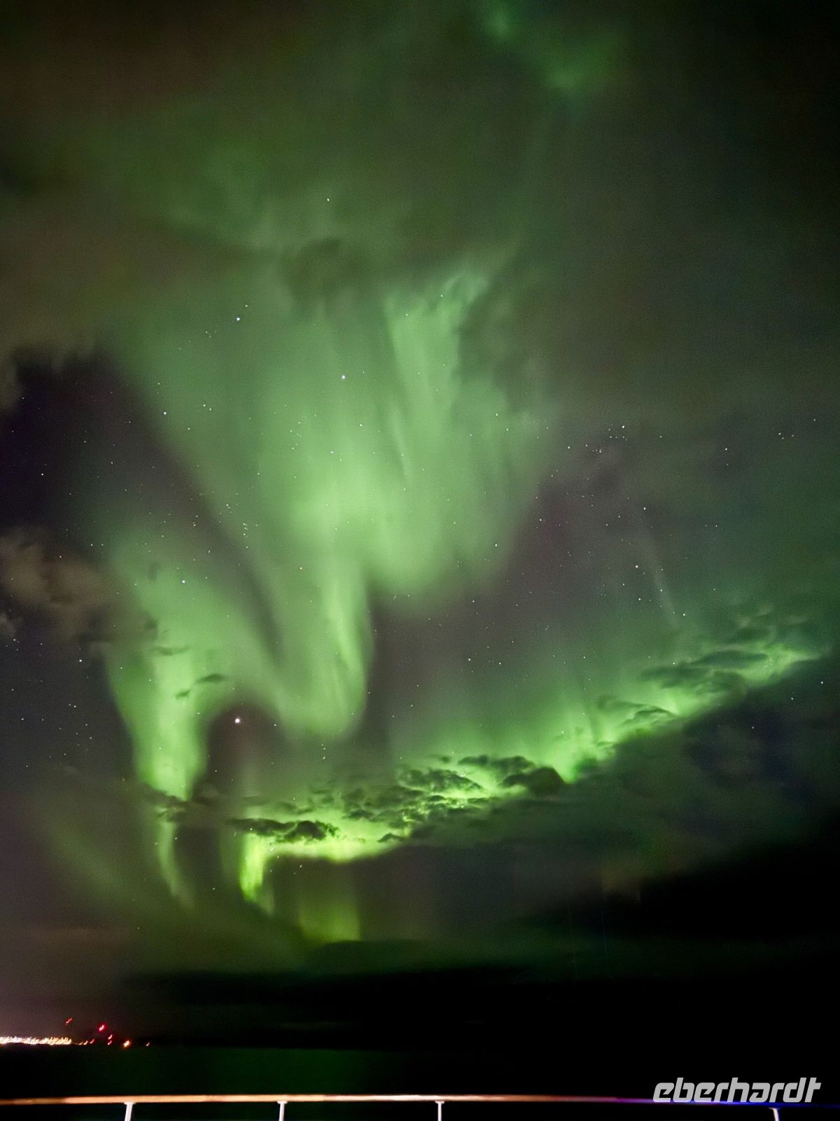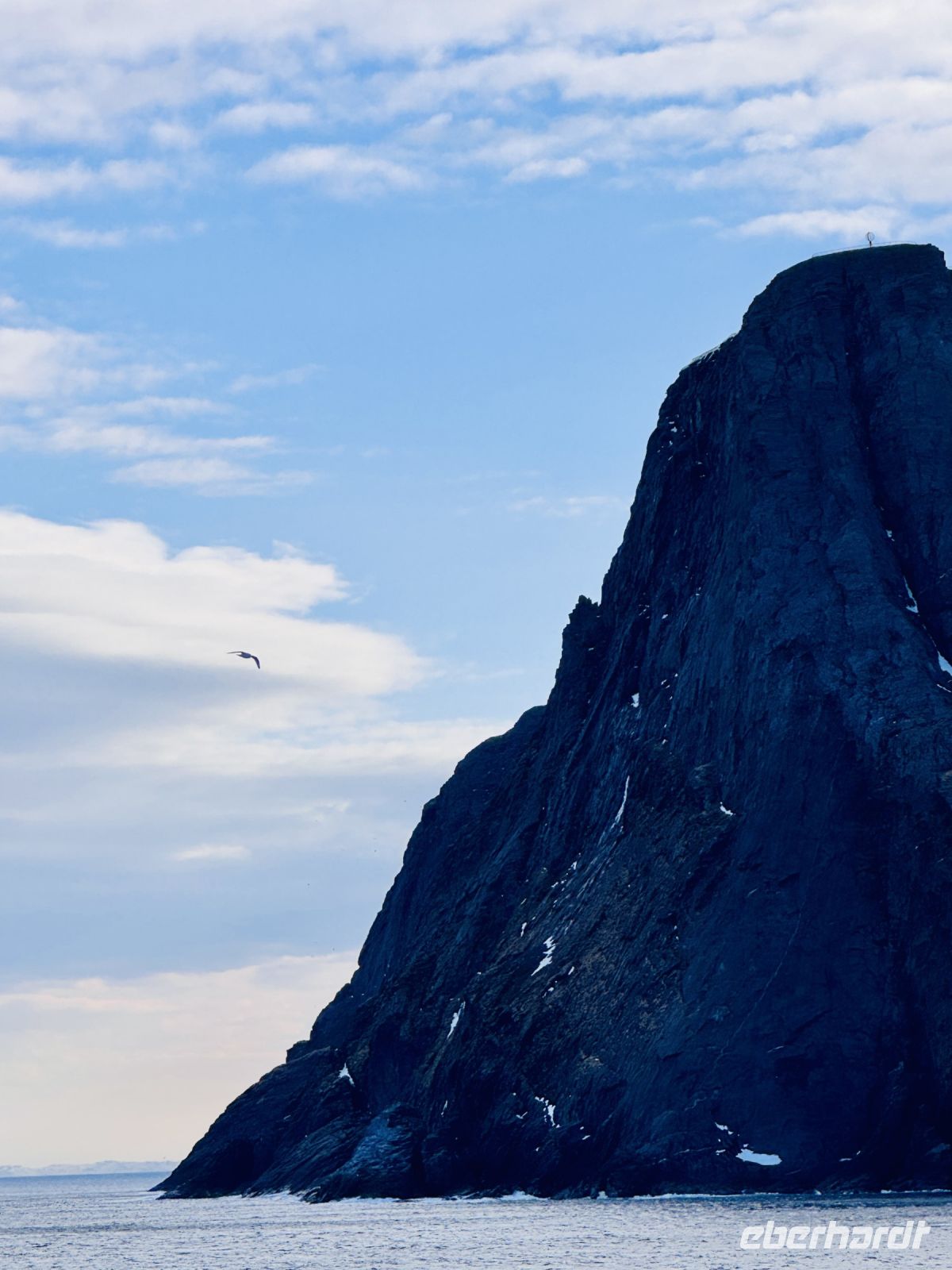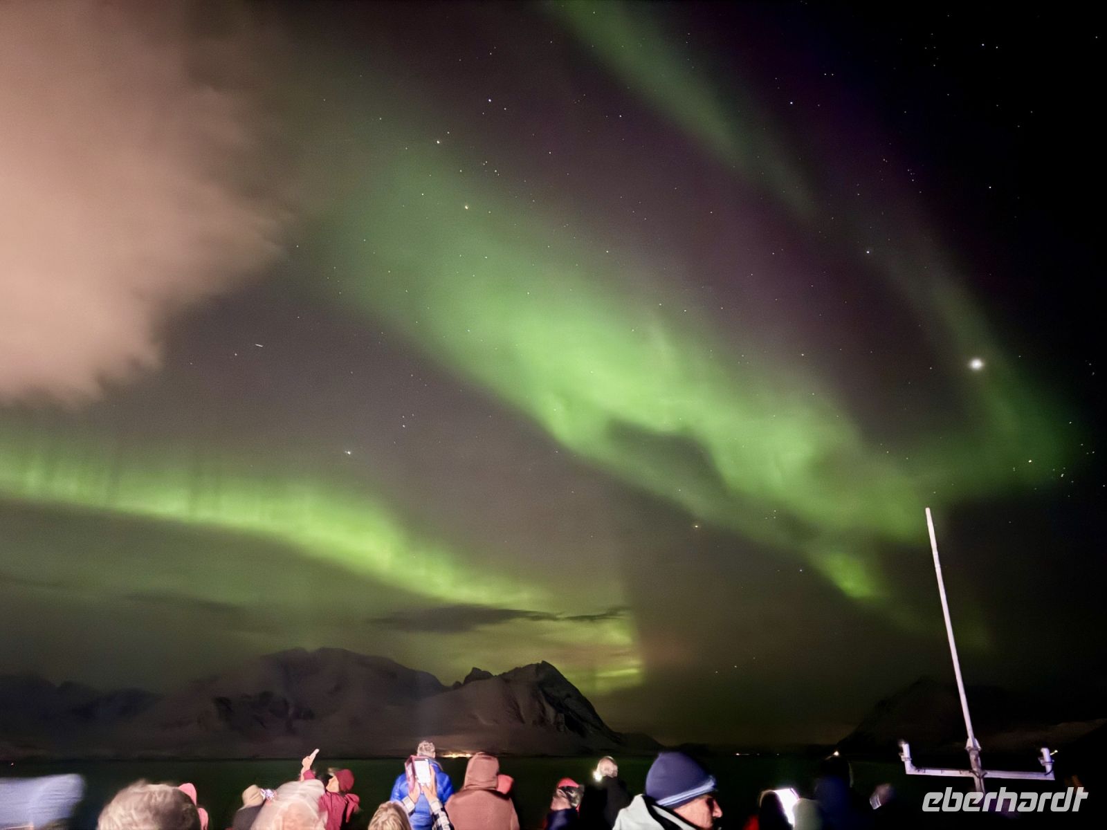 Der Tag beginnt mit dem dumpfen Prasseln von Regen und Schneeregen gegen die Fenster. Draußen ist es grau, der Himmel schwer von tiefhängenden Wolken, die über das unruhige Wasser ziehen. Der Wind rüttelt am Schiff, während wir langsam auf Hammerfest zusteuern. Als wir anlegen – aufgrund von Bauarbeiten im Hafen gut 2,5 Kilometer vom Stadtzentrum entfernt – zieht es uns dennoch nach draußen. Warm eingepackt machen wir uns auf den Weg zur Struve-Meridiansäule. Der Wind bläst uns eisig ins Gesicht, Schneeregen peitscht gegen unsere Jacken, doch wir lassen uns nicht beirren. Ein kurzer Spaziergang führt uns zu diesem geschichtsträchtigen Punkt, der an die erste exakte Vermessung der Erde erinnert. Von hier aus bietet sich uns ein Blick über die schroffe Küstenlinie. Lange halten wir es jedoch nicht aus – der eisige Wind und der unaufhörliche Niederschlag treiben uns bald wieder zurück zum Schiff. Zurück an Bord wird schnell klar: Es wird ein bewegter Nachmittag. Die Wellen erreichen bis zu 3,5 Meter, und das Schaukeln ist allgegenwärtig. Während einige sich mit einem Buch oder heißen Getränken in eine Ecke zurückziehen, kämpfen andere eher mit der eigenen Standfestigkeit. Gespräche verstummen gelegentlich, wenn eine besonders hohe Welle das Schiff durchrüttelt. An Ruhe ist nicht zu denken, aber immerhin gibt es genug zu erzählen – sei es über das raue Wetter oder darüber, wer den Seegang am besten wegsteckt. Am späten Abend, als wir Tromsø erreichen, wagen einige von uns noch einen Ausflug in die Stadt. In der stimmungsvollen Atmosphäre des Mitternachtskonzerts lassen sie sich von Musik verzaubern, während wir anderen den Tag ruhig ausklingen lassen. Polarlichter sind heute nicht zu sehen – der Himmel bleibt wolkenverhangen. Aber nach diesem schaukelnden Tag reicht es auch völlig aus, einfach ein wenig zur Ruhe zu kommen.