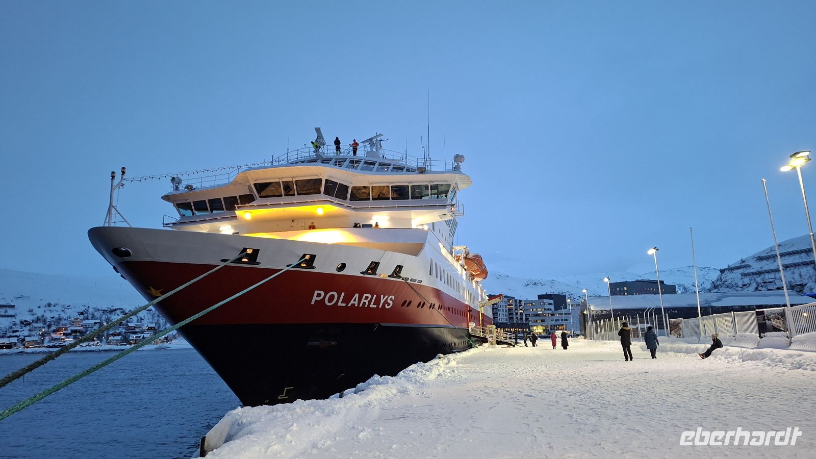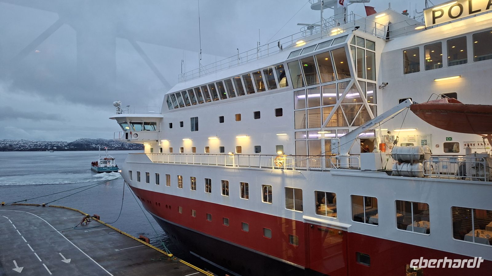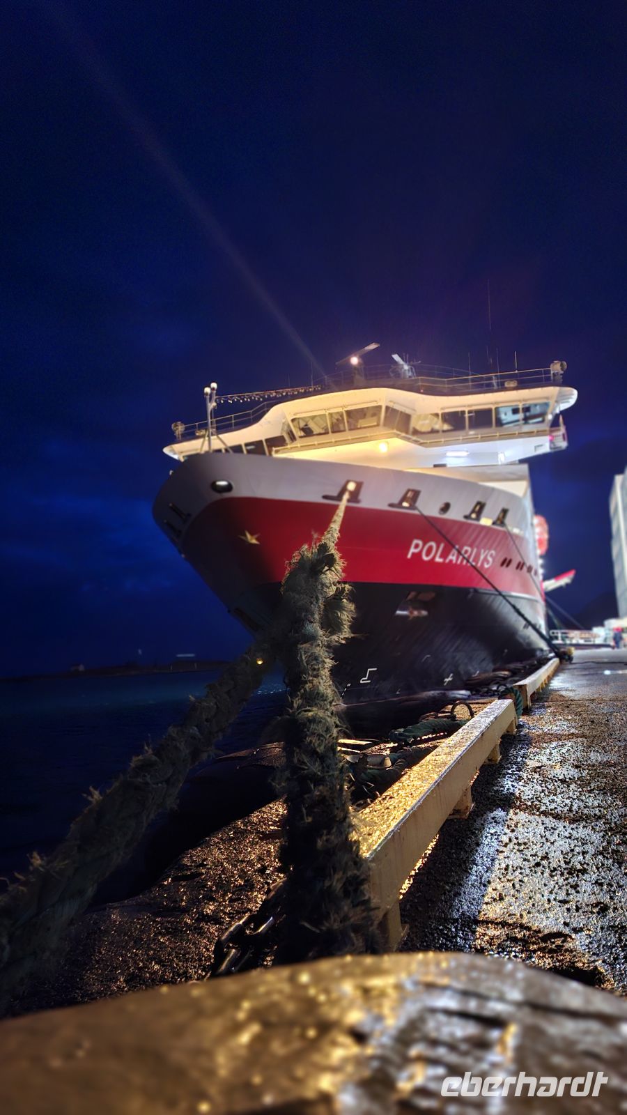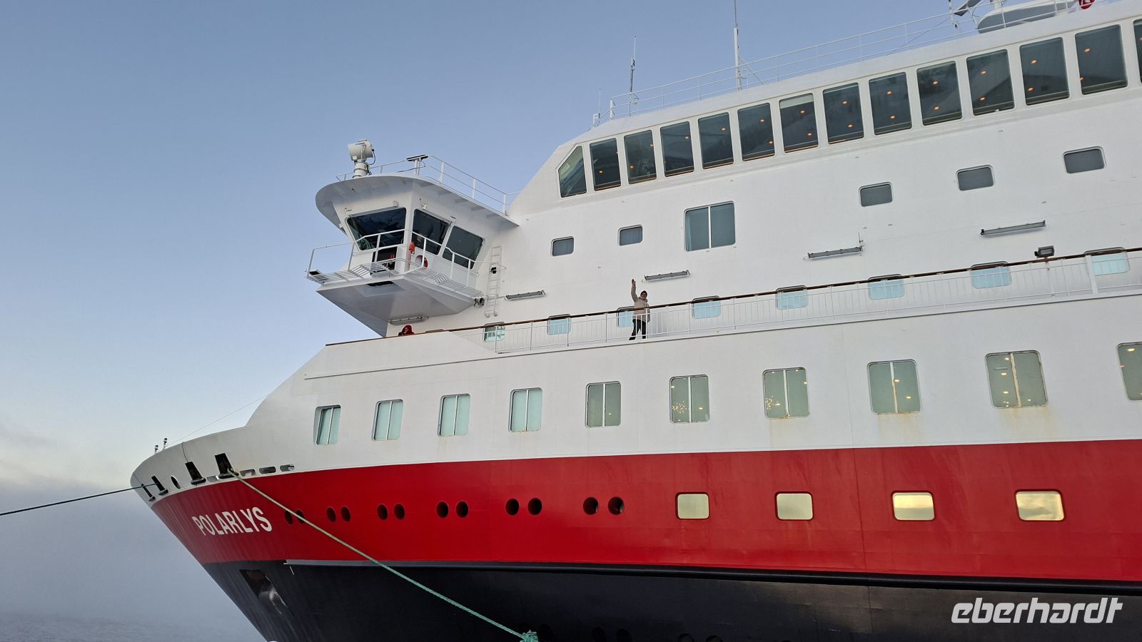 Dann war es so weit: Die MS Polarlys von Hurtigruten, unser zukünftiges schwimmendes Zuhause, lief in den Hafen ein. Die Polarlys ist ein klassisches Postschiff der norwegischen Küstenroute – nicht nur Kreuzfahrtschiff, sondern auch Versorger für die kleinen Küstenorte. Genau diese Kombination macht die Reise so authentisch: Wir waren nicht nur Touristen, sondern ein kleines Stück Alltag an der norwegischen Küste.