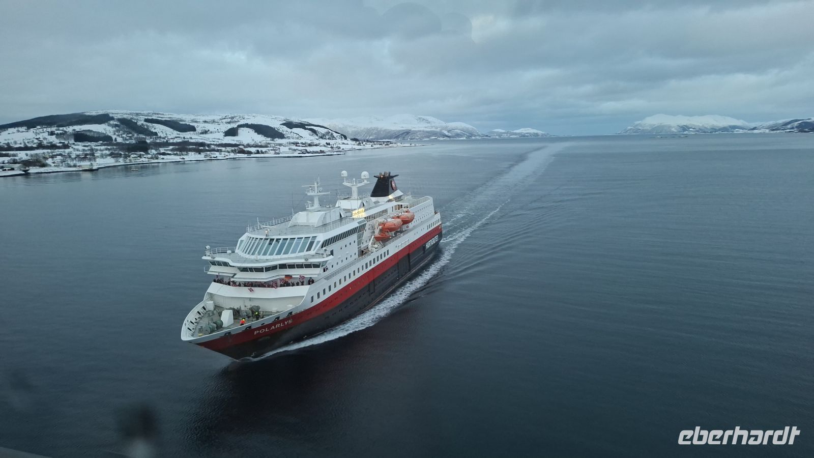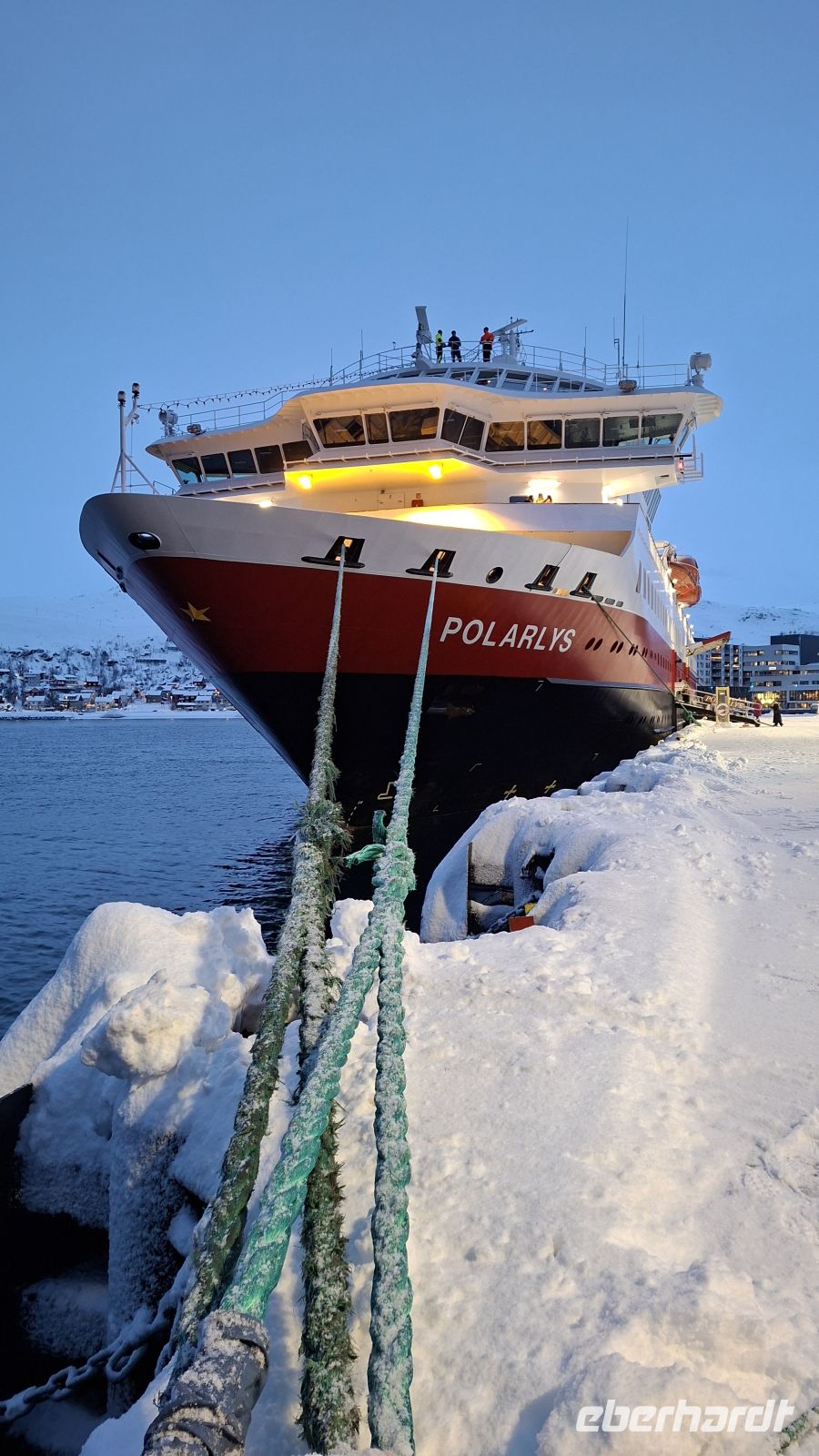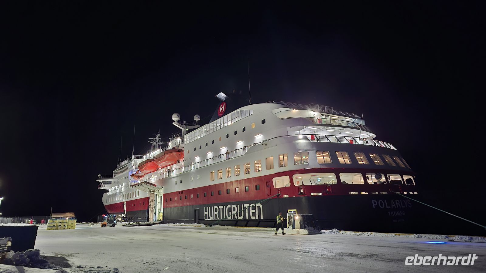 Dann war es so weit: Die MS Polarlys von Hurtigruten, unser zukünftiges schwimmendes Zuhause, lief in den Hafen ein. Die Polarlys ist ein klassisches Postschiff der norwegischen Küstenroute – nicht nur Kreuzfahrtschiff, sondern auch Versorger für die kleinen Küstenorte. Genau diese Kombination macht die Reise so authentisch: Wir waren nicht nur Touristen, sondern ein kleines Stück Alltag an der norwegischen Küste.