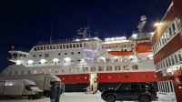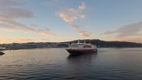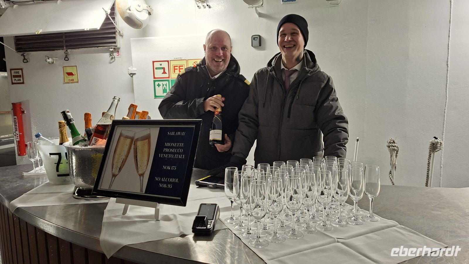 Wir gingen an Bord, sind erst einmal angekommen, haben unsere Kabinen bezogen und fleißig Ausflüge gebucht – schließlich wollten wir unterwegs nichts verpassen. Beim ersten gemeinsamen Abendessen in Buffet-Form probierten wir uns durch die Auswahl, von „mutig-nordisch“ bis „lieber-klassisch“ war alles dabei. Satt und zufrieden ging es anschließend an Deck: Beim Ablegen stießen wir mit einem Glas Champagner an und genossen die tolle Sicht auf den erleuchteten Hafen von Bergen, der langsam hinter uns kleiner wurde. Zum anschließenden Willkommenstreffen erfuhren wir alles Wichtige zum Schiff und lernten dabei gleich die wichtige Mannschaft des Schiffes sowie unseren Expeditions-Manager Jan kennen.