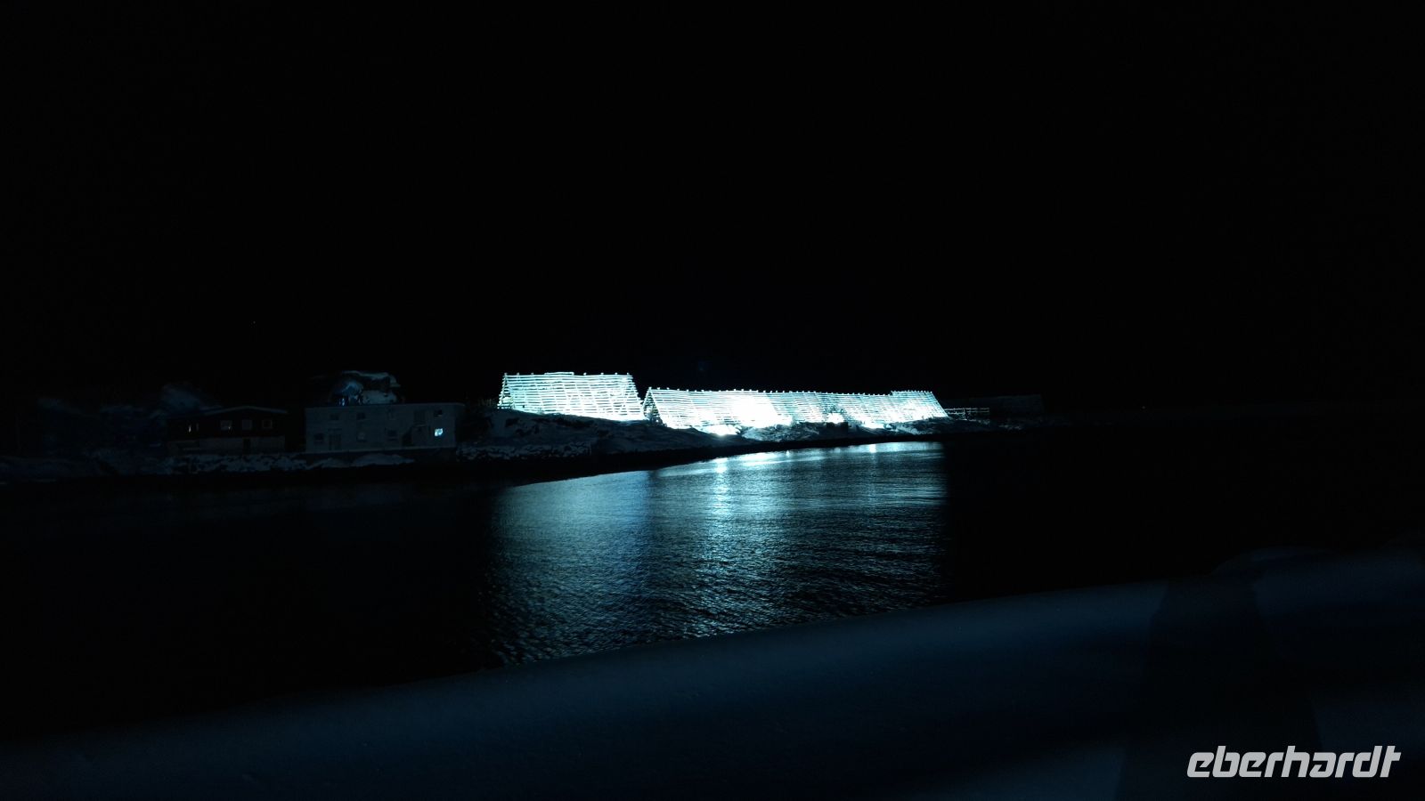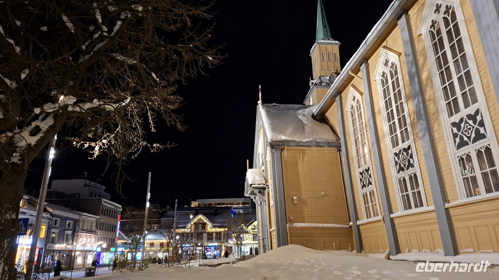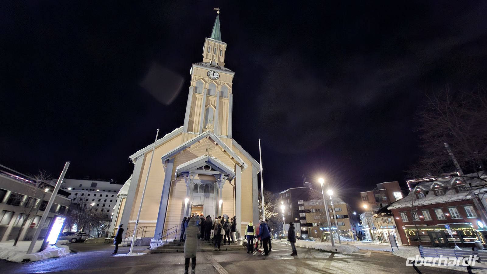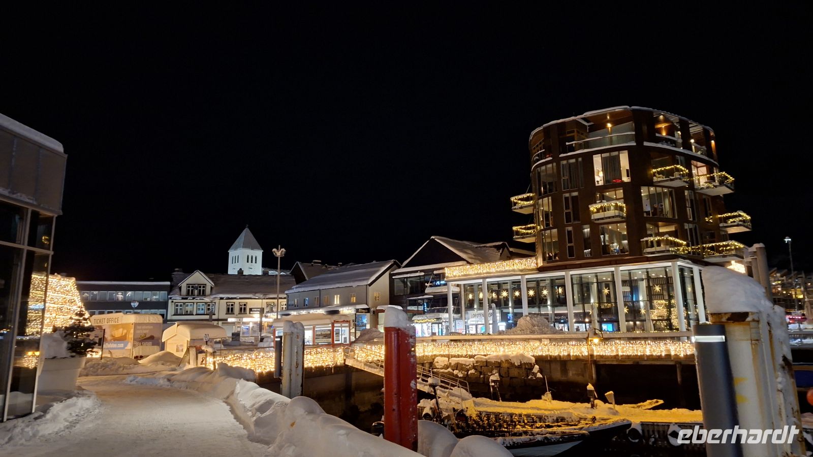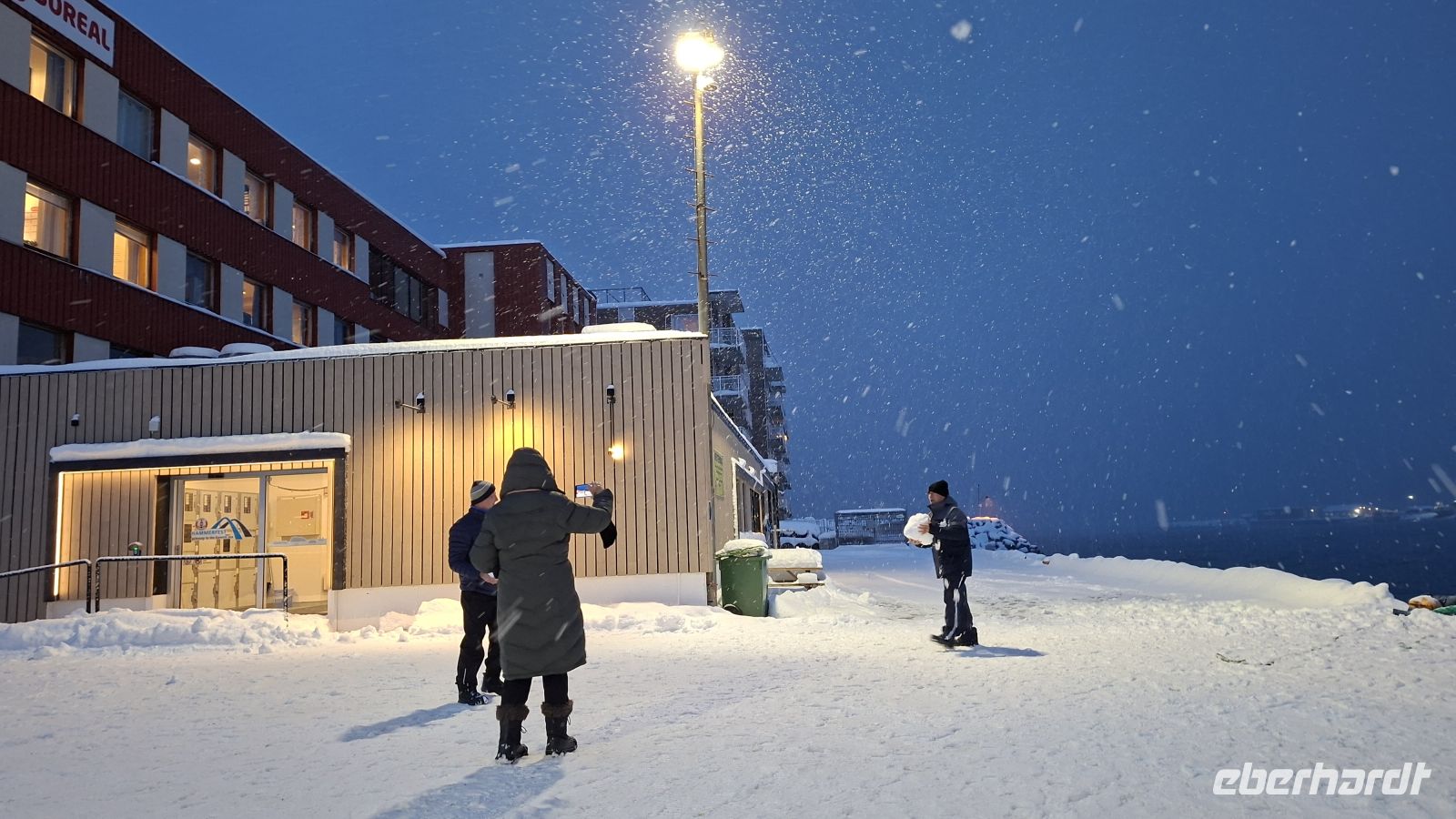 In der Nacht erreichten wir erneut Tromsø. Diesmal erlebten wir die Stadt in einem ganz anderen Licht – nämlich im nächtlichen. Einige Gäste unternahmen einen Spaziergang zur Tromsø Domkirke, der hübschen Holzkirche im Zentrum, und erlebten ein besonderes Mitternachtskonzert. Andere drehten noch eine kleine Runde durch die stille Stadt. Lichter spiegelten sich im Schnee und im Wasser, und die Straßen wirkten ruhiger, fast vertraut, als hätten wir Tromsø schon ein bisschen ins Herz geschlossen.