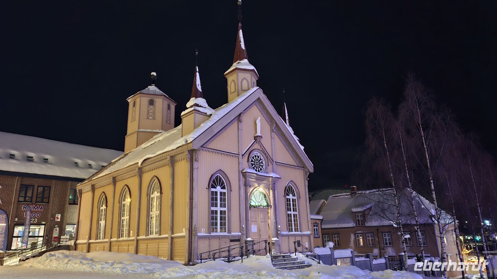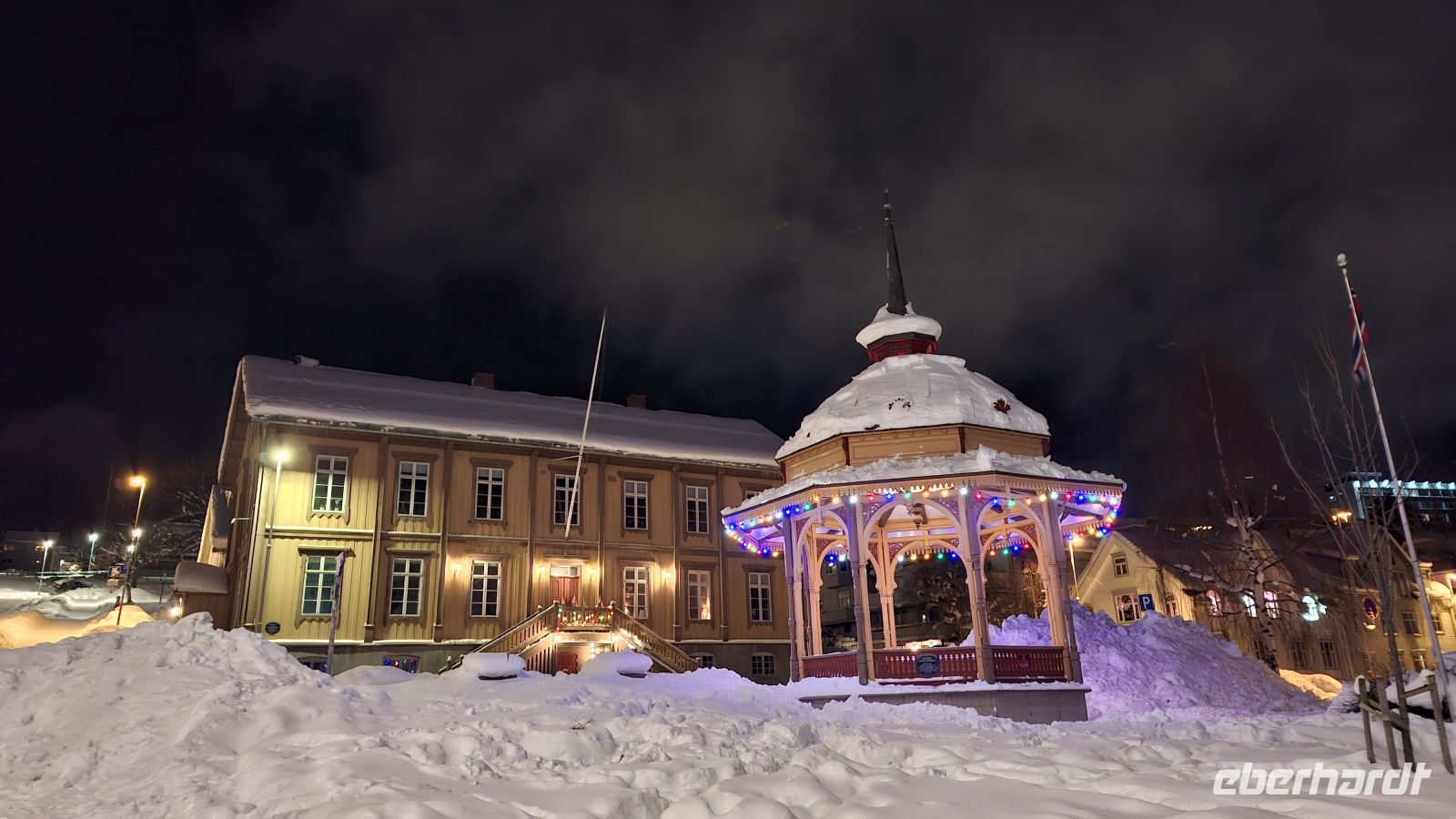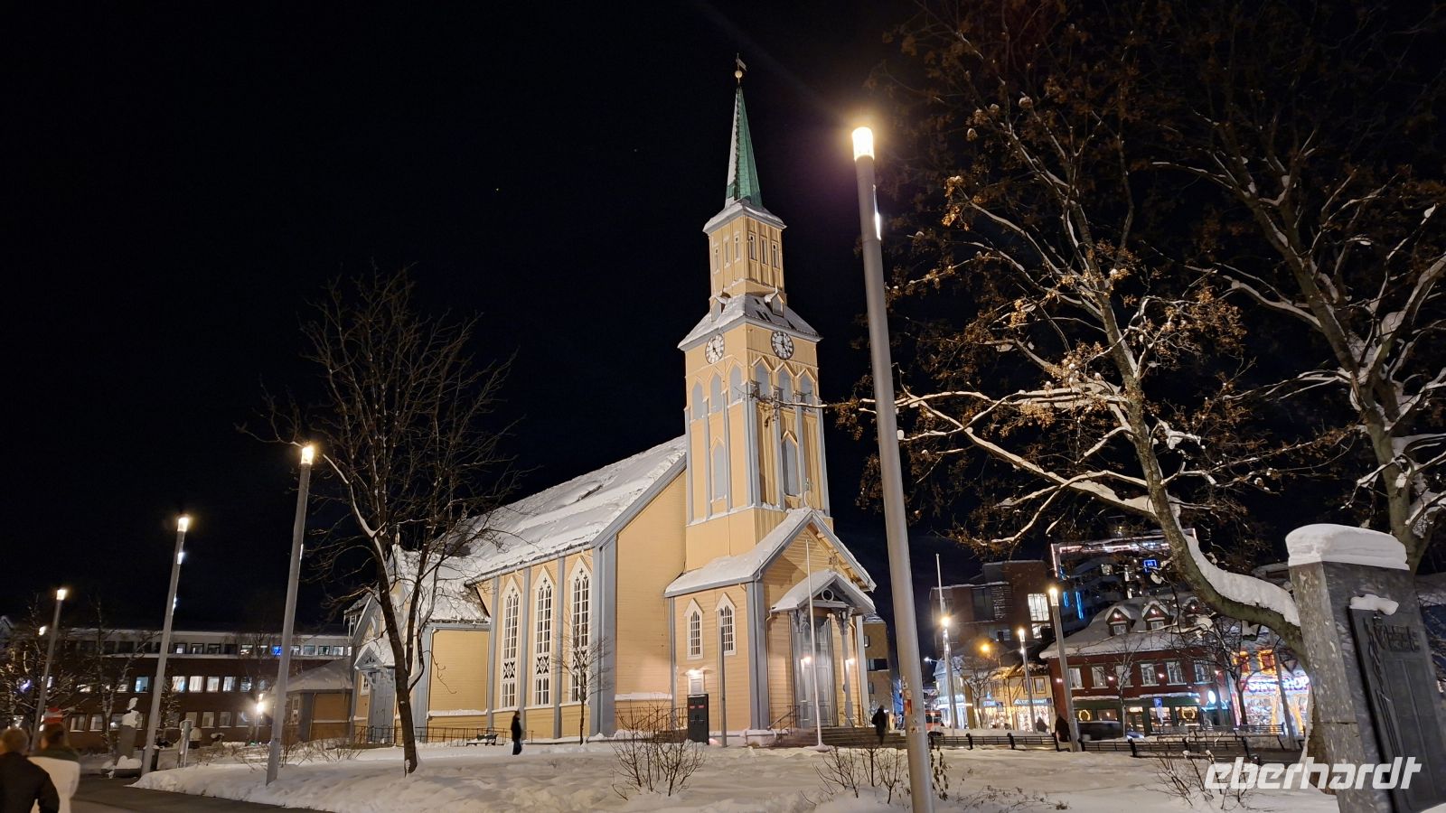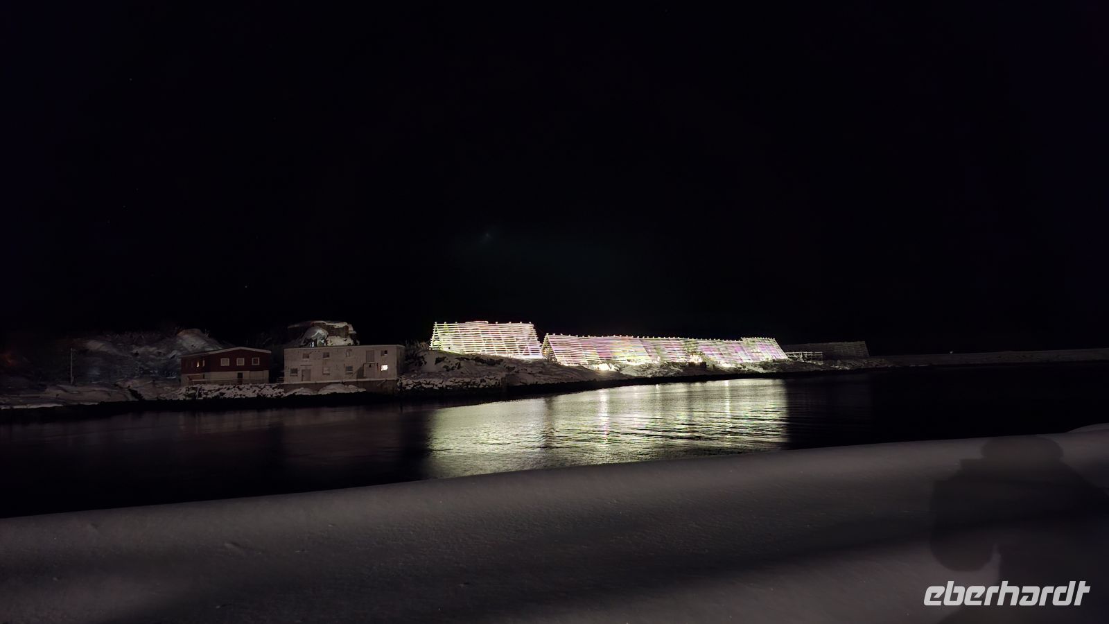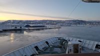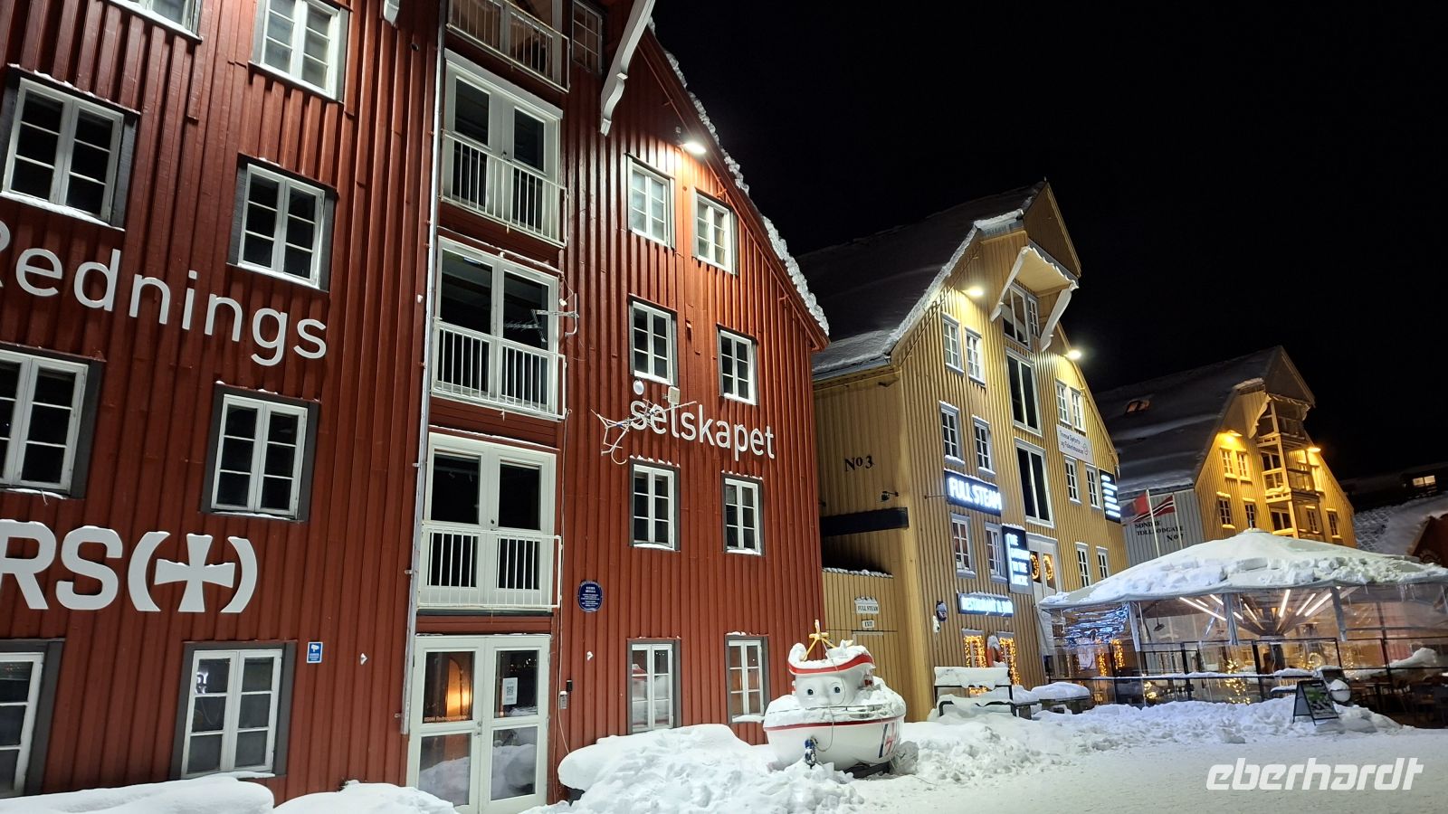 In der Nacht erreichten wir erneut Tromsø. Diesmal erlebten wir die Stadt in einem ganz anderen Licht – nämlich im nächtlichen. Einige Gäste unternahmen einen Spaziergang zur Tromsø Domkirke, der hübschen Holzkirche im Zentrum, und erlebten ein besonderes Mitternachtskonzert. Andere drehten noch eine kleine Runde durch die stille Stadt. Lichter spiegelten sich im Schnee und im Wasser, und die Straßen wirkten ruhiger, fast vertraut, als hätten wir Tromsø schon ein bisschen ins Herz geschlossen.