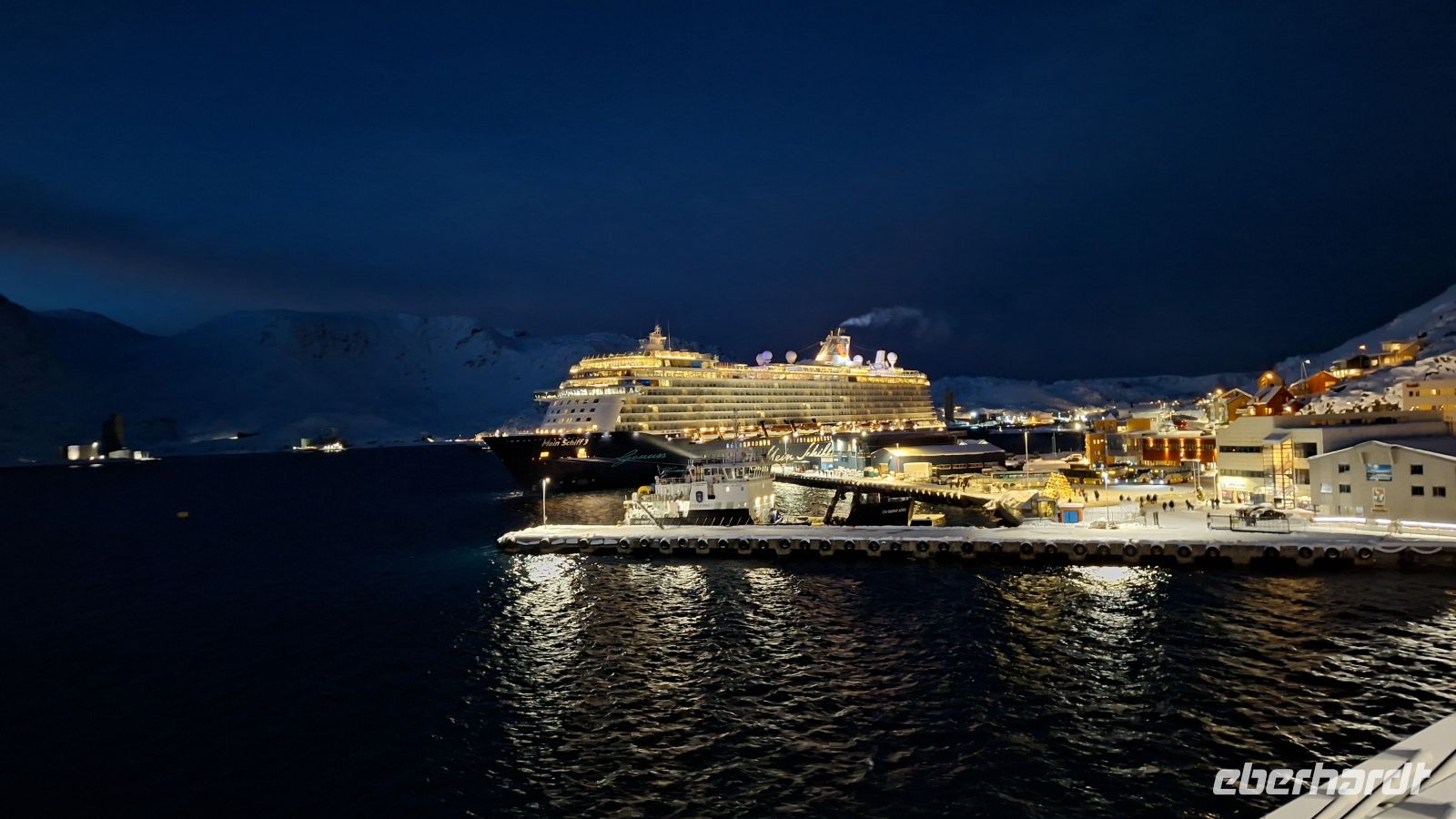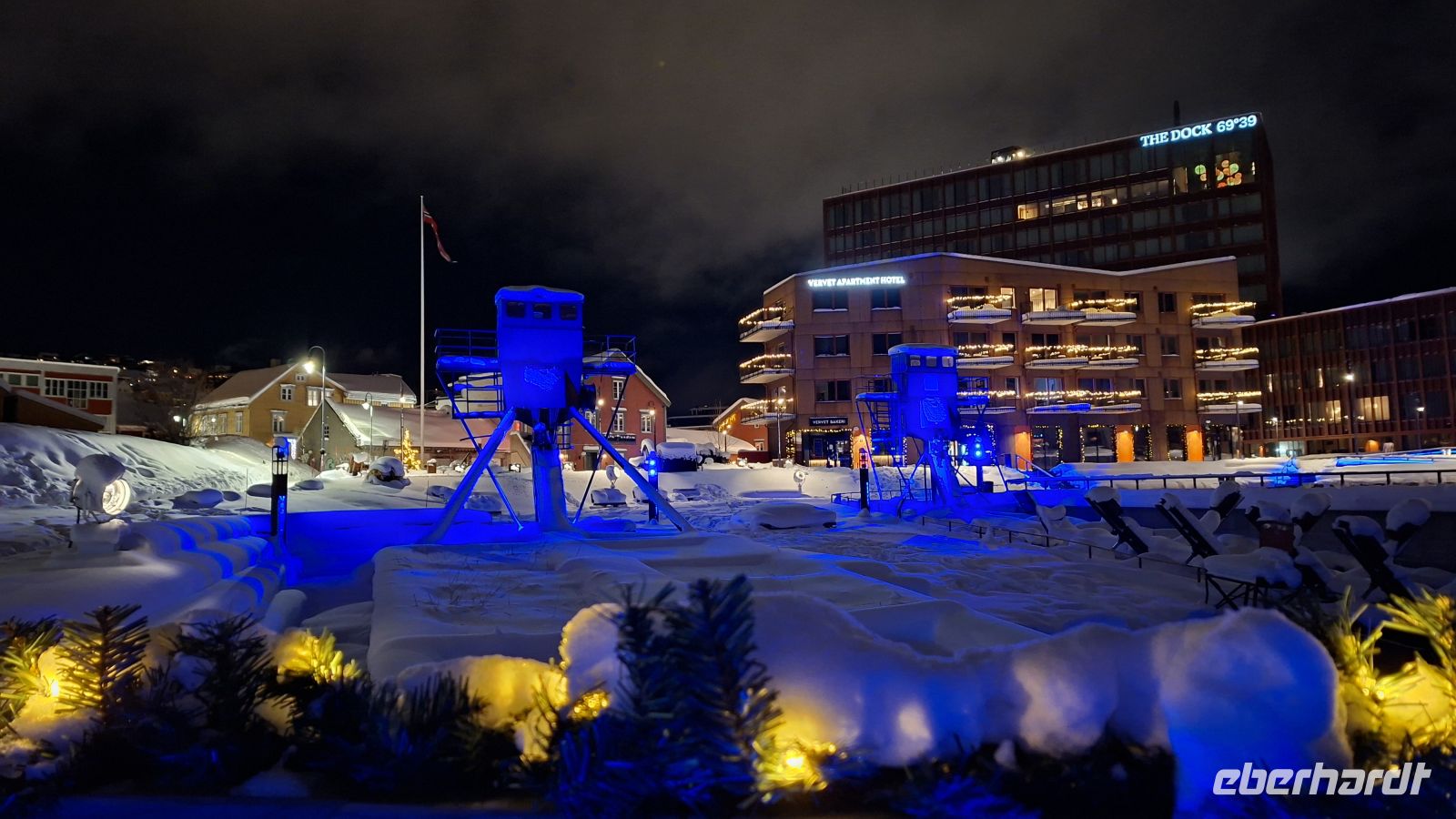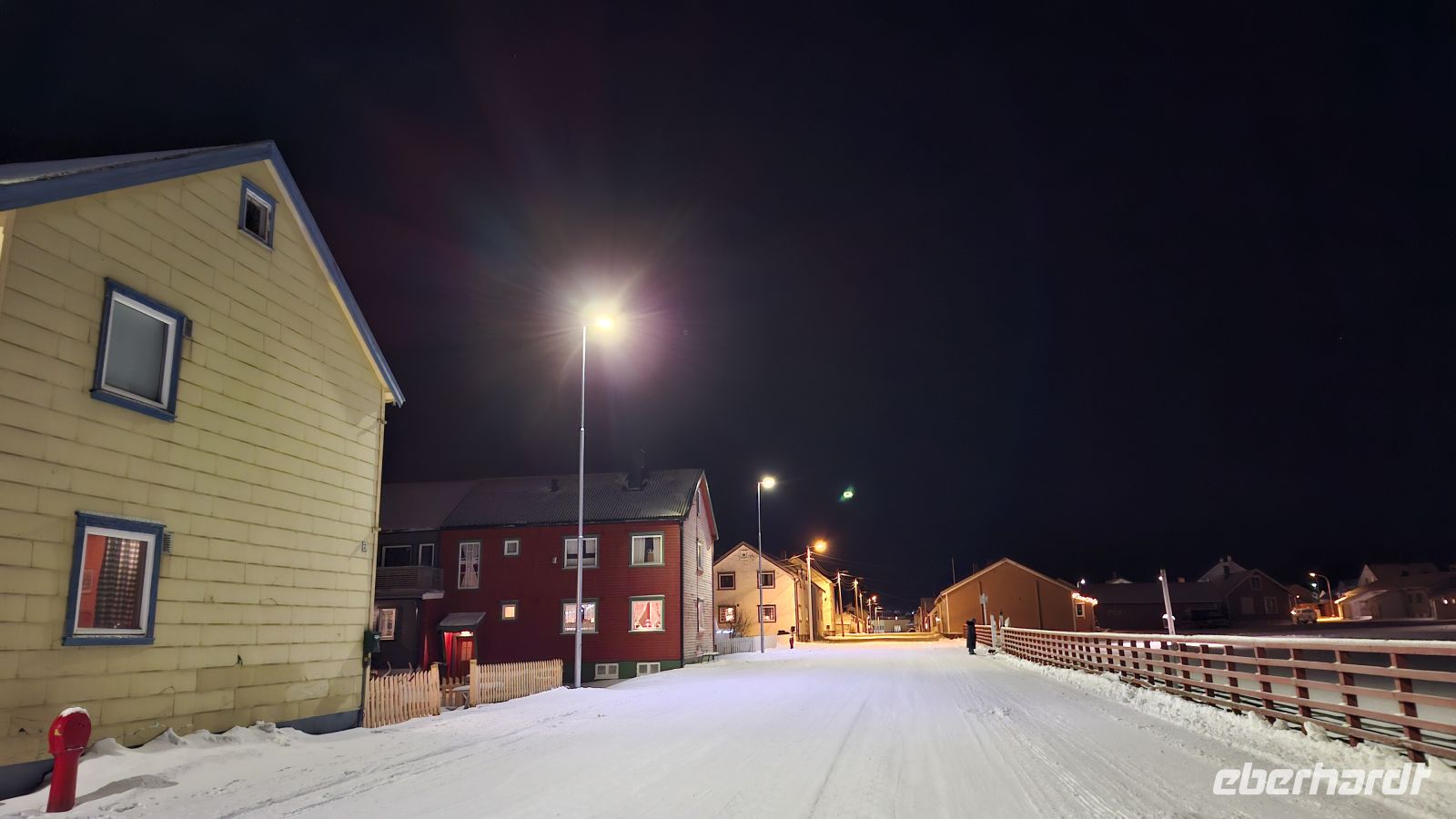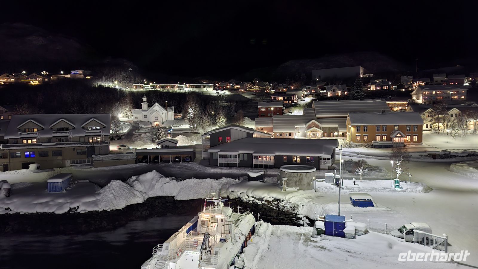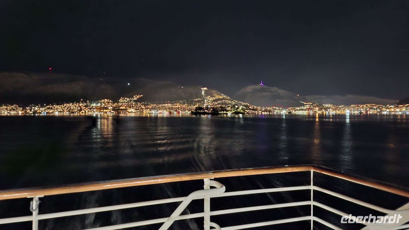In der Nacht erreichten wir erneut Tromsø. Diesmal erlebten wir die Stadt in einem ganz anderen Licht – nämlich im nächtlichen. Einige Gäste unternahmen einen Spaziergang zur Tromsø Domkirke, der hübschen Holzkirche im Zentrum, und erlebten ein besonderes Mitternachtskonzert. Andere drehten noch eine kleine Runde durch die stille Stadt. Lichter spiegelten sich im Schnee und im Wasser, und die Straßen wirkten ruhiger, fast vertraut, als hätten wir Tromsø schon ein bisschen ins Herz geschlossen.