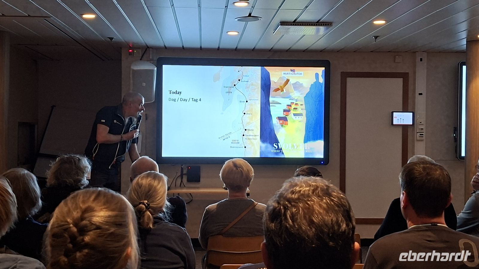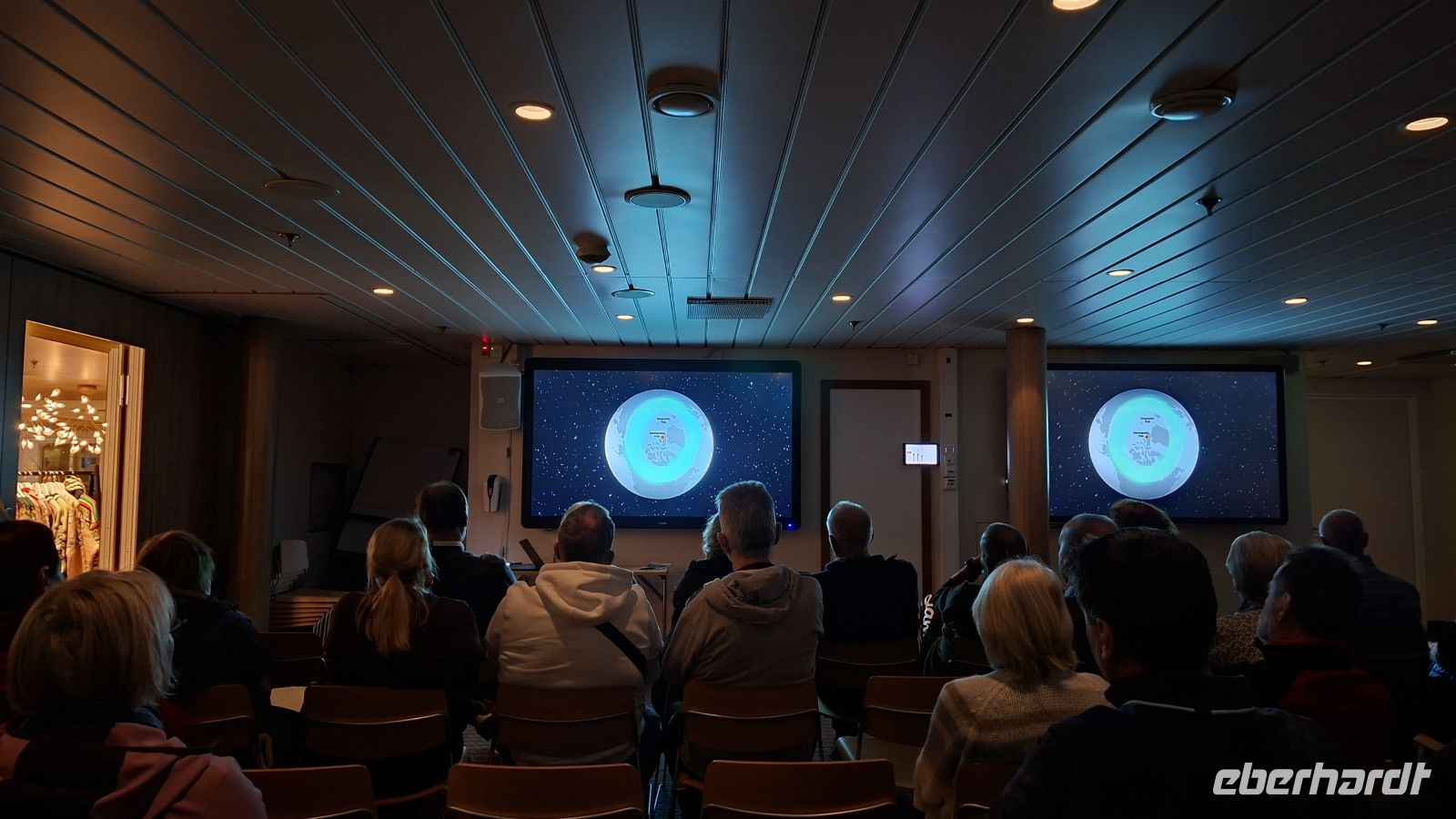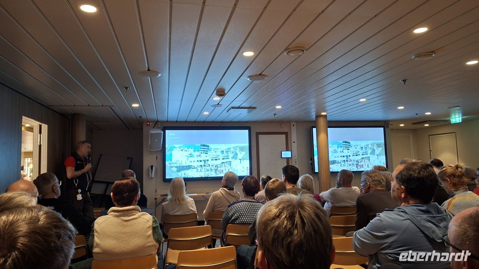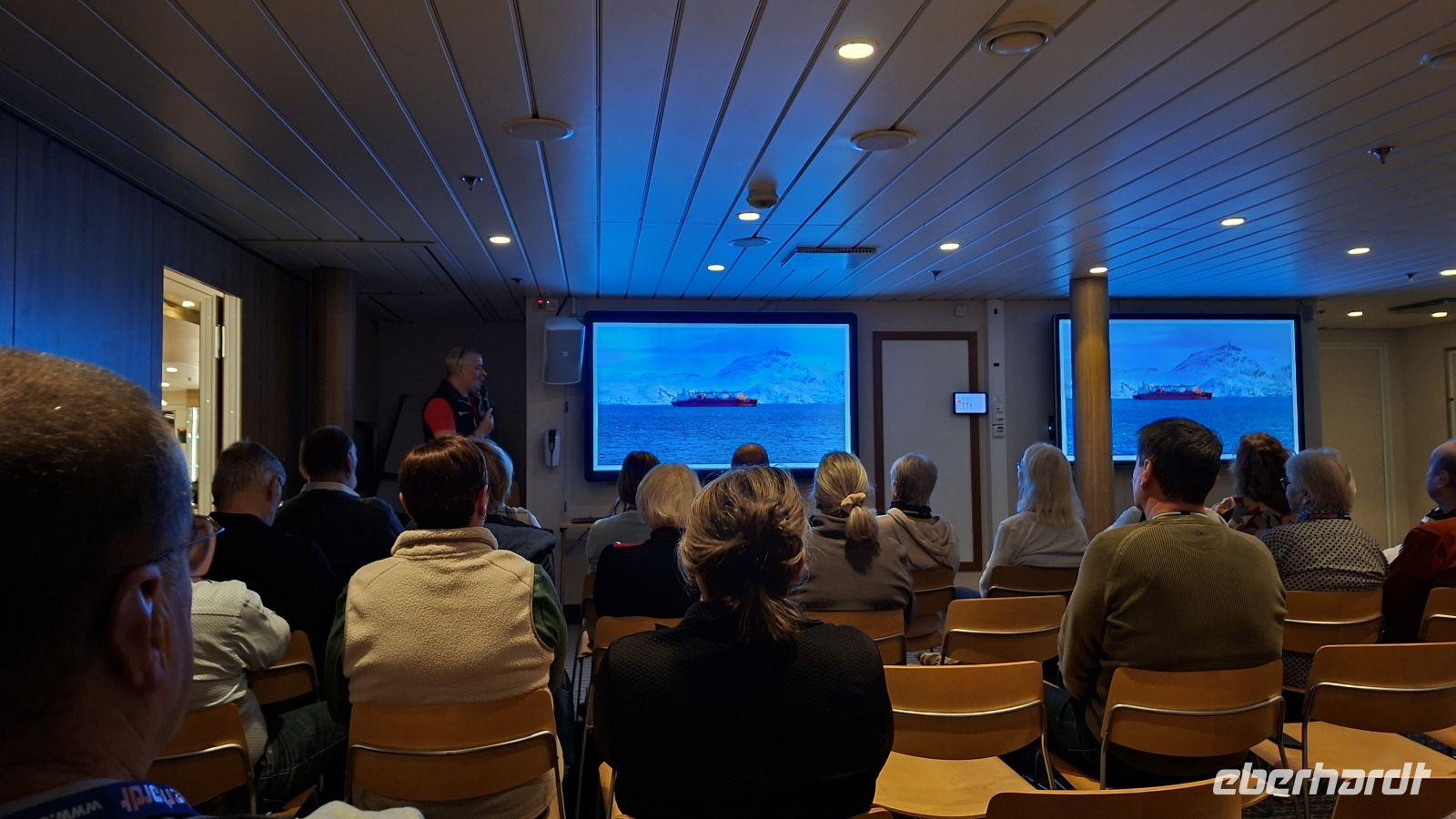 Bevor wir das Schiff endgültig verlassen mussten, gab es noch ein besonderes Schmankerl: einen Vortrag mit Jan – „MS Polarlys hinter den Kulissen“. Er zeigte uns, wie viel Arbeit, Planung und Teamgeist nötig waren, damit an Bord alles so reibungslos lief: von Maschine und Brücke über Proviant und Logistik bis hin zu den kleinen Dingen, die wir oft gar nicht bemerkten, die aber dafür sorgten, dass wir uns so wohlfühlten. Es war spannend zu erfahren, was alles im Hintergrund passierte, während wir gemütlich in der Lounge saßen.