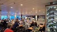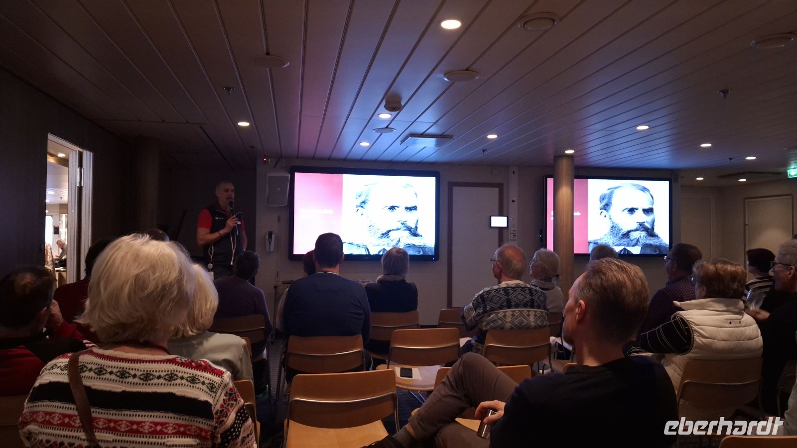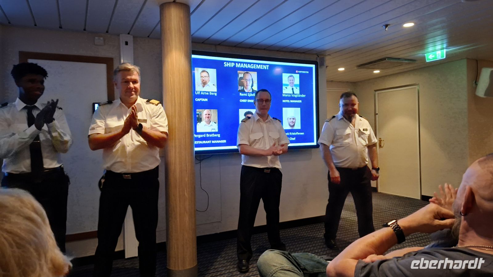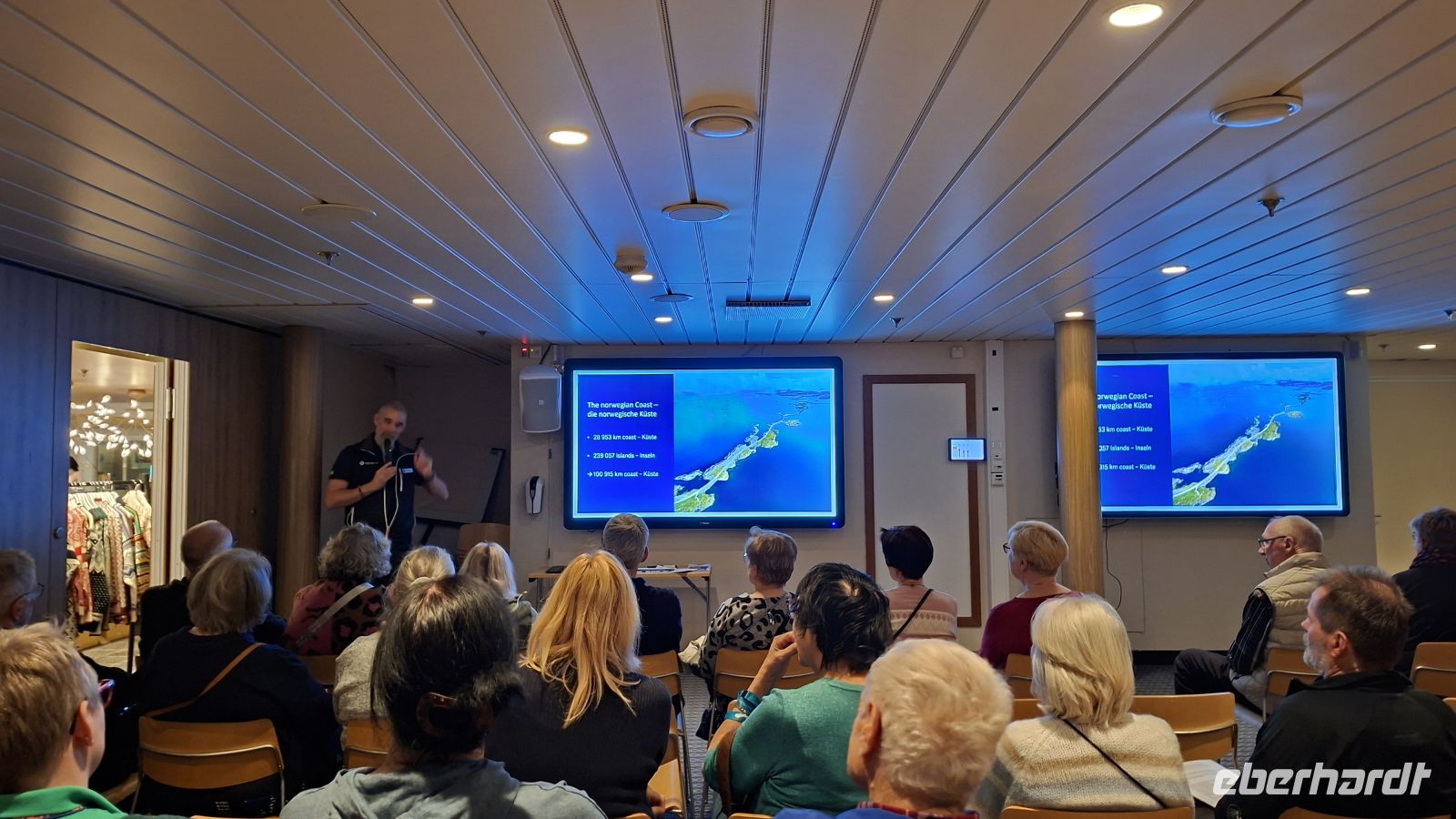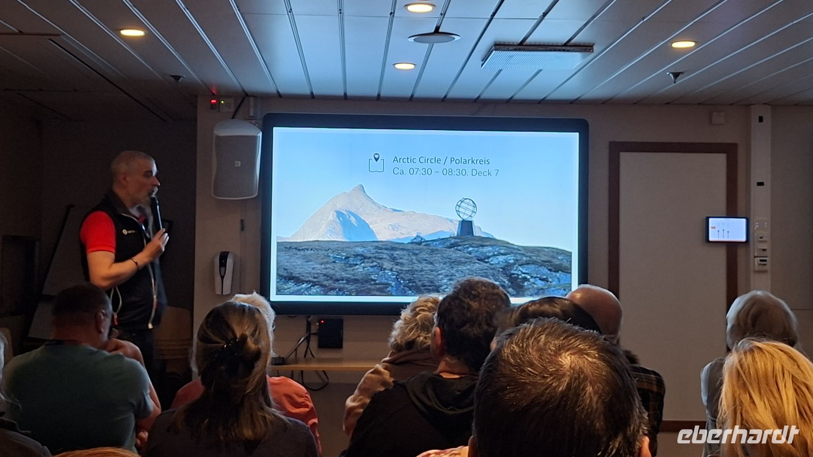 Bevor wir das Schiff endgültig verlassen mussten, gab es noch ein besonderes Schmankerl: einen Vortrag mit Jan – „MS Polarlys hinter den Kulissen“. Er zeigte uns, wie viel Arbeit, Planung und Teamgeist nötig waren, damit an Bord alles so reibungslos lief: von Maschine und Brücke über Proviant und Logistik bis hin zu den kleinen Dingen, die wir oft gar nicht bemerkten, die aber dafür sorgten, dass wir uns so wohlfühlten. Es war spannend zu erfahren, was alles im Hintergrund passierte, während wir gemütlich in der Lounge saßen.
