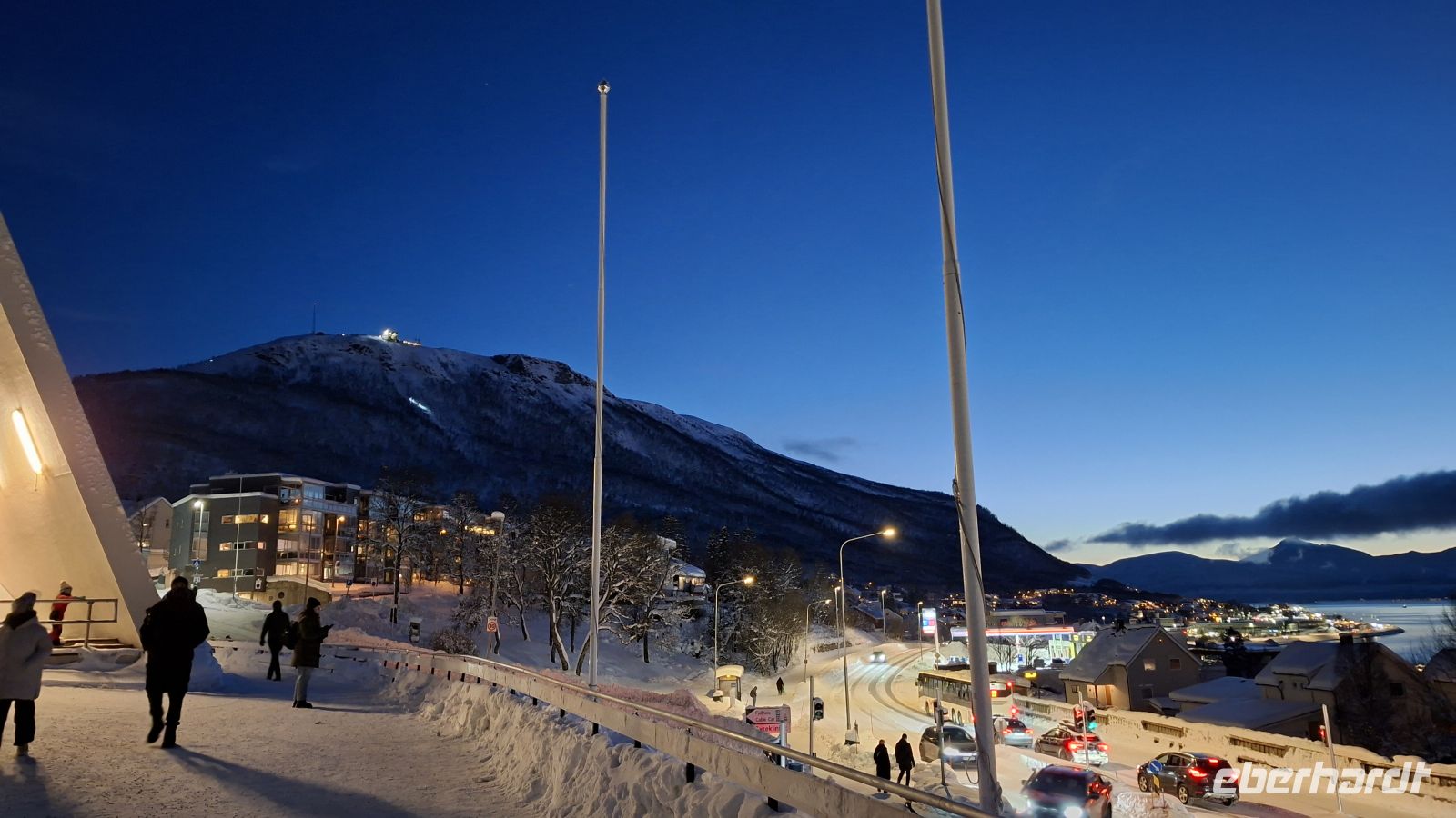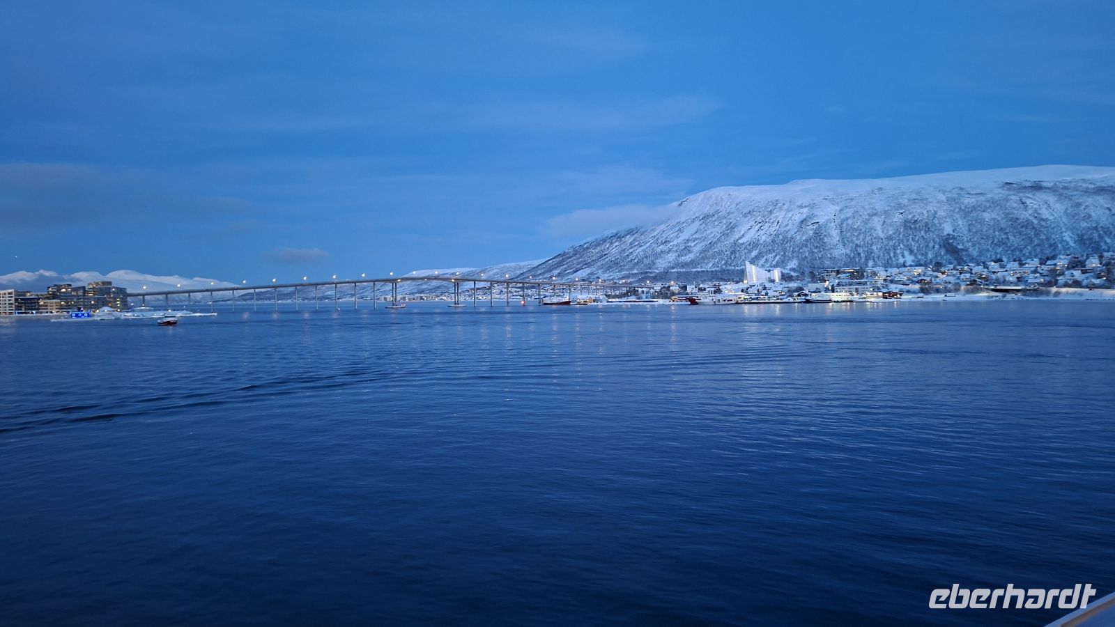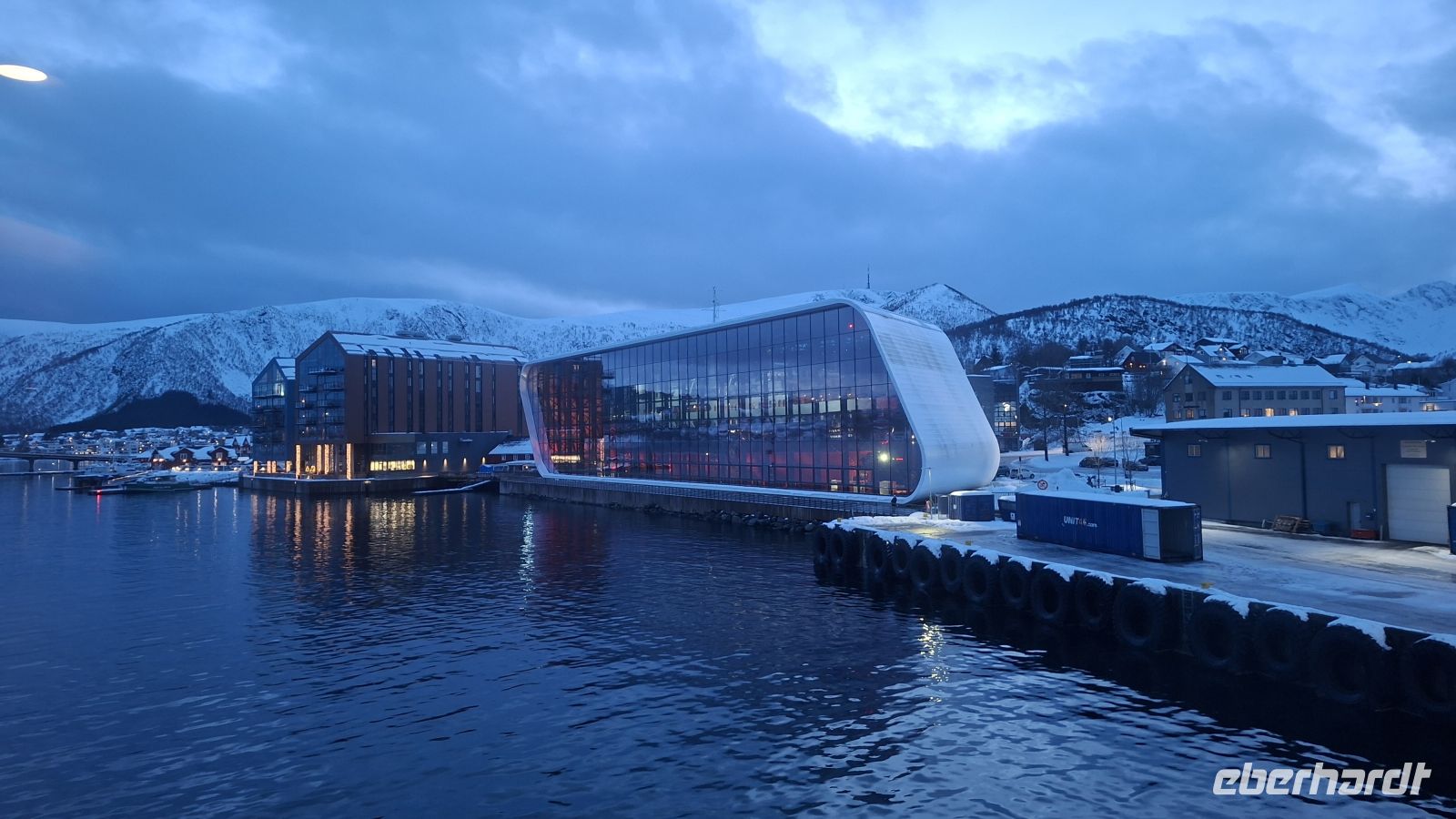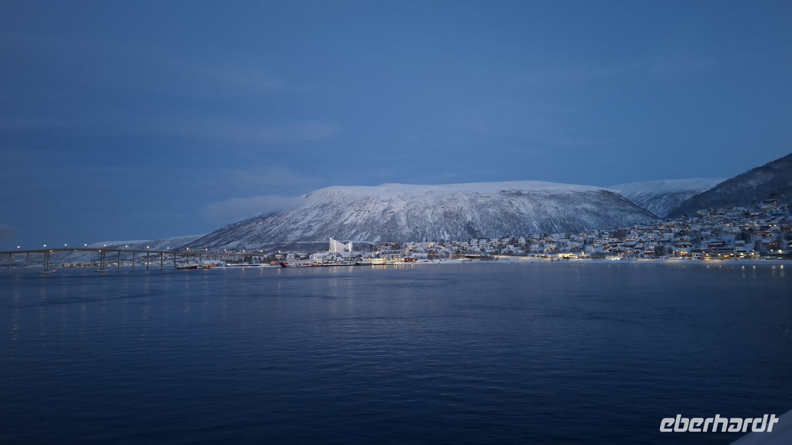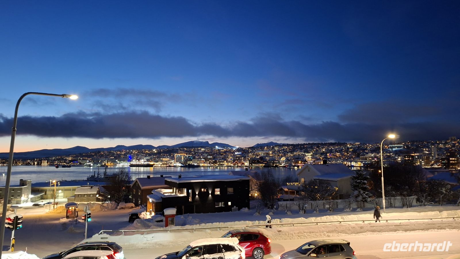 Nach dem Mittagessen erreichten wir Tromsø. Es war zwar erst früher Nachmittag, aber schon wieder am Dämmern – typisch Norden im Winter. Das bläulich-graue Licht legte sich über die Stadt und verlieh allem eine fast märchenhafte Stimmung.