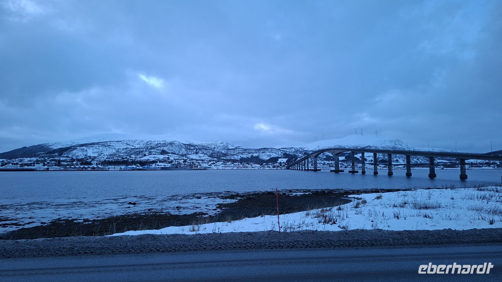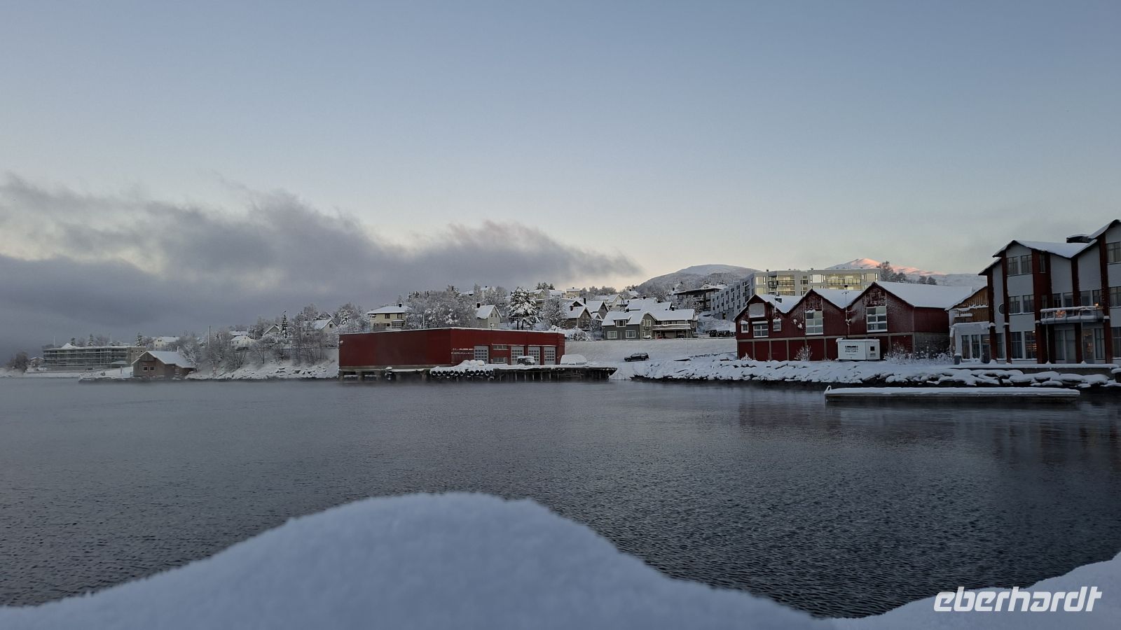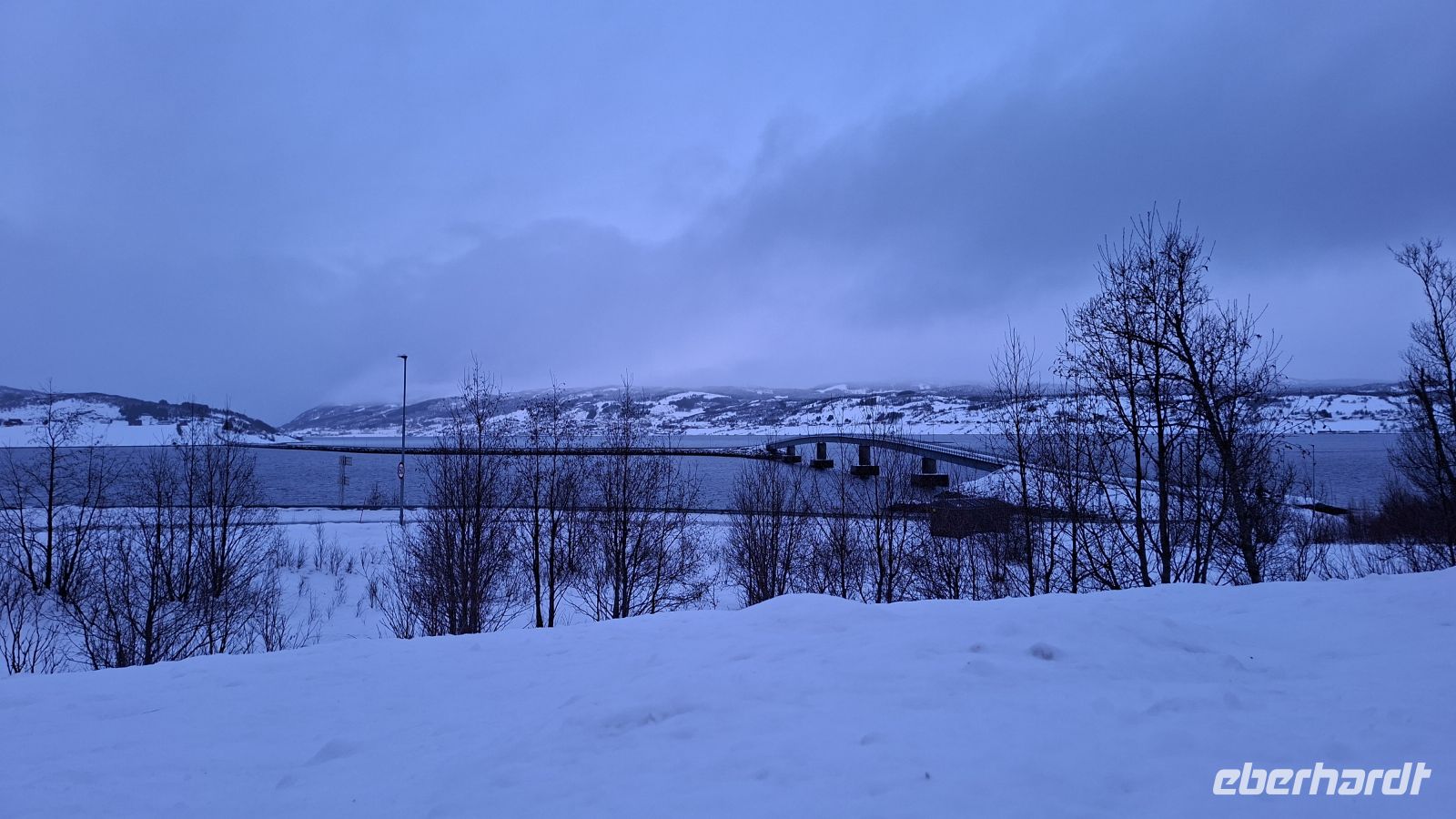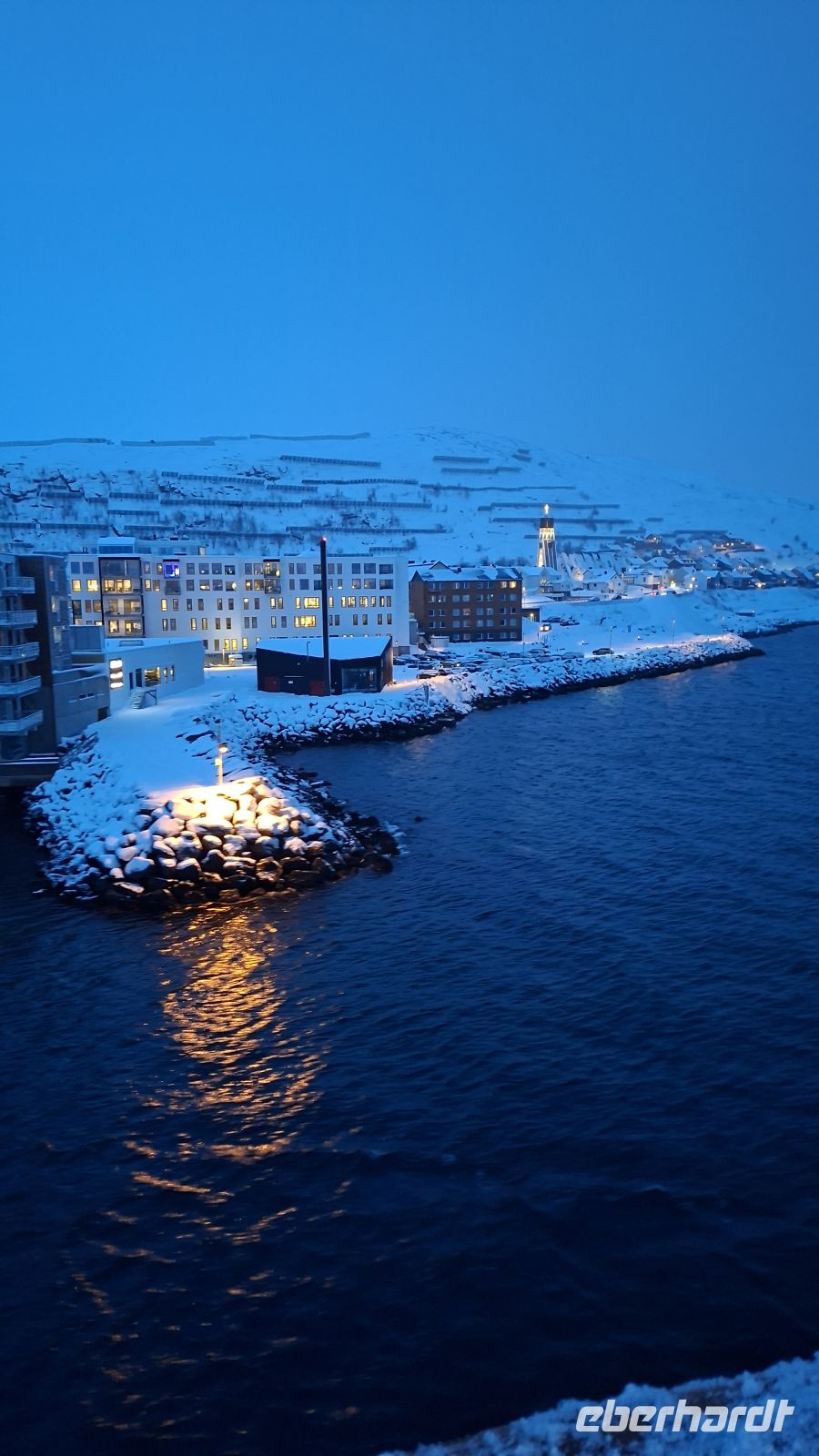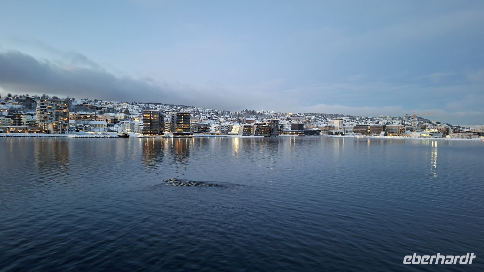 Nach dem Mittagessen erreichten wir Tromsø. Es war zwar erst früher Nachmittag, aber schon wieder am Dämmern – typisch Norden im Winter. Das bläulich-graue Licht legte sich über die Stadt und verlieh allem eine fast märchenhafte Stimmung.