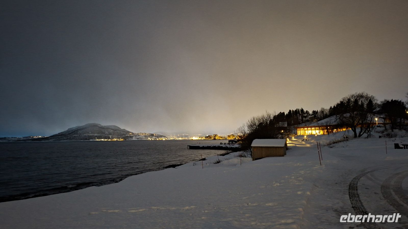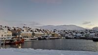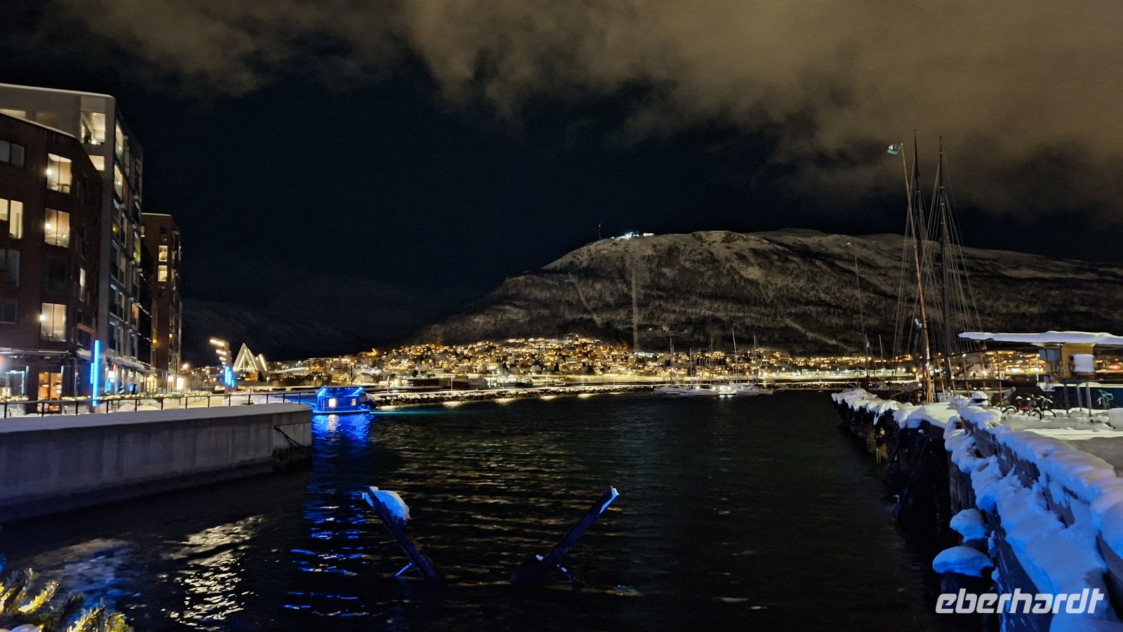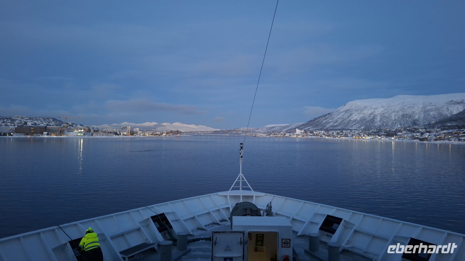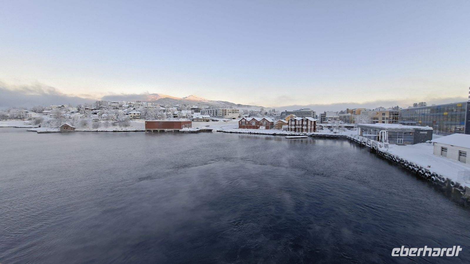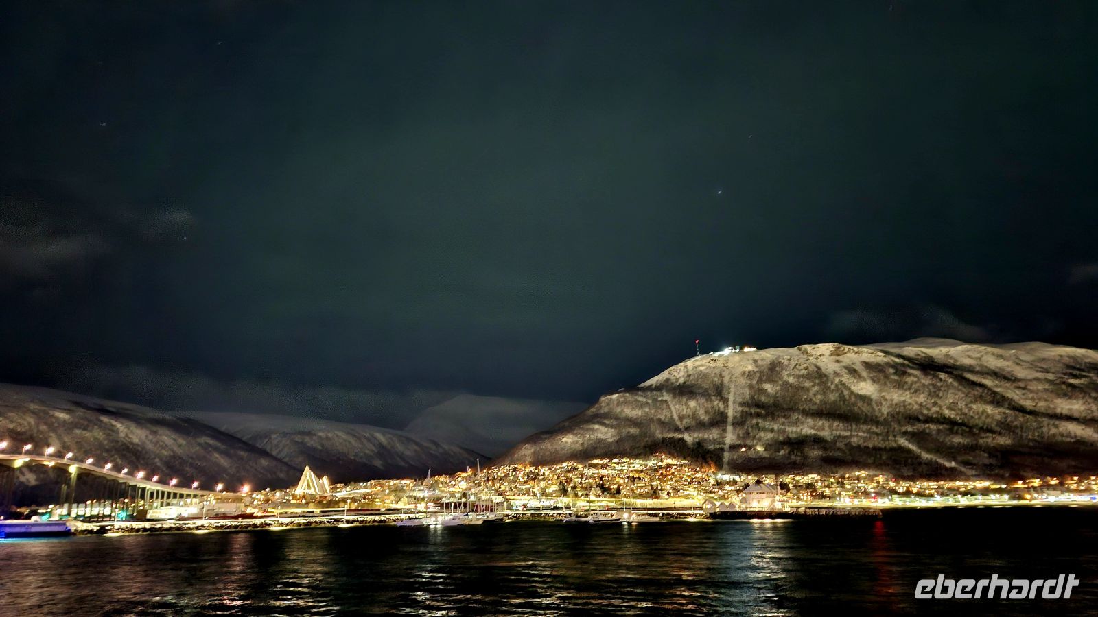 Nach dem Mittagessen erreichten wir Tromsø. Es war zwar erst früher Nachmittag, aber schon wieder am Dämmern – typisch Norden im Winter. Das bläulich-graue Licht legte sich über die Stadt und verlieh allem eine fast märchenhafte Stimmung.