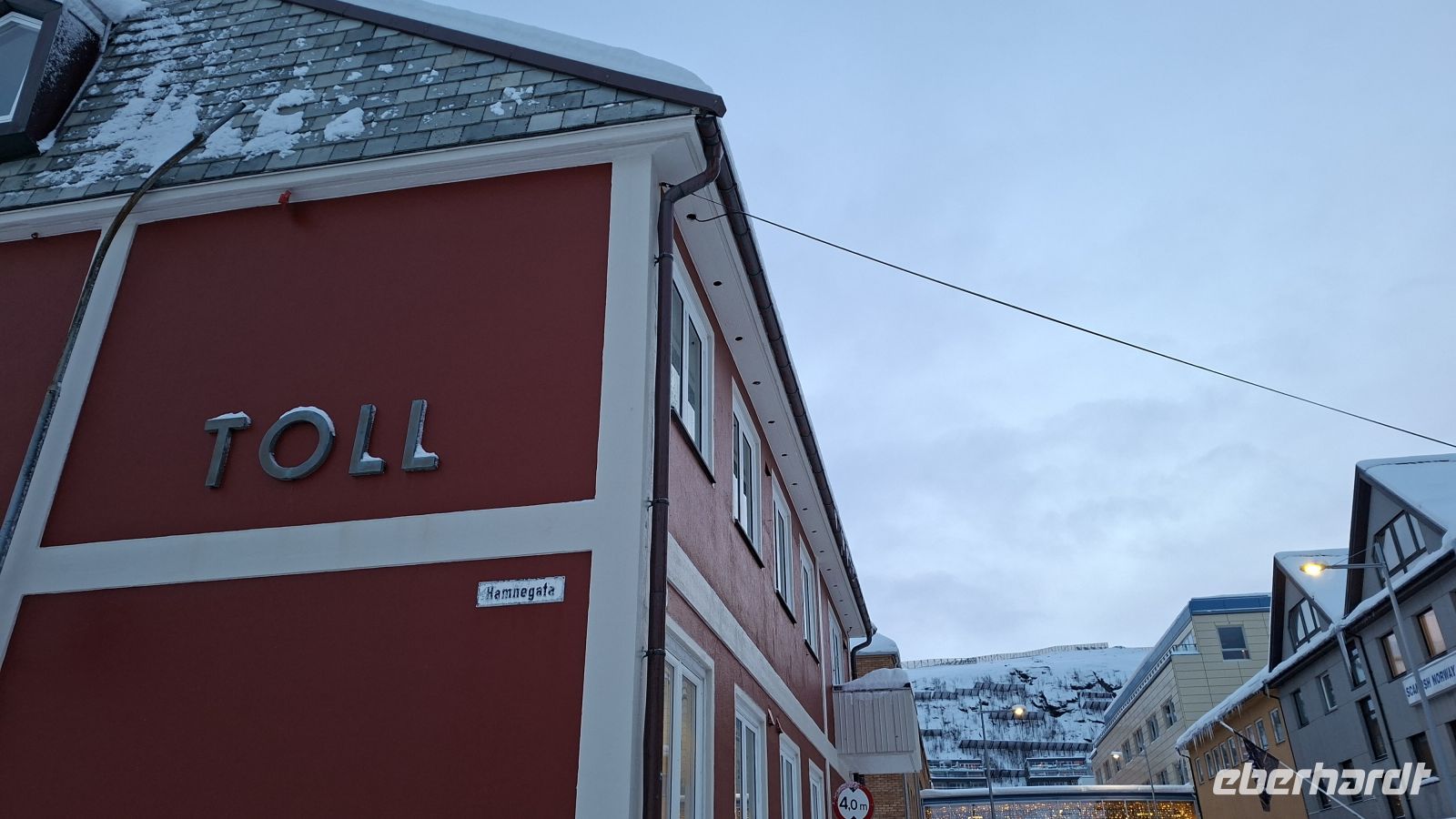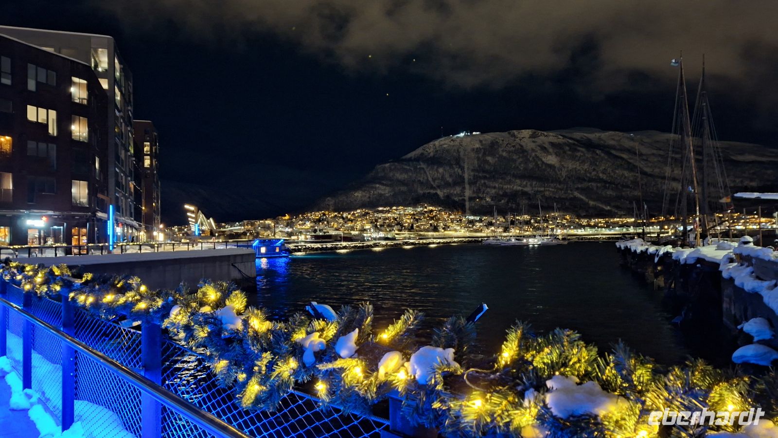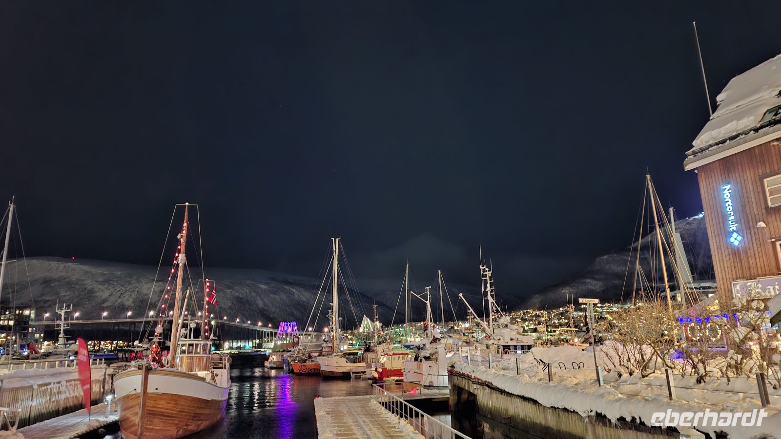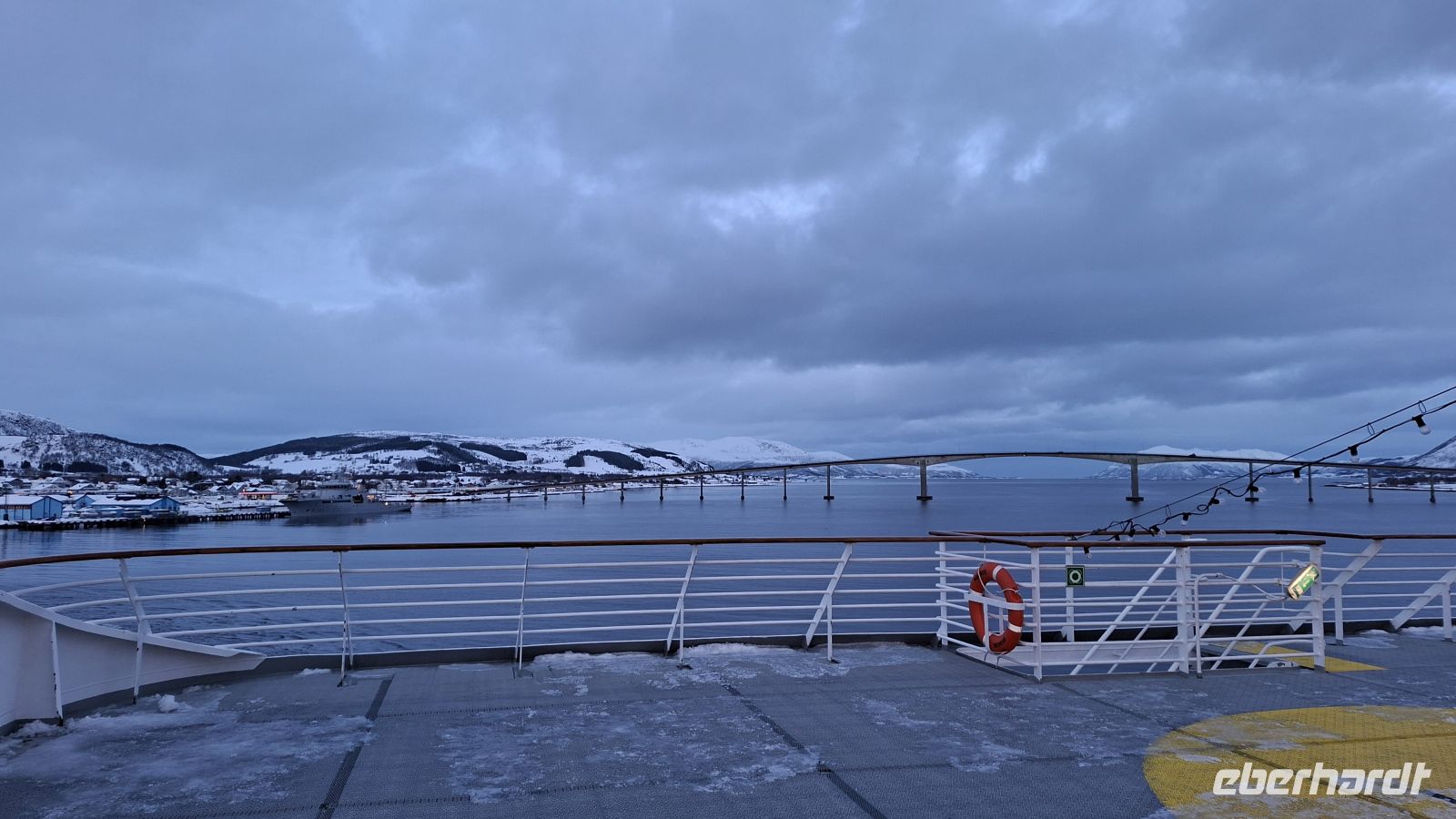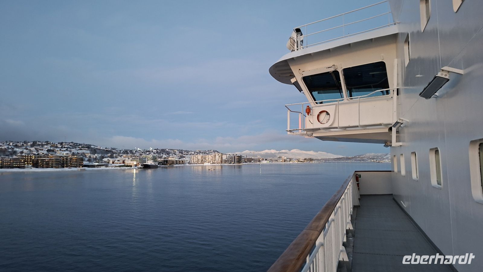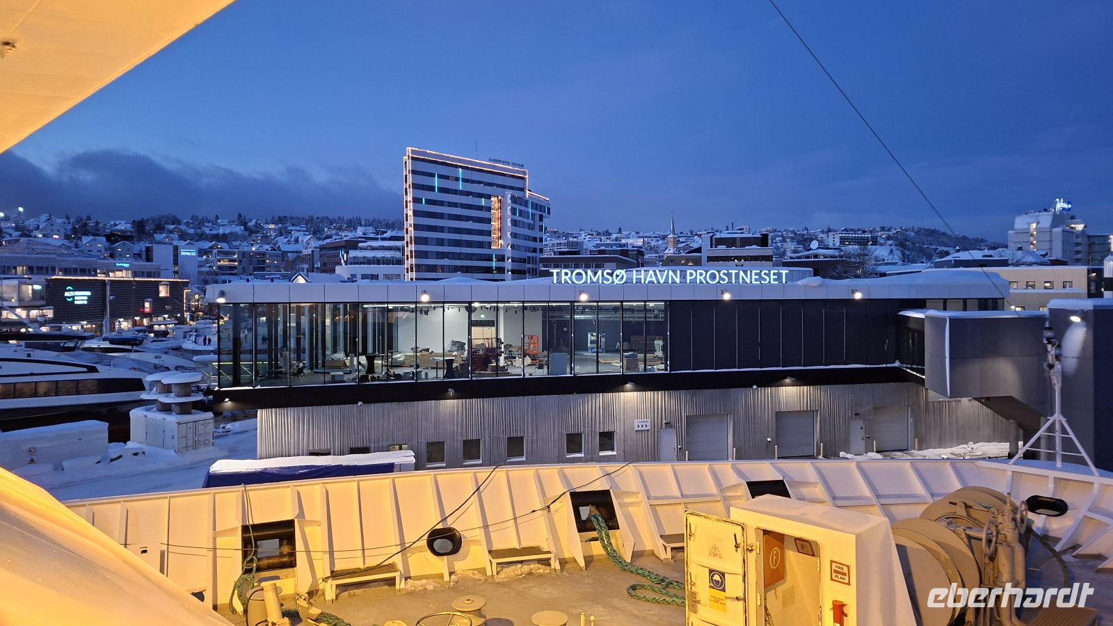 Nach dem Mittagessen erreichten wir Tromsø. Es war zwar erst früher Nachmittag, aber schon wieder am Dämmern – typisch Norden im Winter. Das bläulich-graue Licht legte sich über die Stadt und verlieh allem eine fast märchenhafte Stimmung.