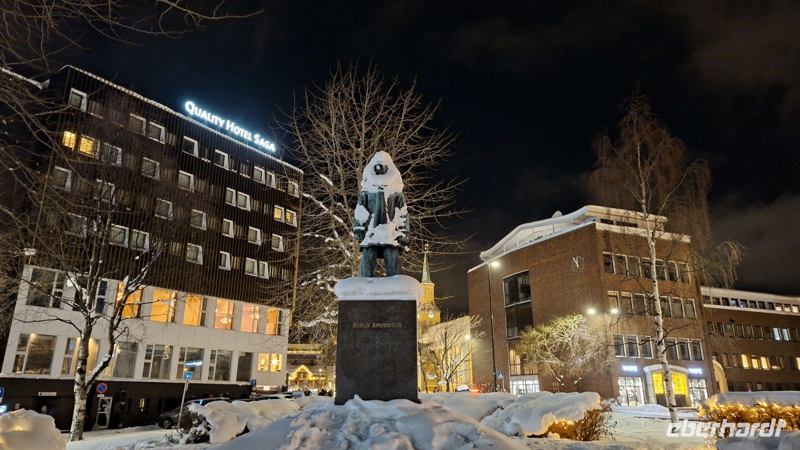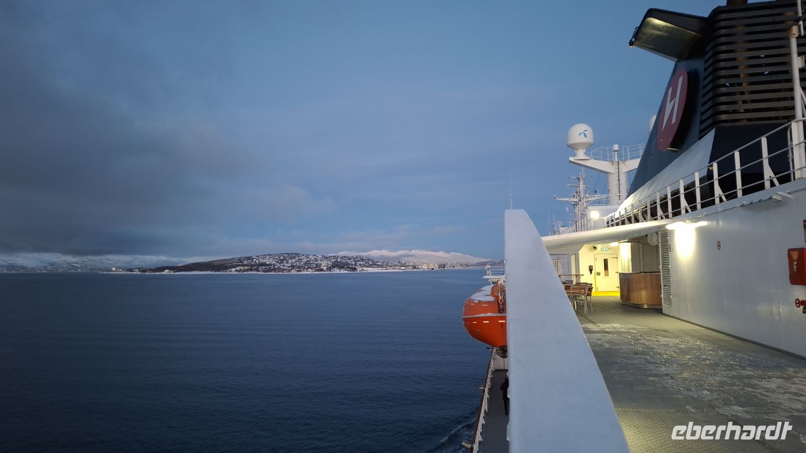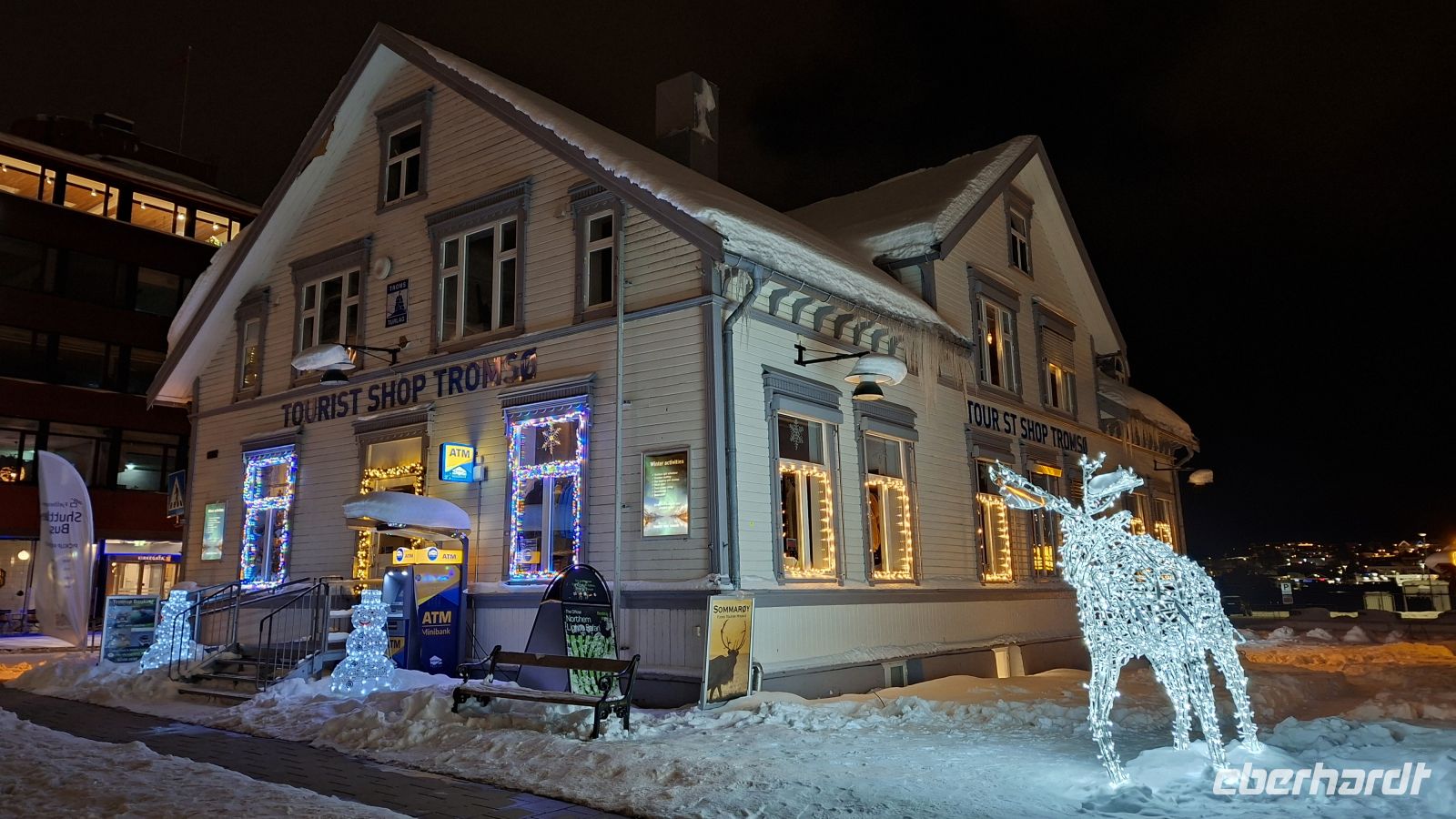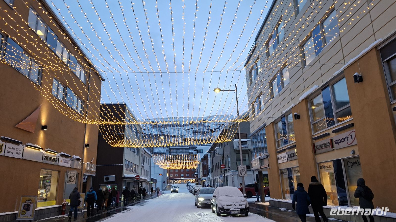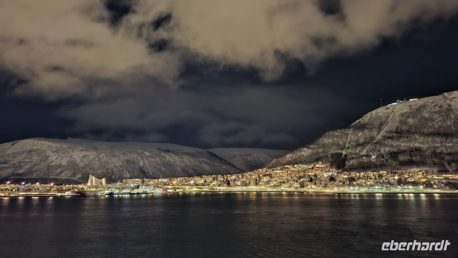 Nach dem Mittagessen erreichten wir Tromsø. Es war zwar erst früher Nachmittag, aber schon wieder am Dämmern – typisch Norden im Winter. Das bläulich-graue Licht legte sich über die Stadt und verlieh allem eine fast märchenhafte Stimmung.