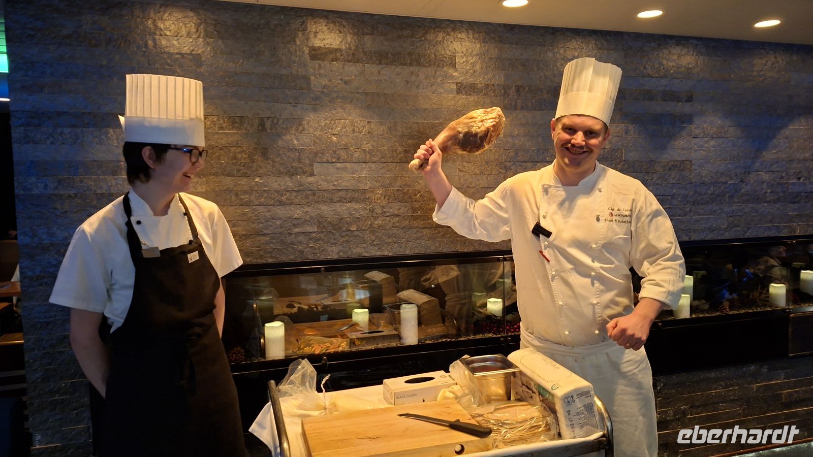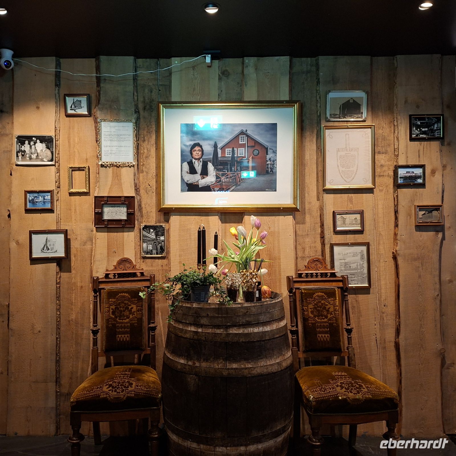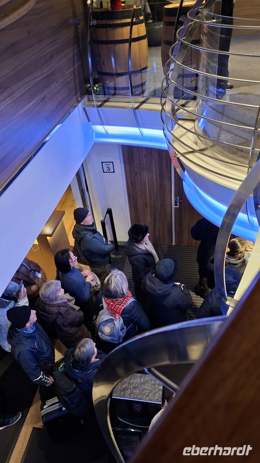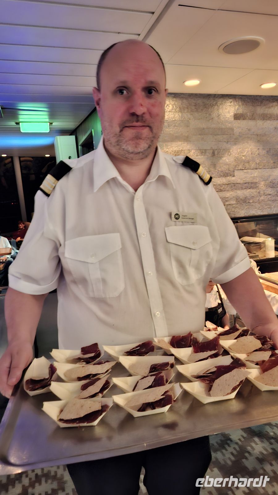 Nach dem Abendessen ließen wir den Tag gemeinsam in der Bar auf Deck 7 ausklingen. Die Stimmung war entspannt, es wurde erzählt, gelacht und natürlich auf diesen schönen Tag mit Akvavit angestoßen. Als extra Highlight gab es eine Verkostung von gepökelter Lammkeule – einer würzigen nordischen Spezialität. Die einen waren sofort begeistert, die anderen probierten erst vorsichtig, aber am Ende waren wir uns einig: Das passte perfekt zu diesem Tag voller neuer Eindrücke. Müde, zufrieden und mit vielen schönen Bildern im Kopf sind wir schließlich in unsere Kabinen gegangen – und hatten das Gefühl, dem Norden ein gutes Stück näher gekommen zu sein.
