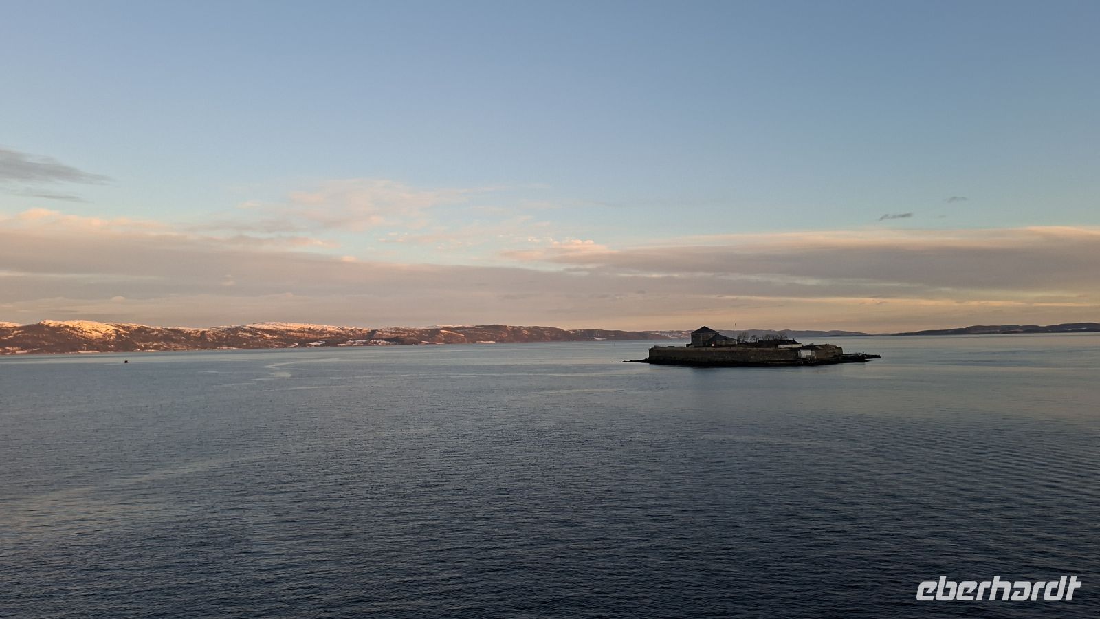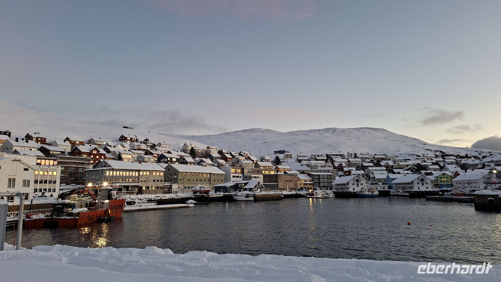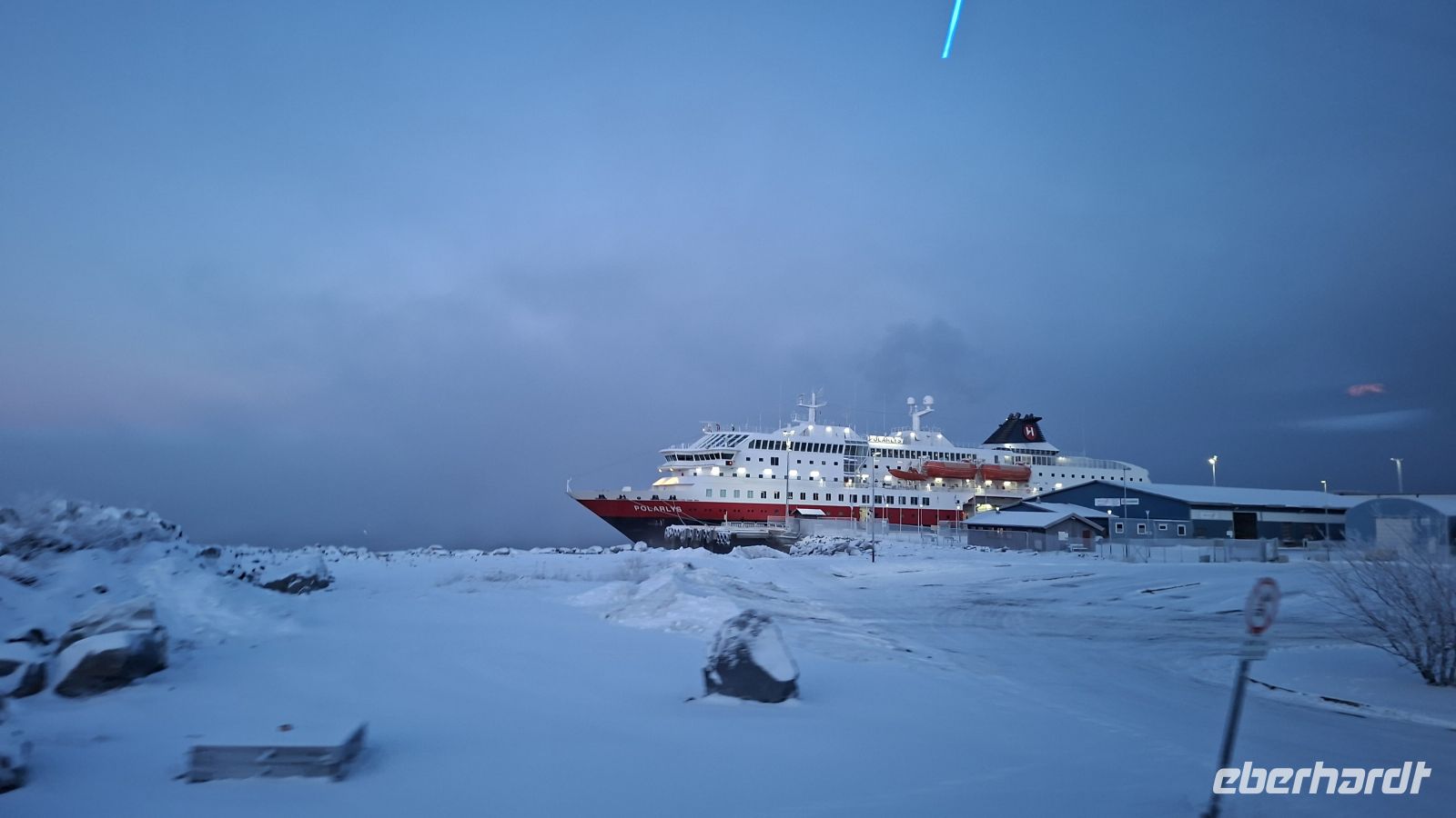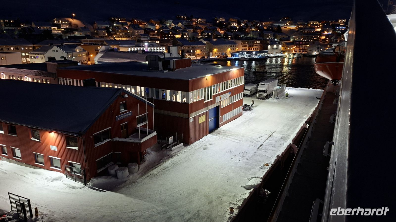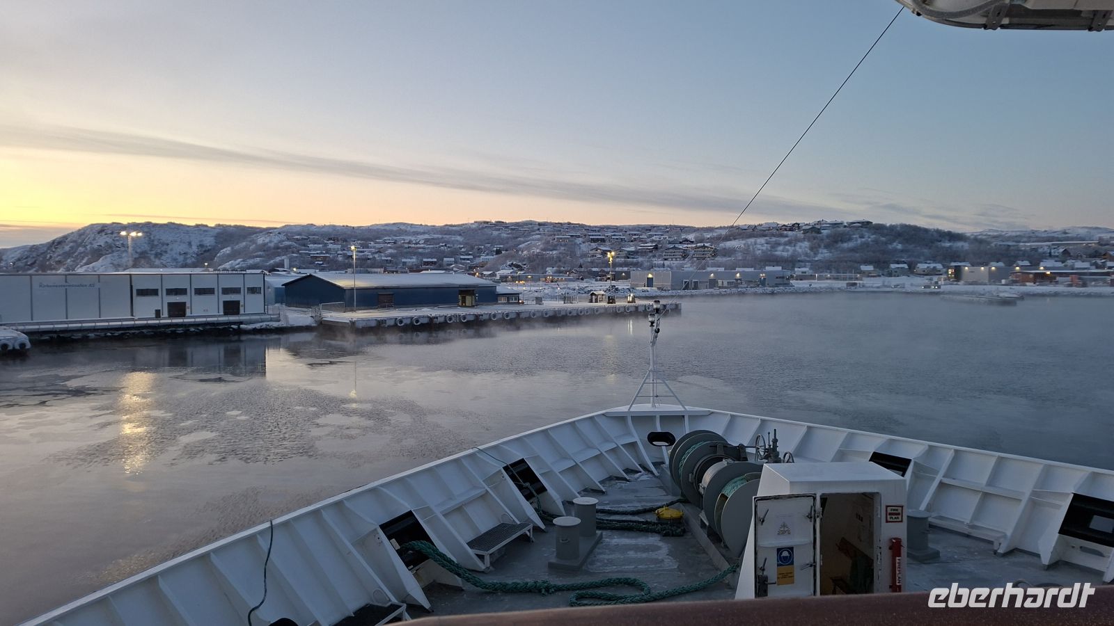 In Vardø hatten wir später kurz Zeit, uns an Land die Füße zu vertreten. Ein kleiner Rundgang durch die verschneiten Straßen, frische Luft tief einatmen, einmal drehen, alles aufsaugen – und schon ging es weiter.