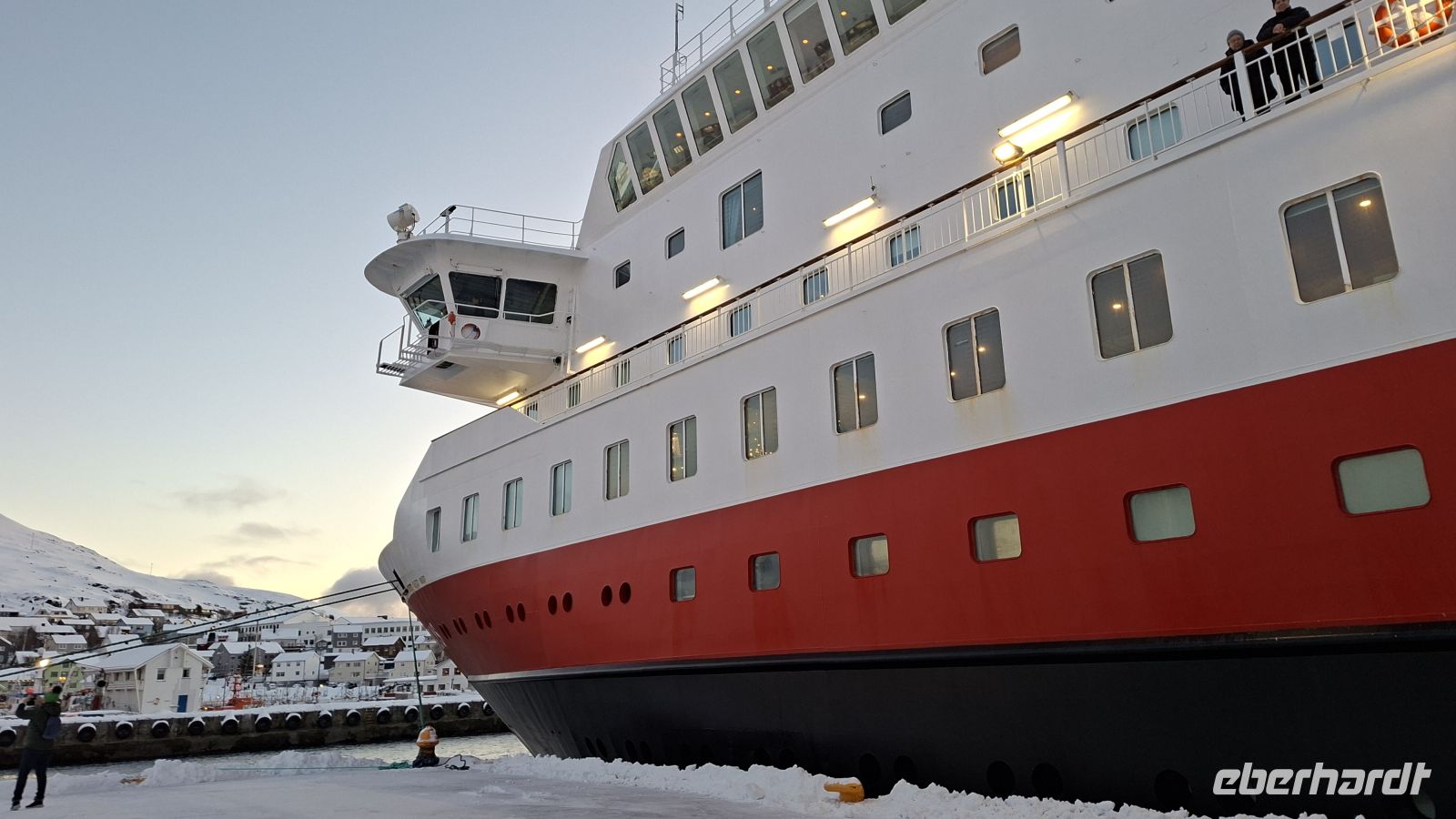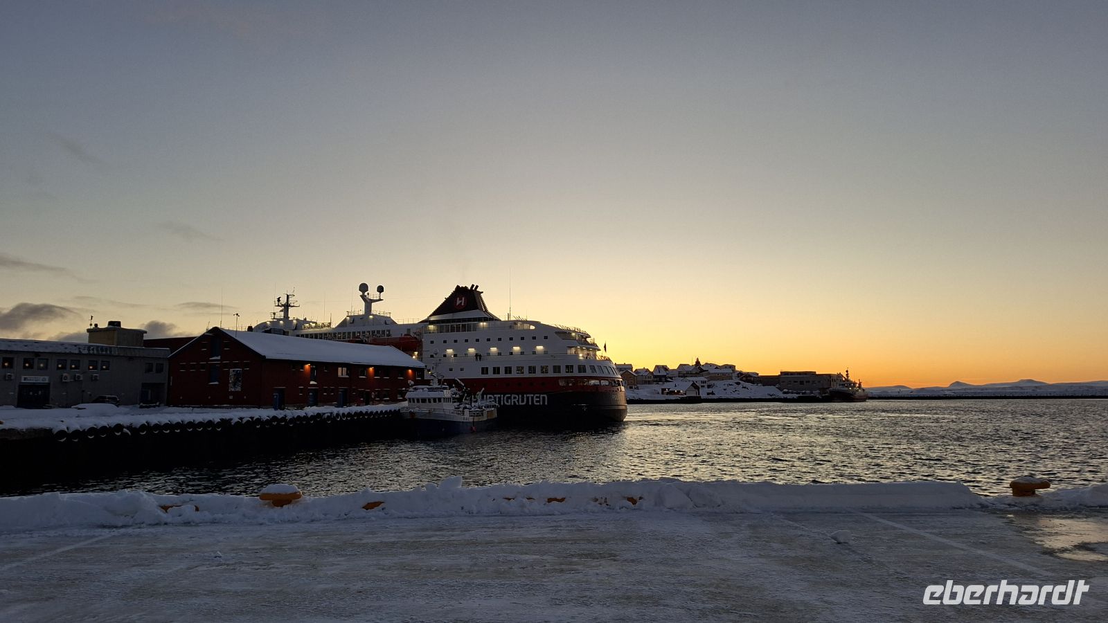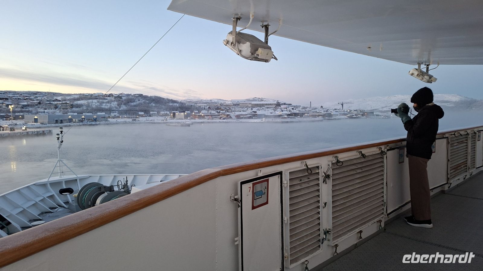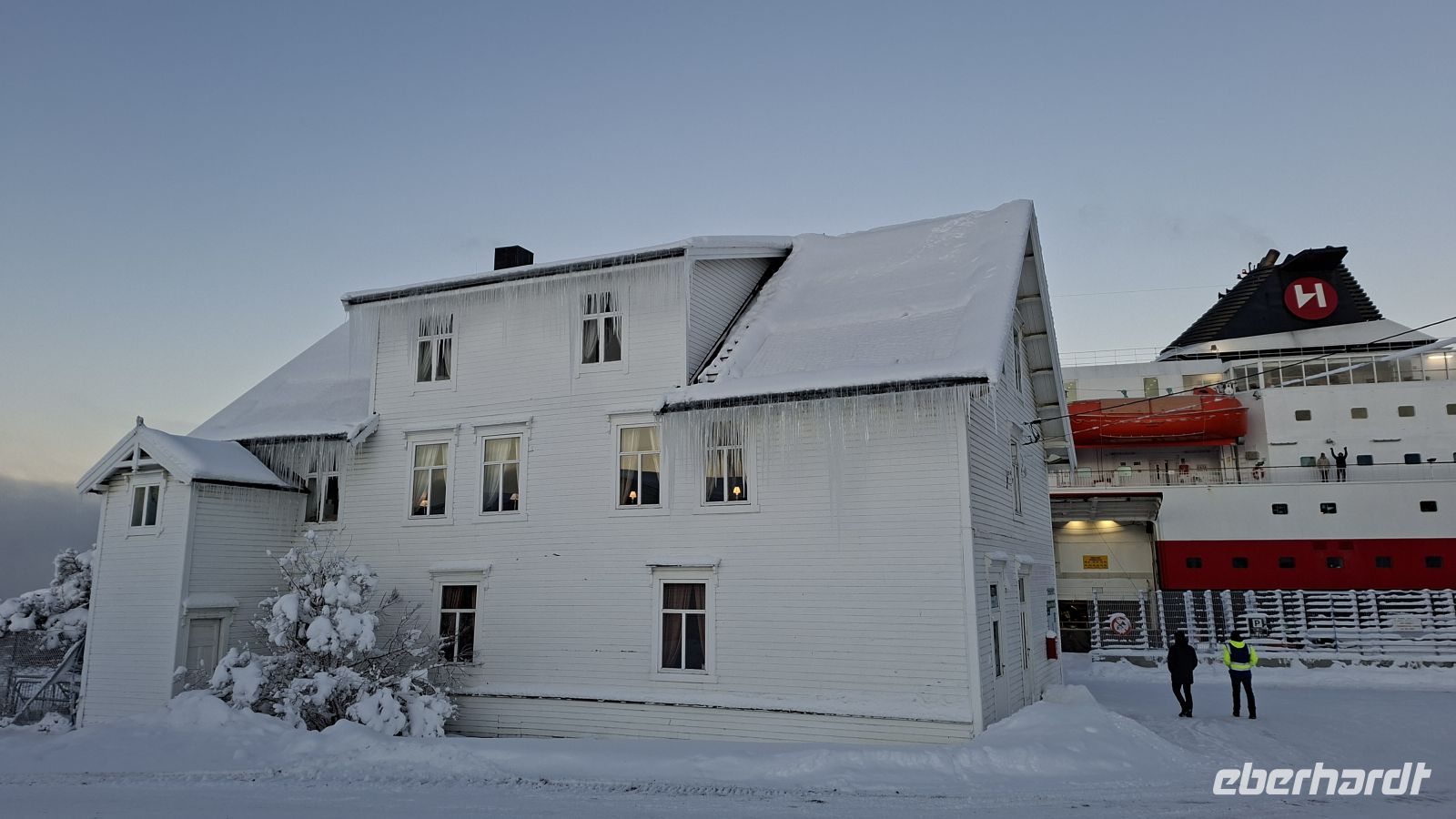 In Vardø hatten wir später kurz Zeit, uns an Land die Füße zu vertreten. Ein kleiner Rundgang durch die verschneiten Straßen, frische Luft tief einatmen, einmal drehen, alles aufsaugen – und schon ging es weiter.