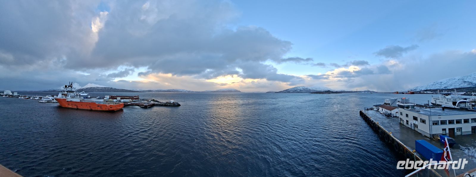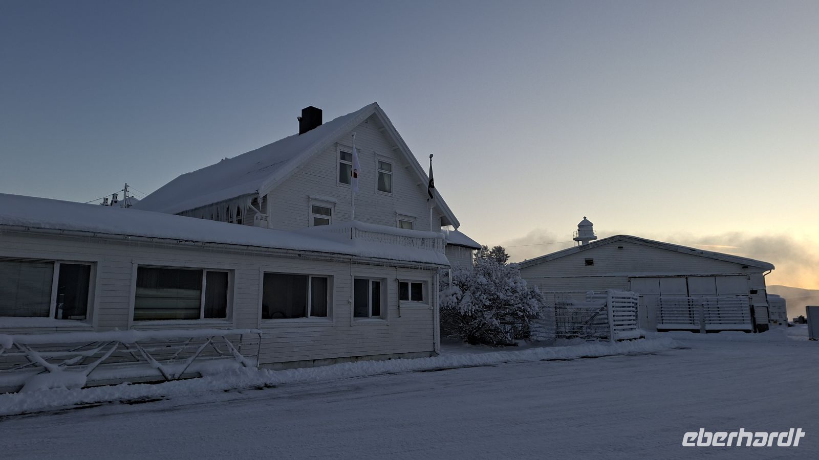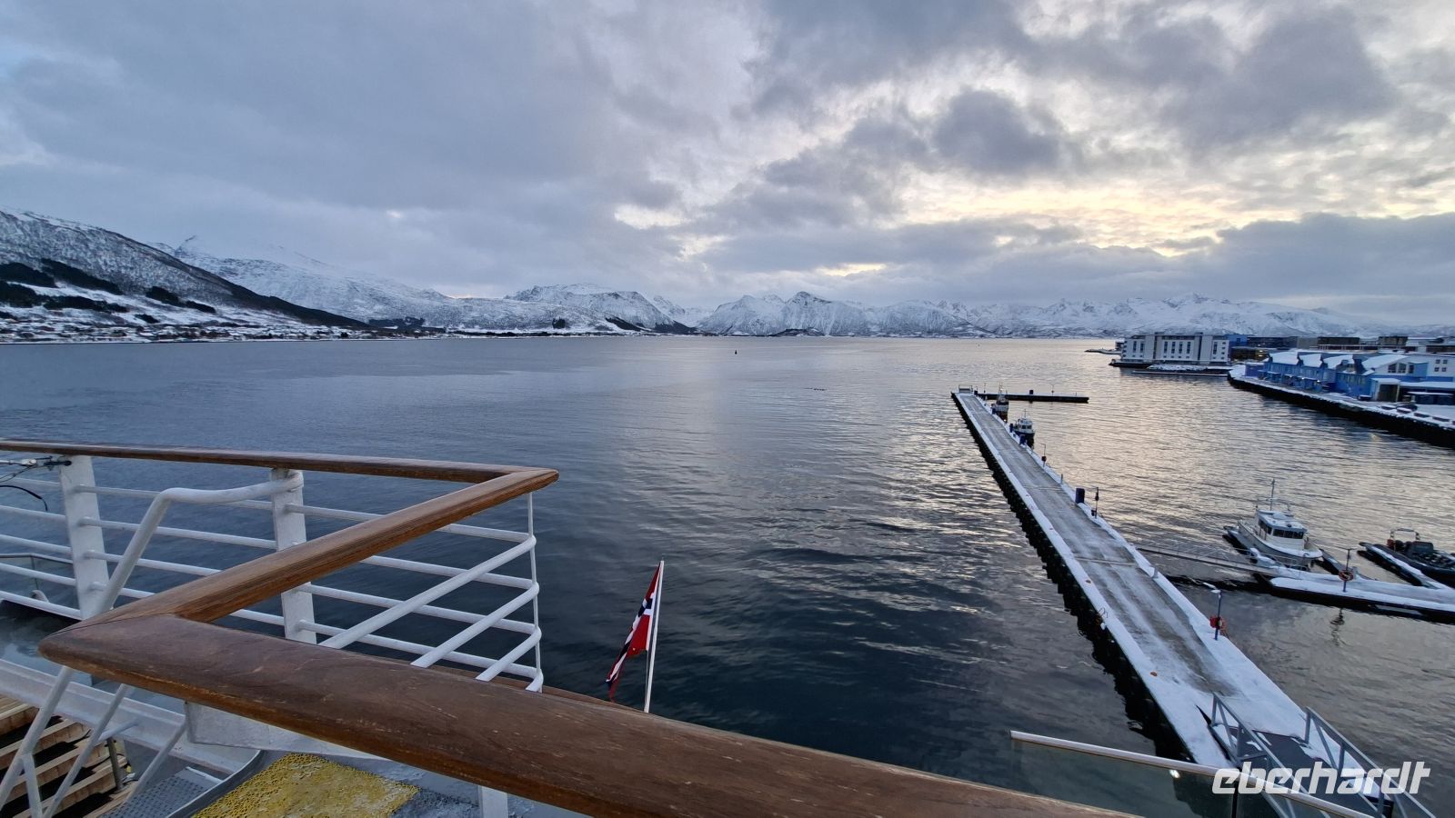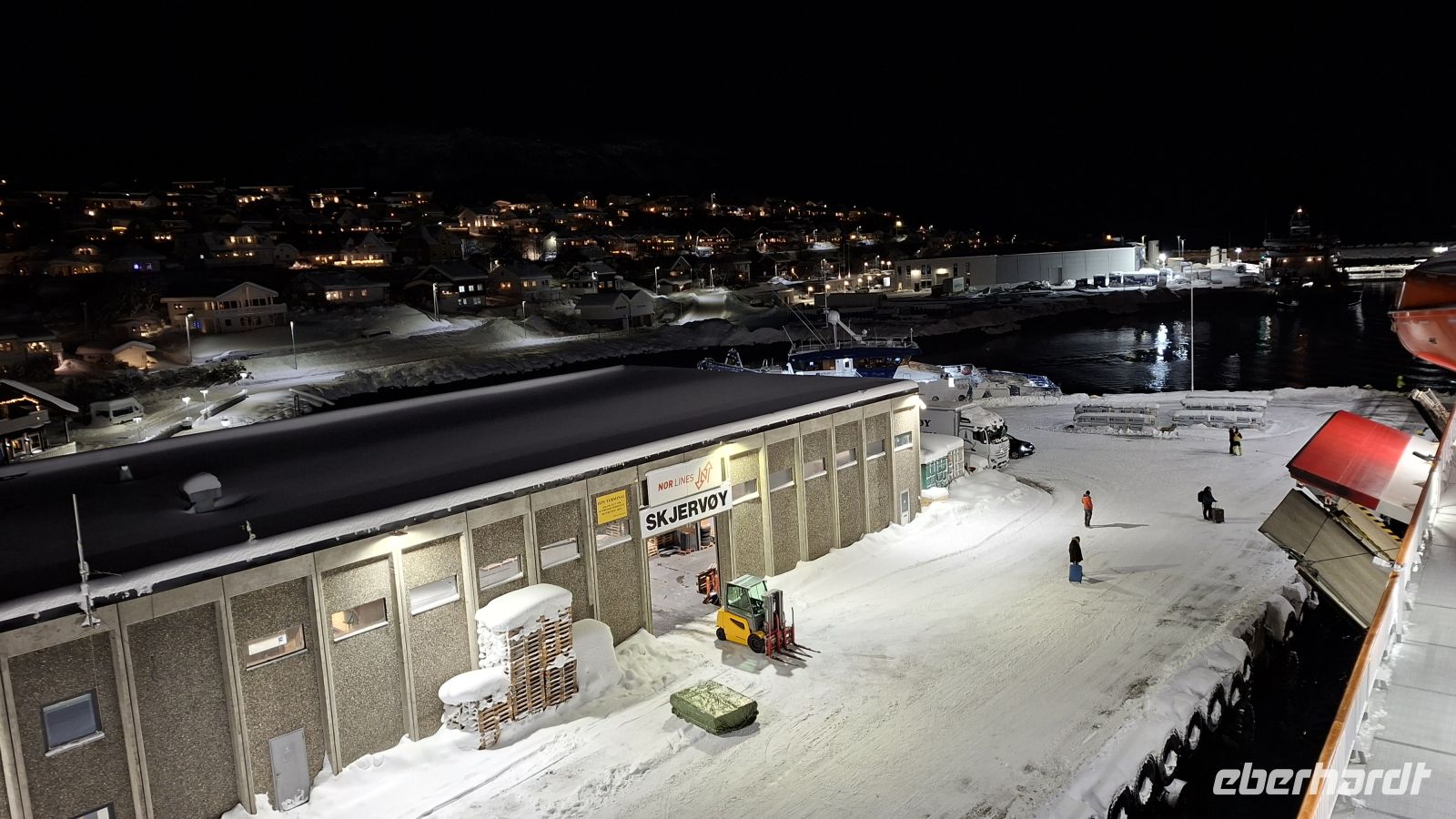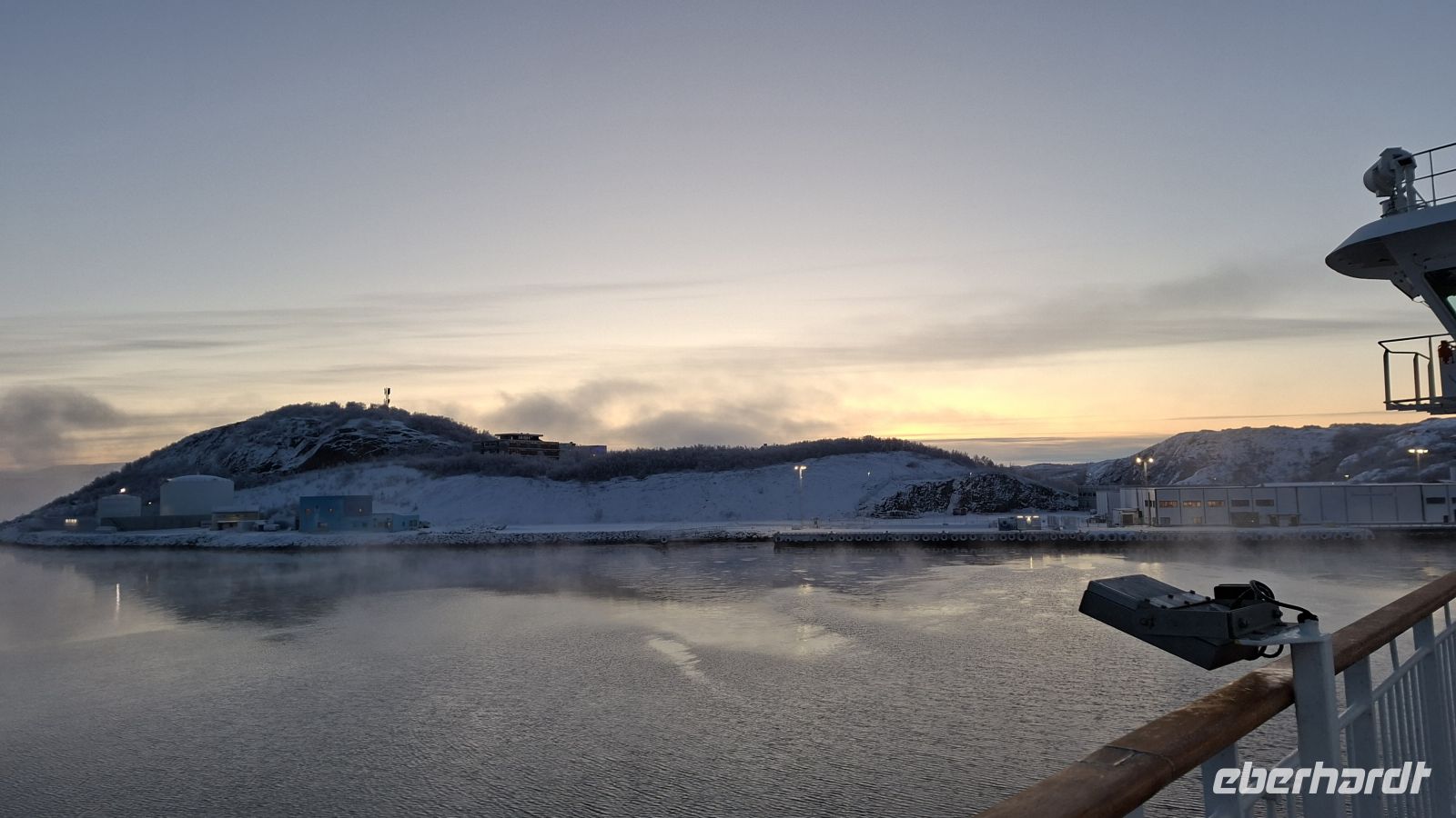 In Vardø hatten wir später kurz Zeit, uns an Land die Füße zu vertreten. Ein kleiner Rundgang durch die verschneiten Straßen, frische Luft tief einatmen, einmal drehen, alles aufsaugen – und schon ging es weiter.