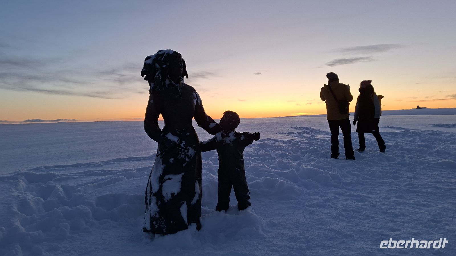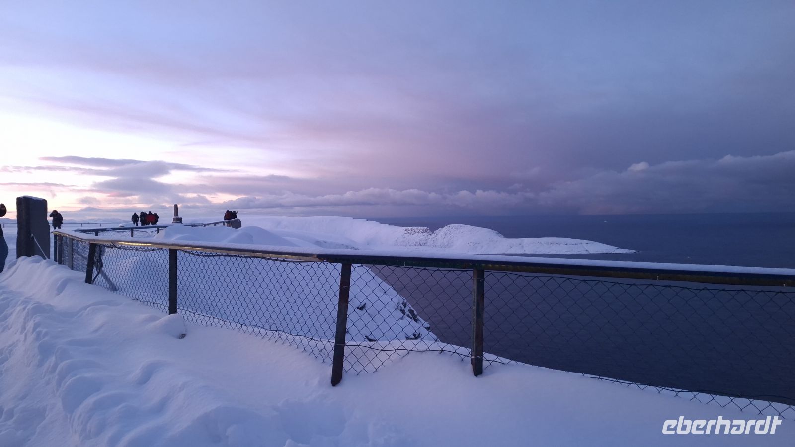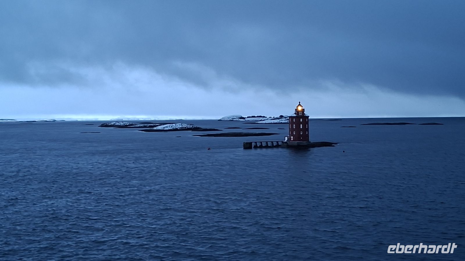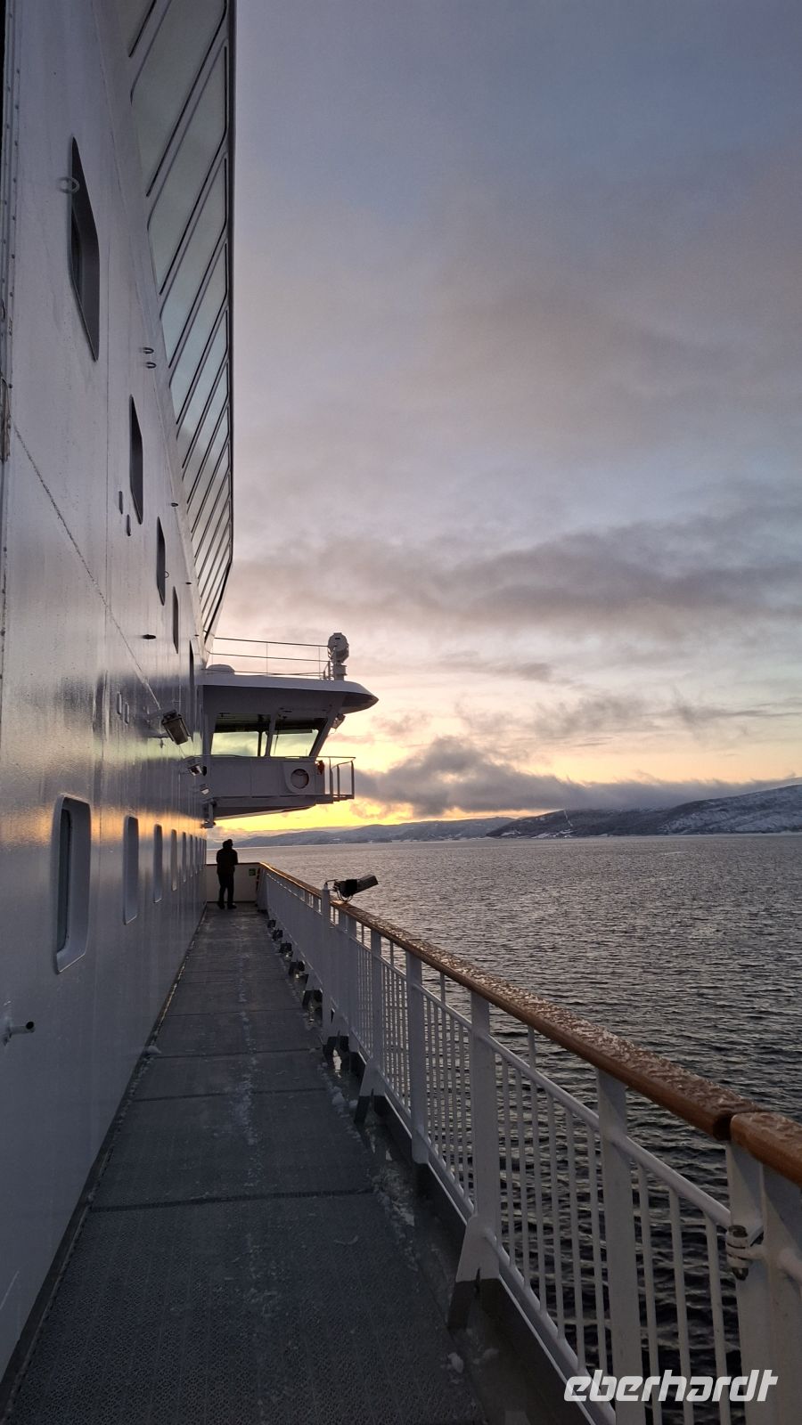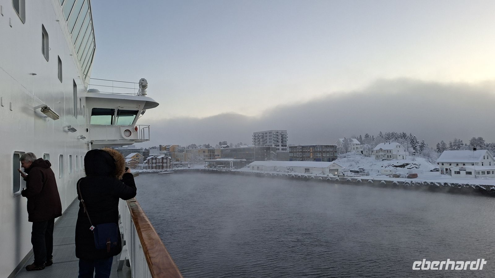In Vardø hatten wir später kurz Zeit, uns an Land die Füße zu vertreten. Ein kleiner Rundgang durch die verschneiten Straßen, frische Luft tief einatmen, einmal drehen, alles aufsaugen – und schon ging es weiter.